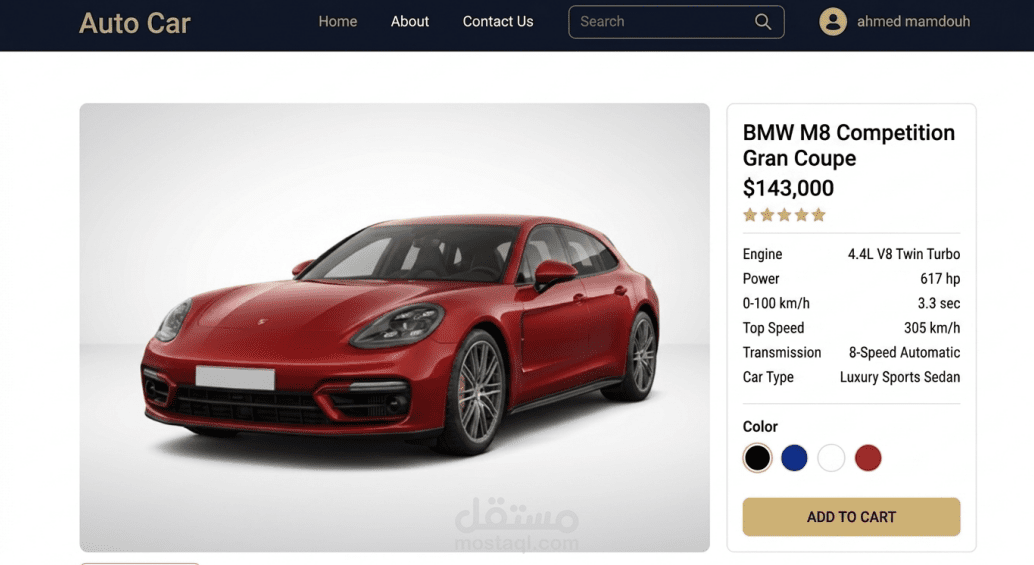 عرض مفصل للسيارات: صفحات مخصصة لكل سيارة تتضمن الصور، المواصفات الفنية، الألوان المتاحة، والسعر.