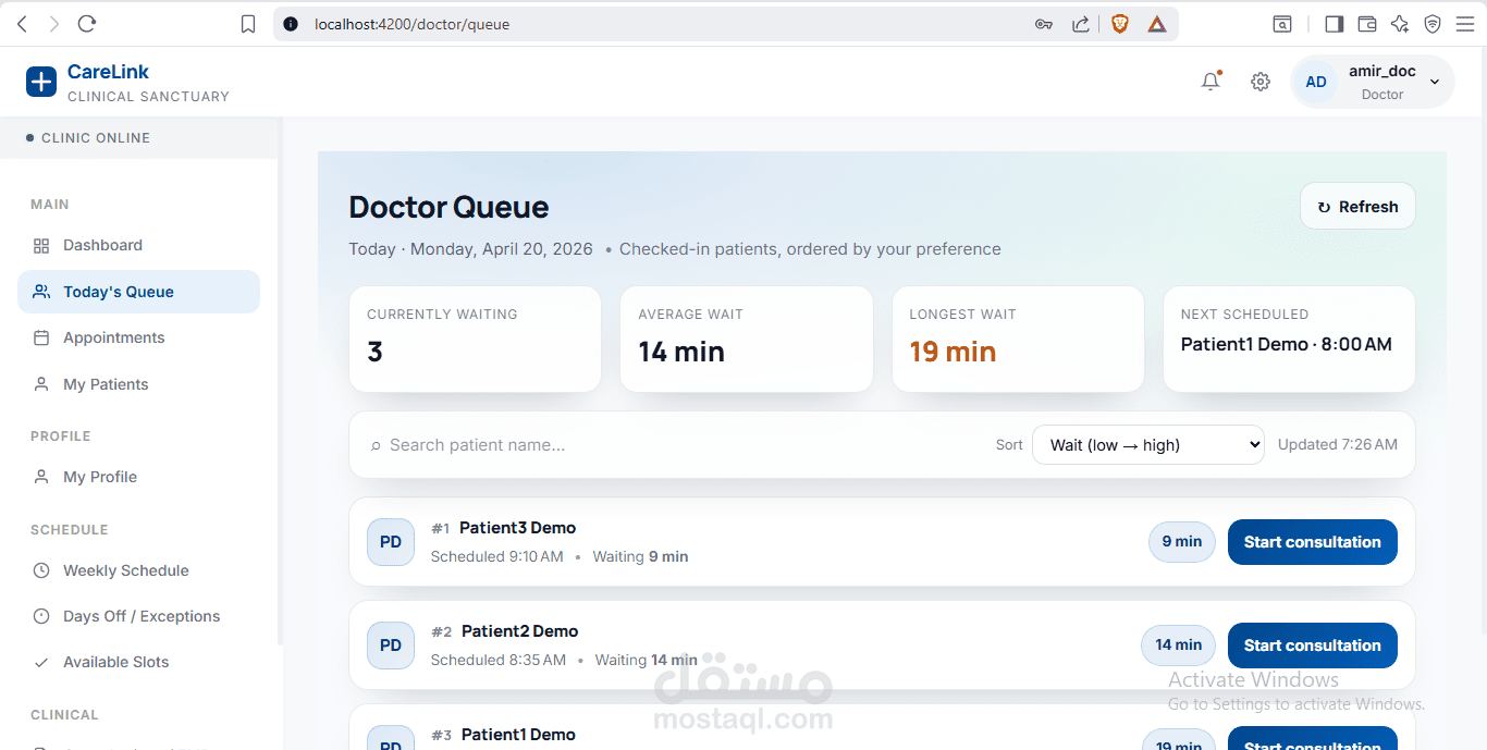 Doctor Queue: Live waiting room management with Wait-Time tracking.