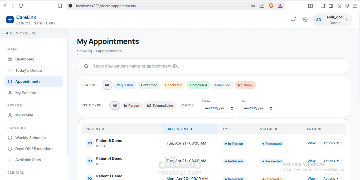 Appointment Lifecycle: End-to-end status tracking (Requested to Completed).