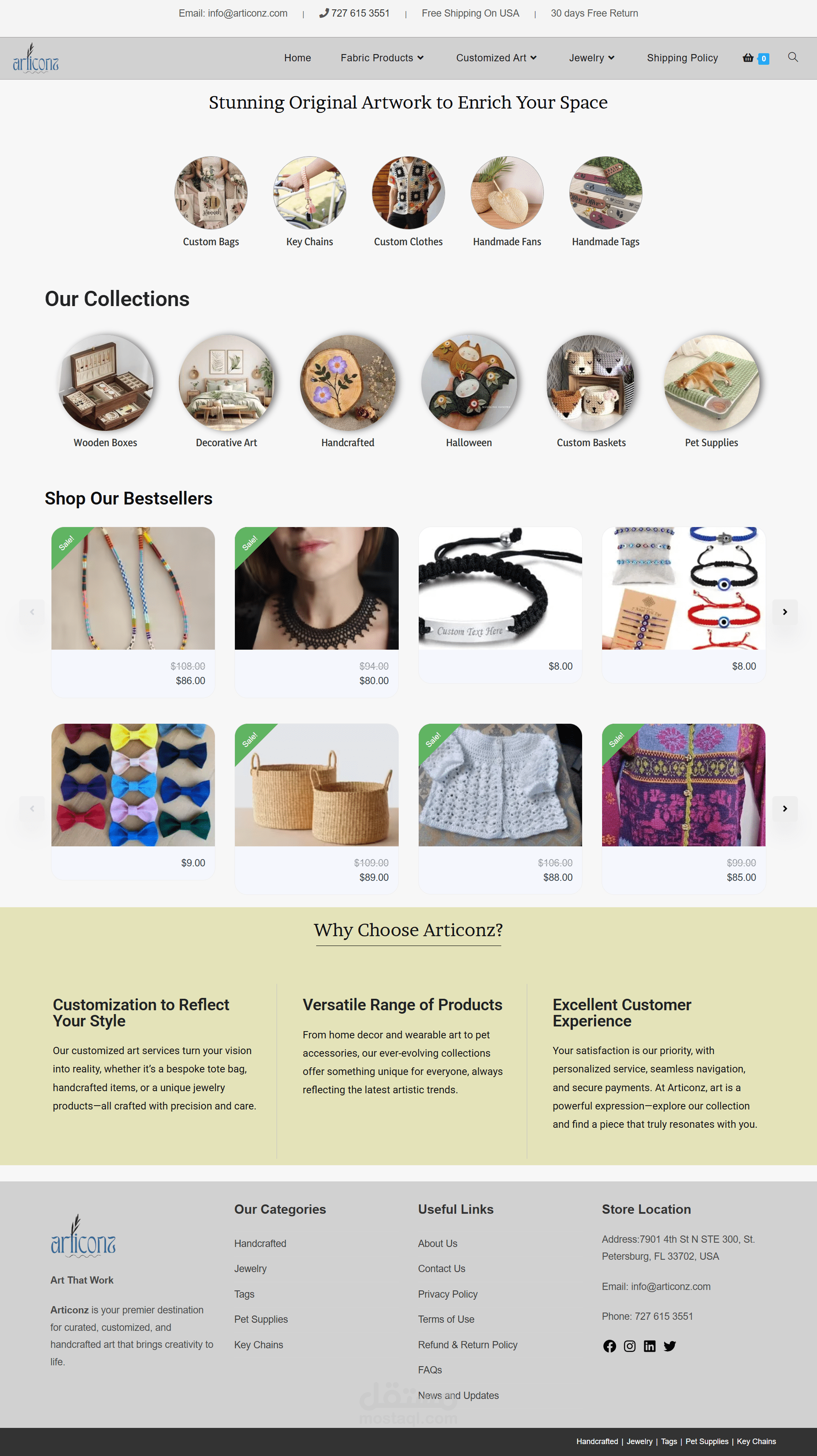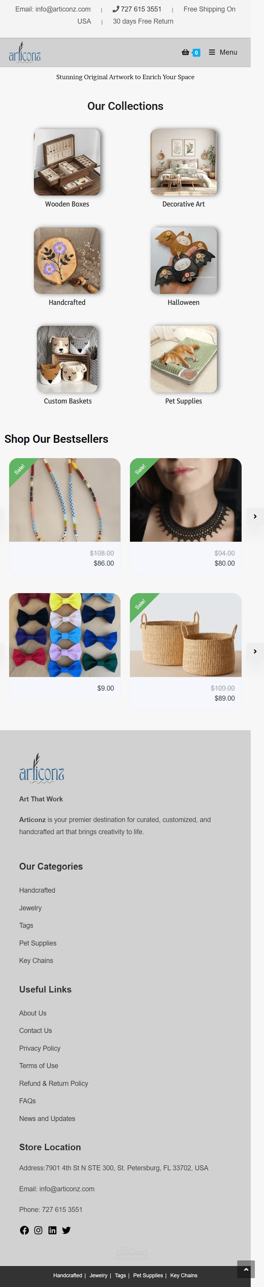 Designed and developed a fully responsive e-commerce website for Articonz, a U.S.-based online store specializing in handcrafted art, custom jewelry, wooden boxes, pet supplies, and decorative items. Built on WordPress and WooCommerce with a clean, elegant layout featuring circular category displays, bestseller product sliders, promotional banners, and a "Why Choose Us" section. The site includes a fully structured footer with category links, store location, and social media integration. Optimized for mobile responsiveness and on-page SEO including meta tags, alt text, and fast-loading images to improve organic search visibility.