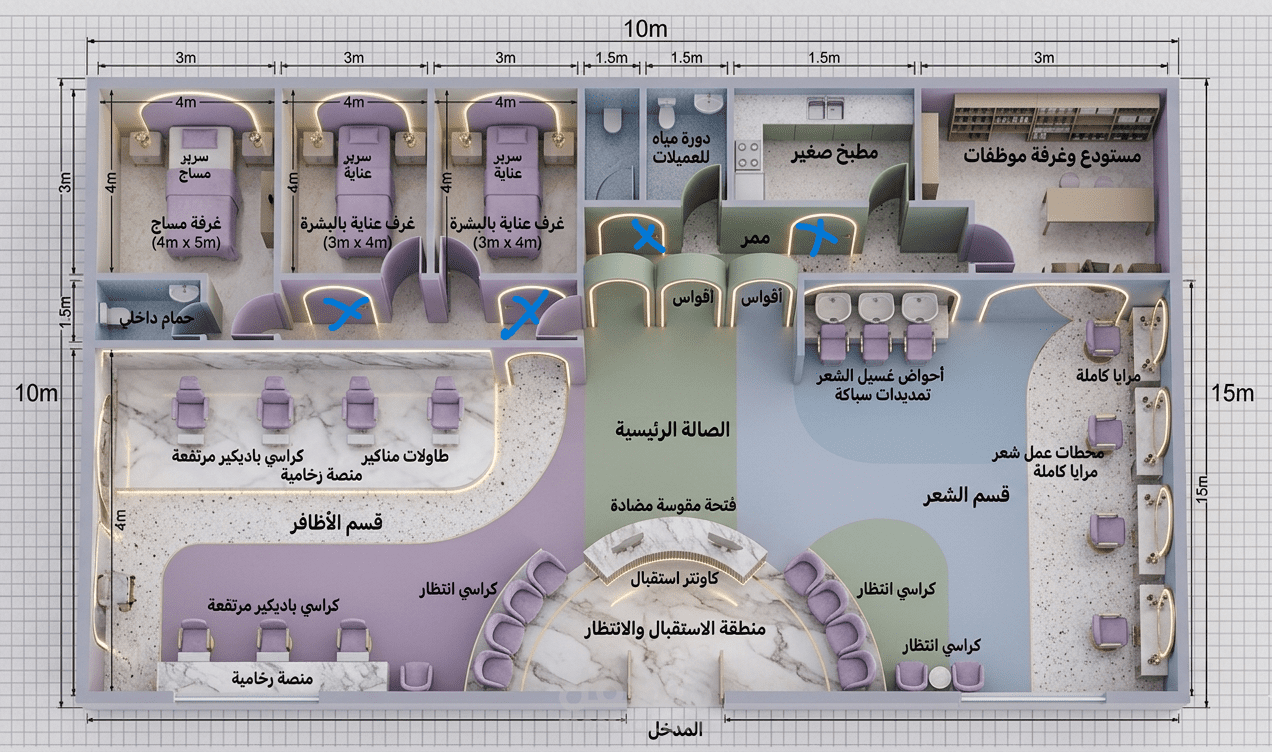 I designed this comprehensive floor plan for a high-end Beauty & Spa Center, covering a total area of 150 sqm. My primary focus was to create a luxurious environment that ensures a seamless operational flow while maintaining maximum privacy for clients.Key Design Highlights:Zonal Layout: The space is strategically divided into specialized departments: a high-capacity Hair Styling section, a dedicated Nail & Pedicure wing featuring marble platforms, and a quiet zone for Massage and Skincare.The Welcome Experience: The entrance leads to a central hall featuring a modern, curved illuminated reception counter and comfortable waiting lounges, designed to provide an immediate sense of hospitality.Private Treatment Suites: I included a large Massage Room (20sqm) with a private ensuite bathroom, alongside two specialized Skincare rooms, ensuring a peaceful atmosphere away from the busier salon areas.Efficiency & Support: The plan incorporates professional hair-wash stations with optimized plumbing, a staff kitchenette, and a large storage/staff room to maintain a clutter-free environment.Architectural Details: Use of decorative arches and a central corridor system to enhance the aesthetic appeal and organize movement within the center.