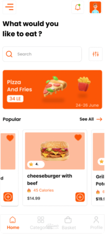 There's a quick search bar if you're looking for something specific, and it also displays attractive offers like pizza and fries that make you want to try them. Below that, there's a section for popular dishes, showing people's choices with ratings and prices, making it easier for you to decide.