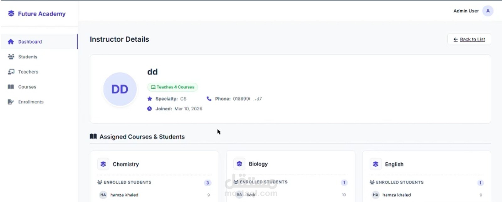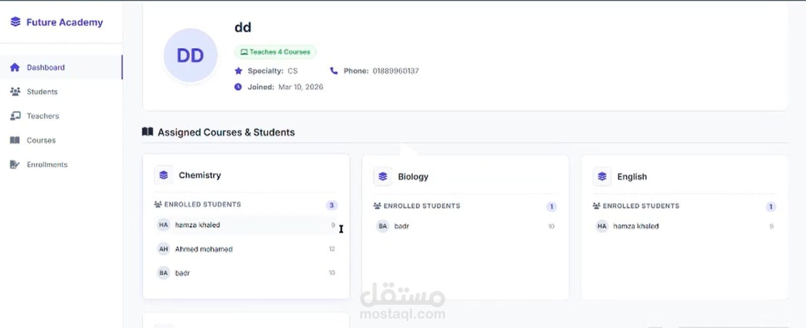 لوحة تحكم المعلم (Instructor Dashboard): تفصيل دقيق يوضح لكل معلم المواد التي يدرسها، مع عرض قوائم بأسماء الطلاب المسجلين معه في كل مادة على حدة لتسهيل متابعة الحضور والغياب.