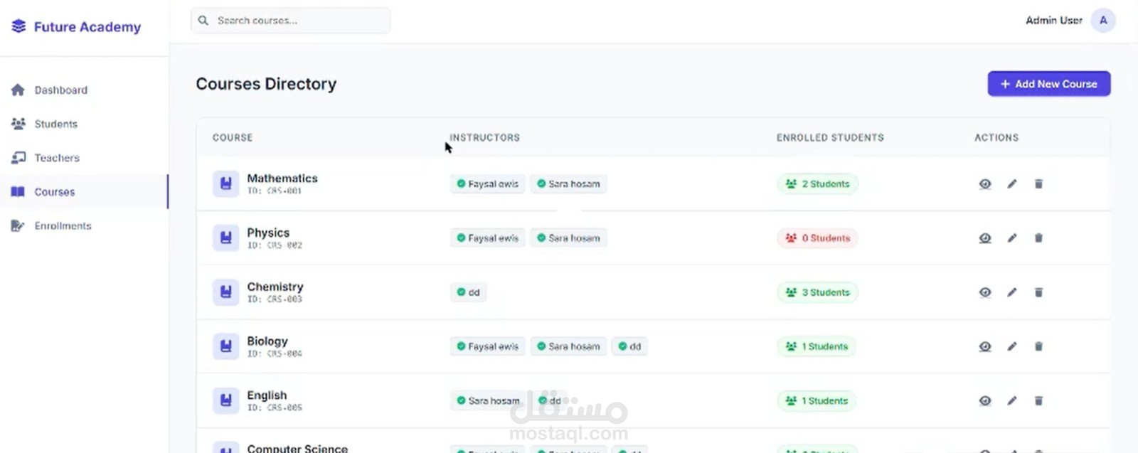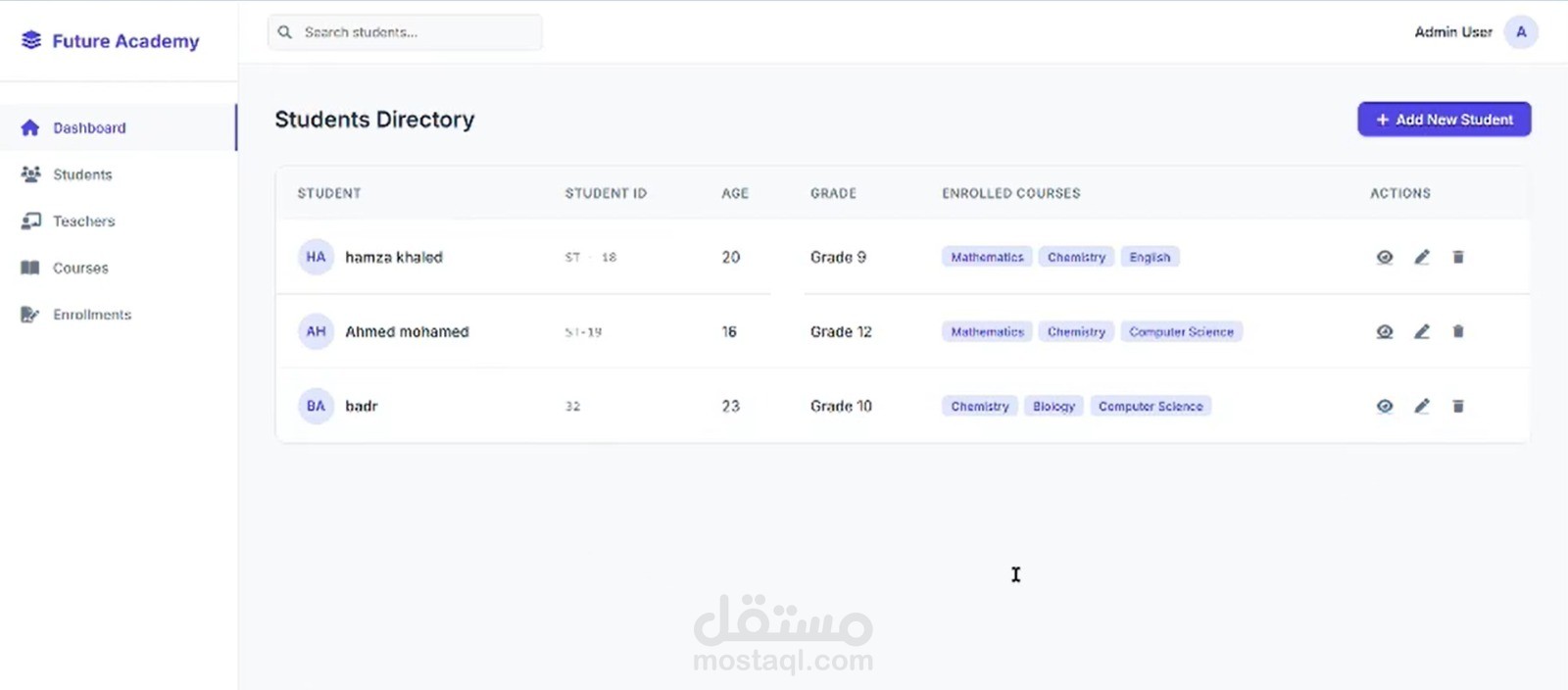 ظام إدارة تعليمي متكامل (LMS) ولوحة تحكم مركزية (Admin Dashboard) مصممة خصيصاً للمدارس، الأكاديميات، ومراكز الدروس الخصوصية (Future Academy). يهدف النظام إلى رقمنة العملية الإدارية بالكامل من خلال خلق بيئة مترابطة بذكاء تجمع بين (الطلاب، المعلمين، والمواد الدراسية). يوفر النظام تجربة مستخدم سلسة لإدارة التسجيلات، تتبع كثافة الفصول، وتوزيع المهام الأكاديمية بكفاءة عالية.