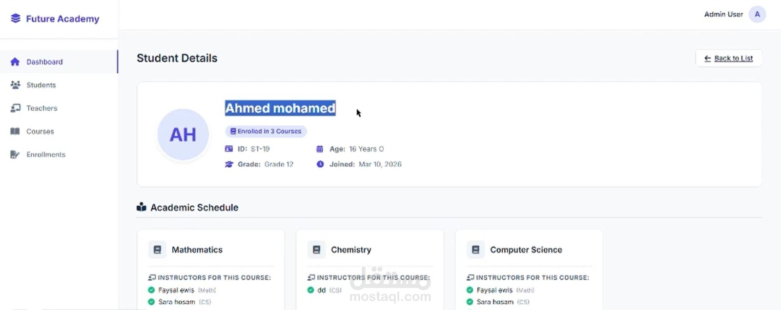ملف تعريفي شامل (Student Profile): لكل طالب صفحة مخصصة تعرض جدوله الأكاديمي، المواد التي يدرسها، وتحدد تلقائياً أسماء المعلمين المسؤولين عن تدريسه في كل مادة.
