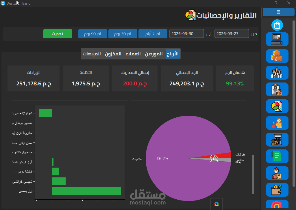 تقارير مبيعات ومخزون وأرباح قابلة للطباعة، مع نسخ احتياطي واستعادة لقاعدة البيانات، ومزامنة سحابية عبر Firebase.