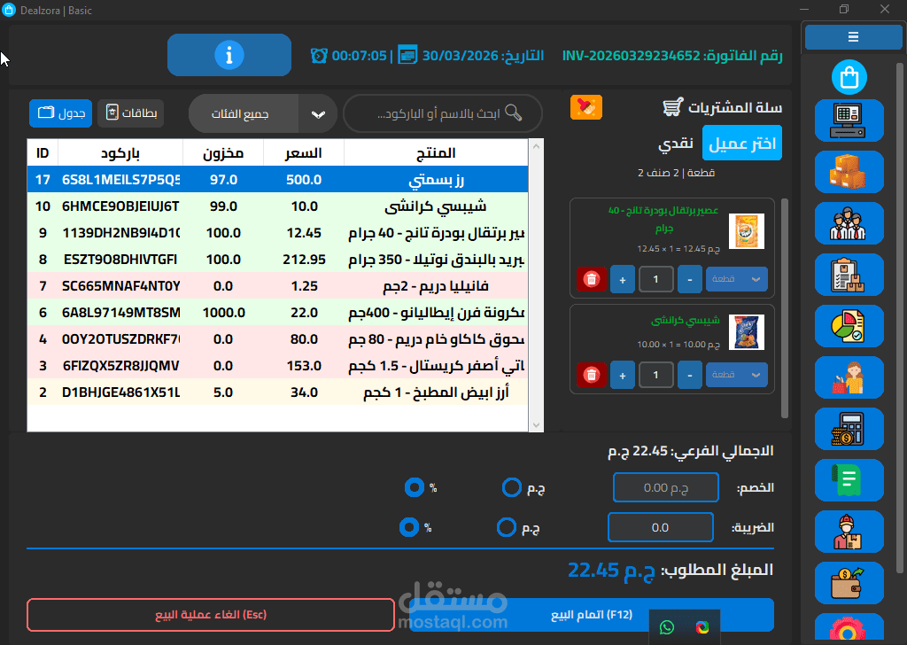 يتضمن النظام لوحة POS كاملة مع إدارة جلسات الكاشير وأجهزته، وفواتير المبيعات والمرتجعات، وعروض الأسعار والخصومات، مع دعم الطباعة الحرارية وA4 وطباعة الباركود مباشرة.