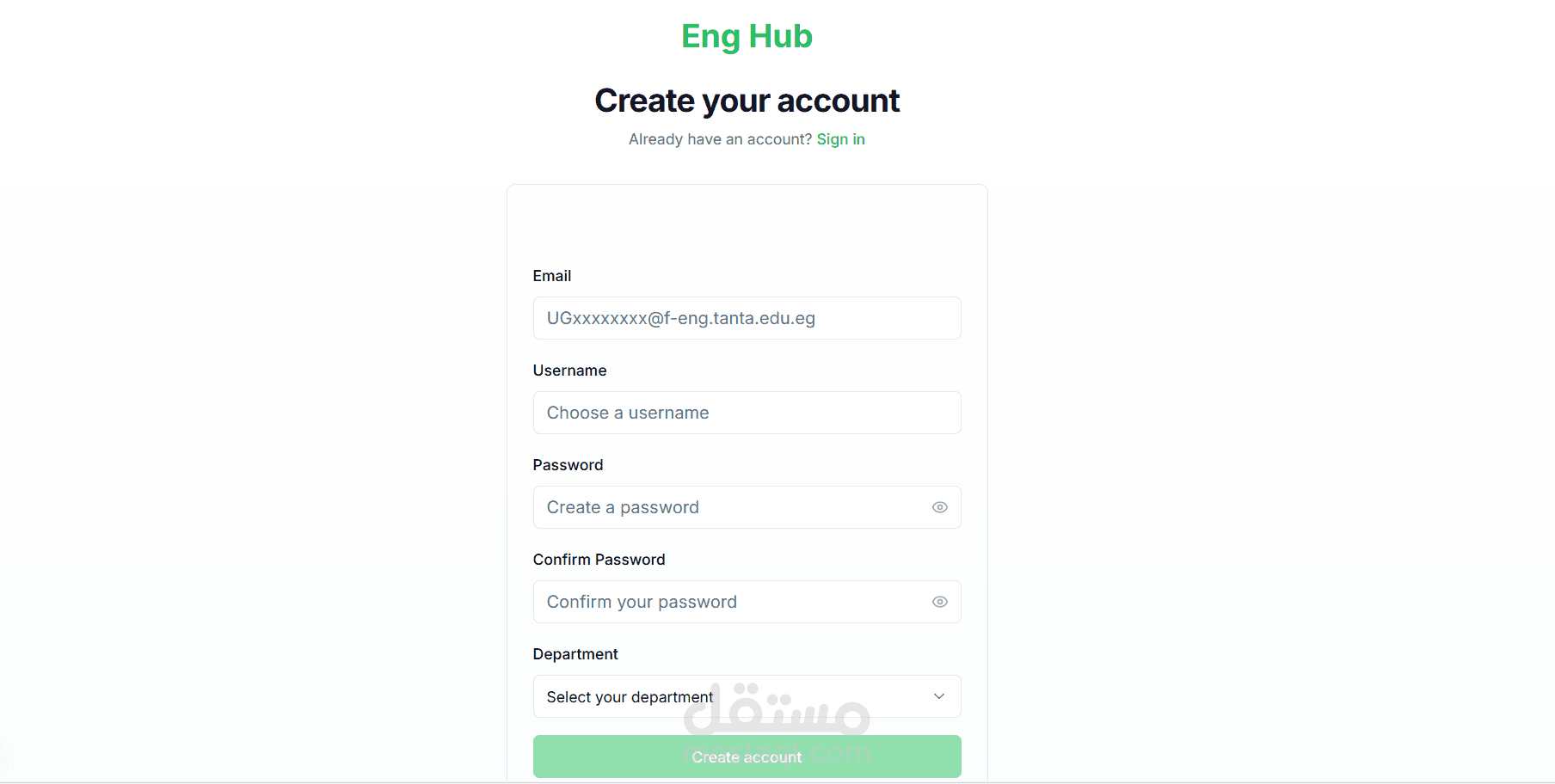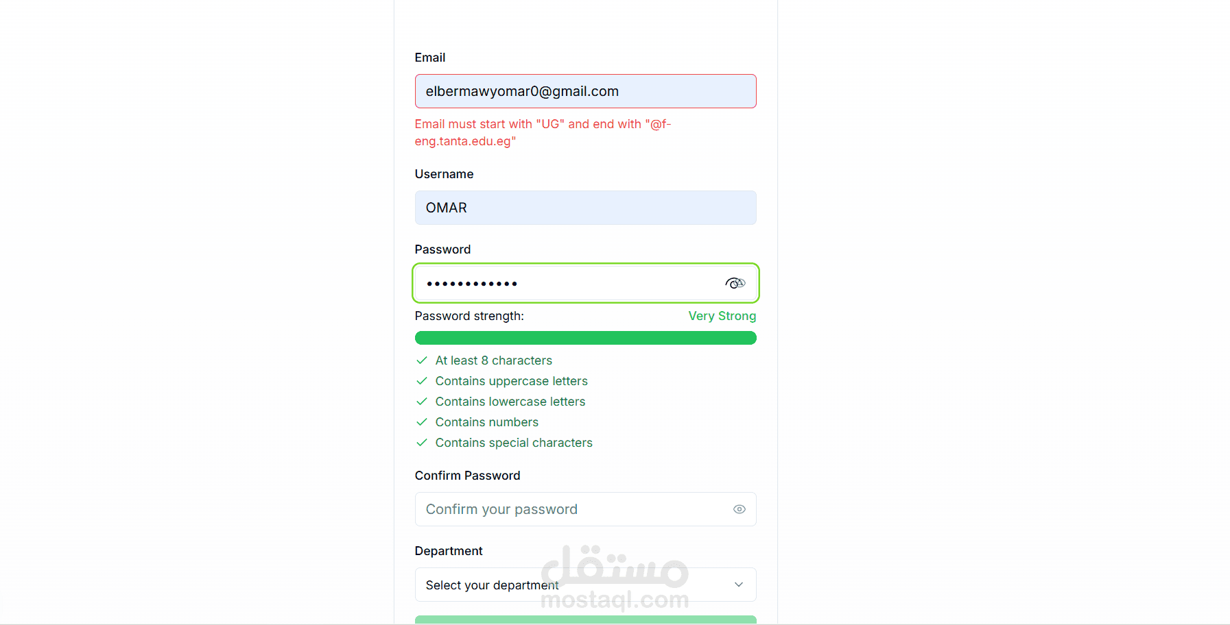 Registration is restricted to official university emails (UGxxxxxxxx@f-eng.tanta.edu.eg), ensuring the platform remains exclusive to enrolled students. Includes real-time password strength validation.