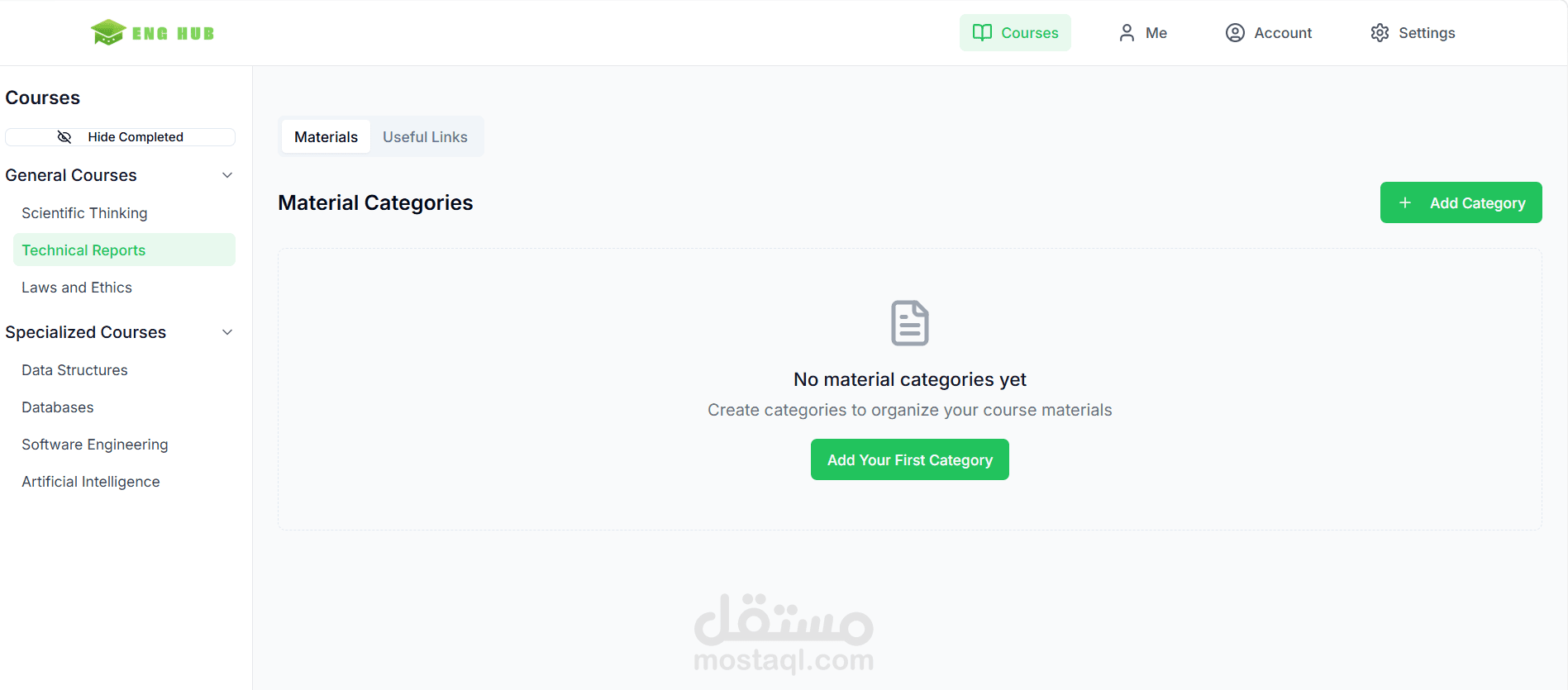 Students can browse General and Specialized courses (Data Structures, Databases, Software Engineering, AI, etc.), access organized material categories, and save useful links — all in one place.