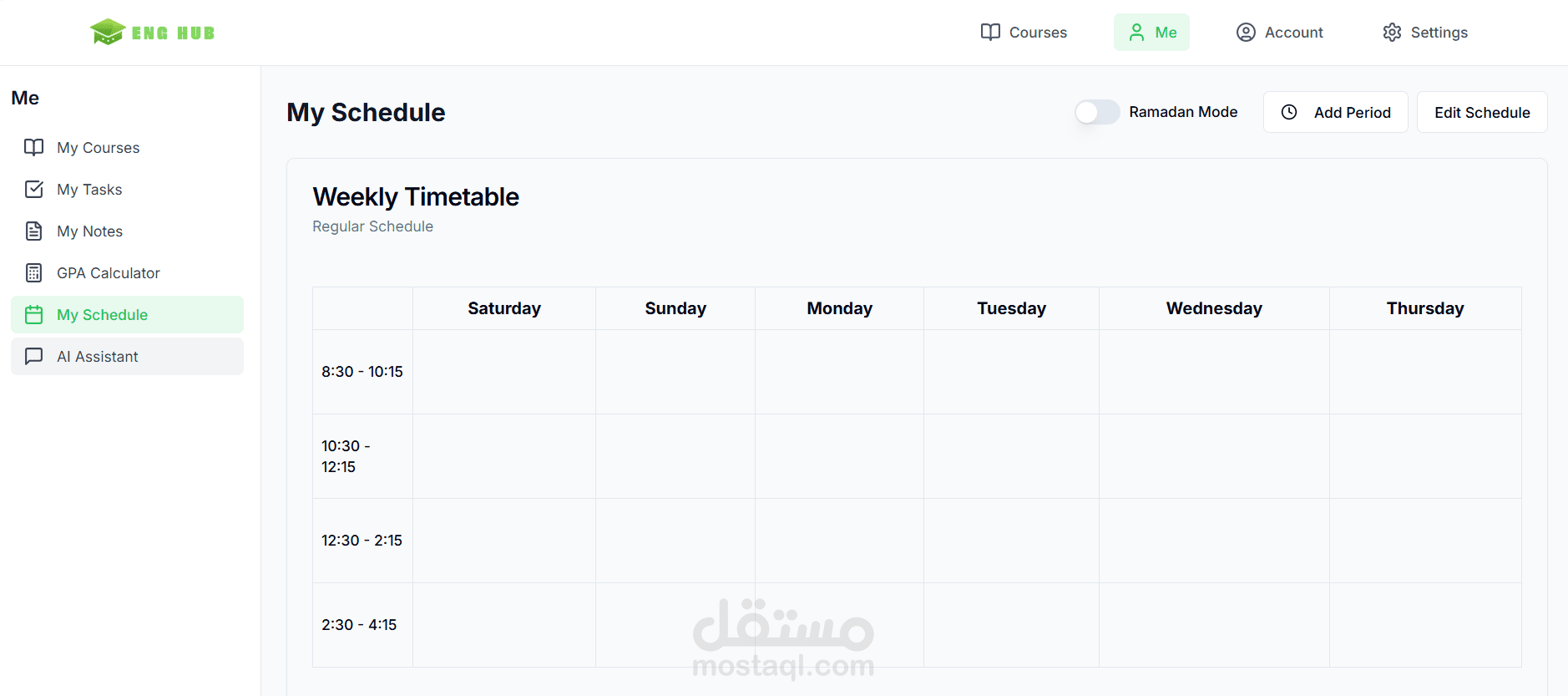 A visual weekly timetable tailored to the Egyptian university schedule (Saturday–Thursday), with an Add Period feature and a special Ramadan Mode toggle.