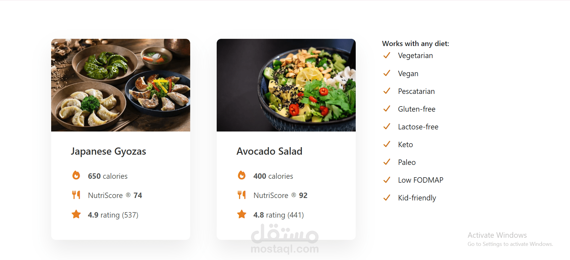 Interactive Components: بناء بطاقات الوجبات (Meal Cards) التي تعرض البيانات الحيوية (Calories, NutriScore) بشكل منظم، مع معرض صور (Gallery) تفاعلي وجذاب.