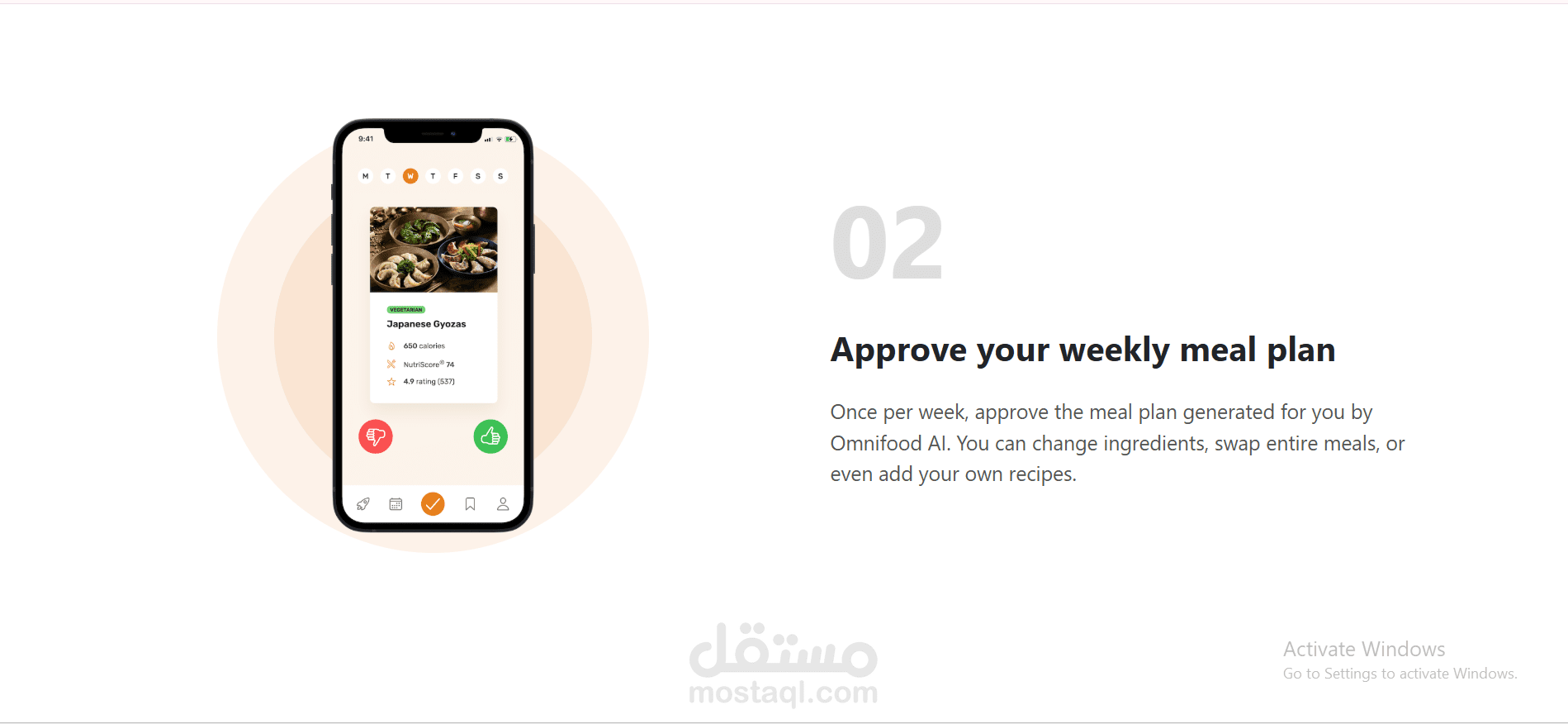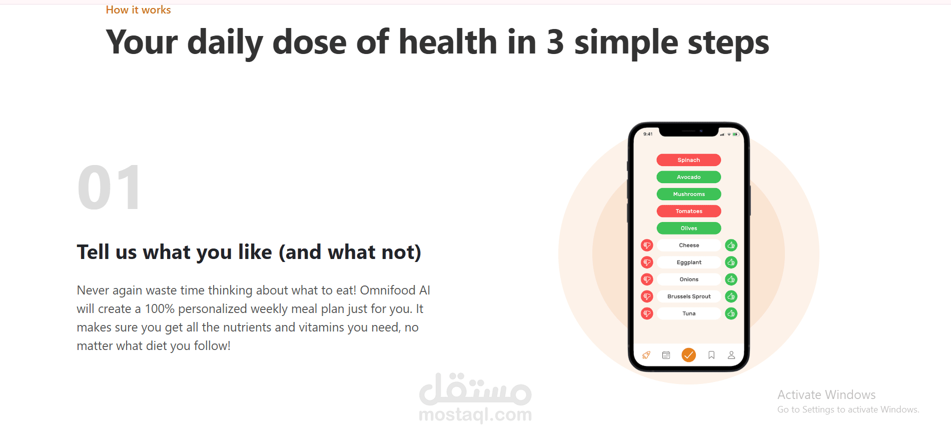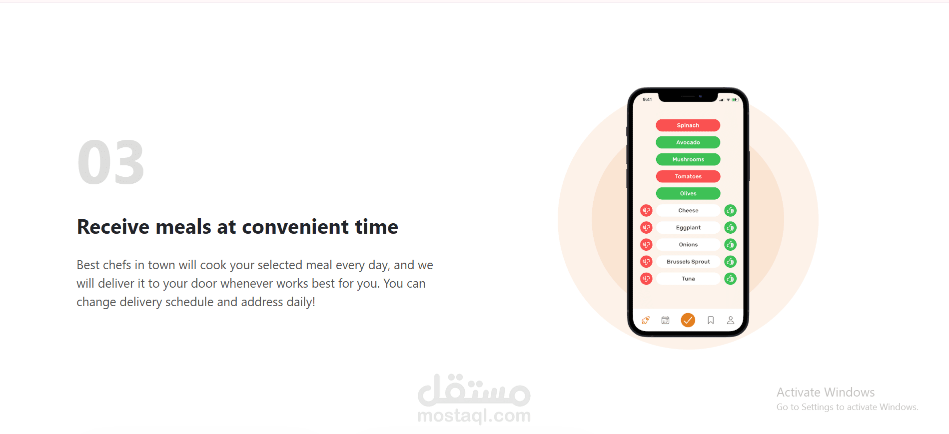 User Experience (UX): تنفيذ رحلة مستخدم واضحة مقسمة لـ 3 خطوات (Tell us what you like -> Approve meal plan -> Receive meals) لتبسيط عملية التسجيل.