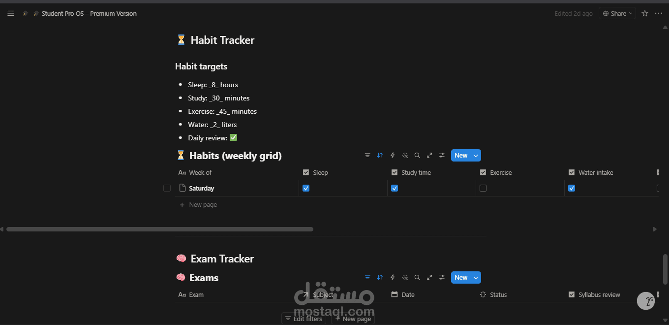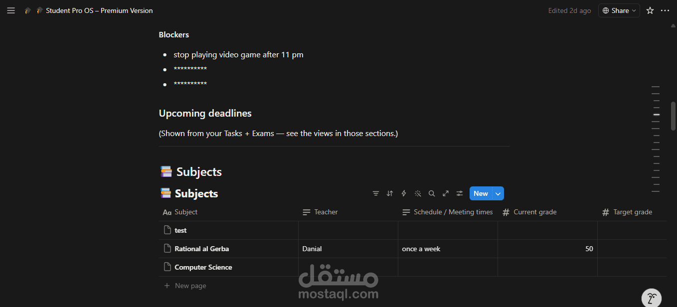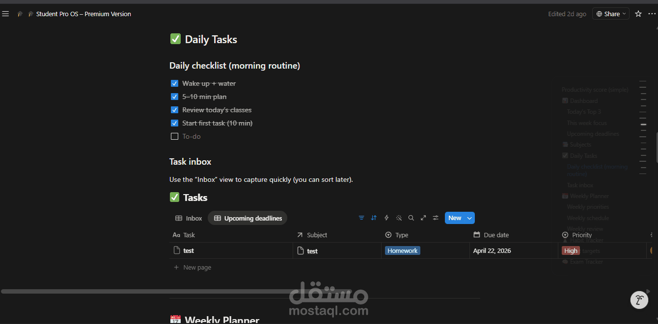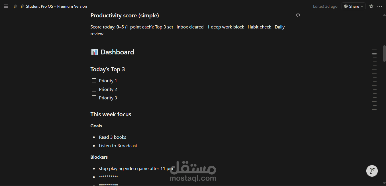 هذا المشروع هو نظام متكامل لإدارة حياة الطالب تم إنشاؤه باستخدام Notion، ويهدف إلى مساعدة الطلاب على تنظيم دراستهم وزيادة الإنتاجية بطريقة سهلة وفعّالة.