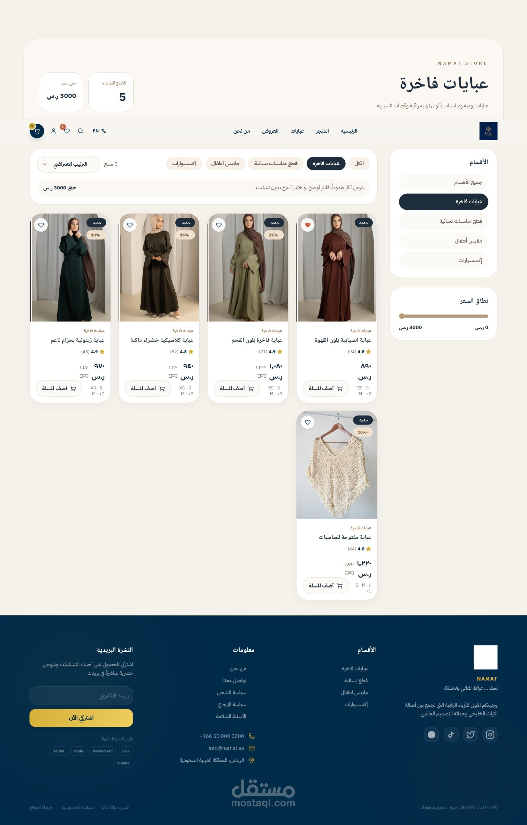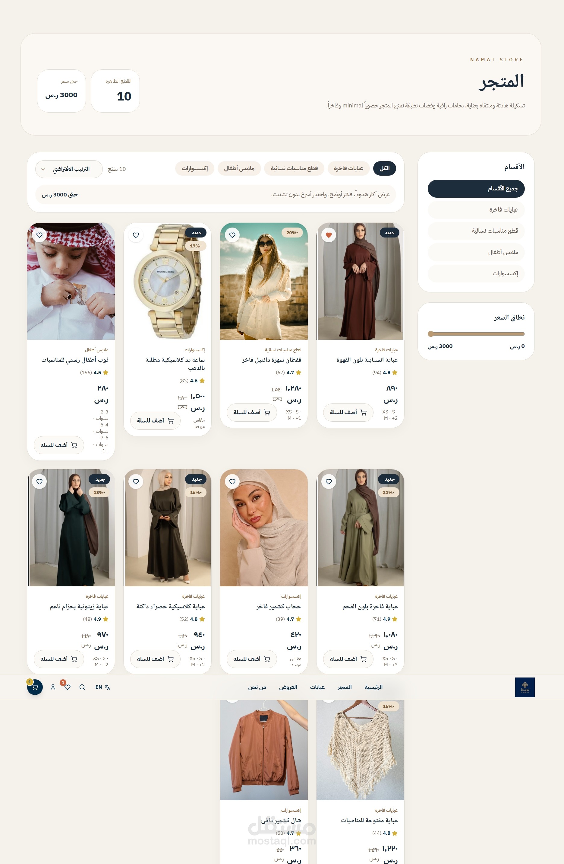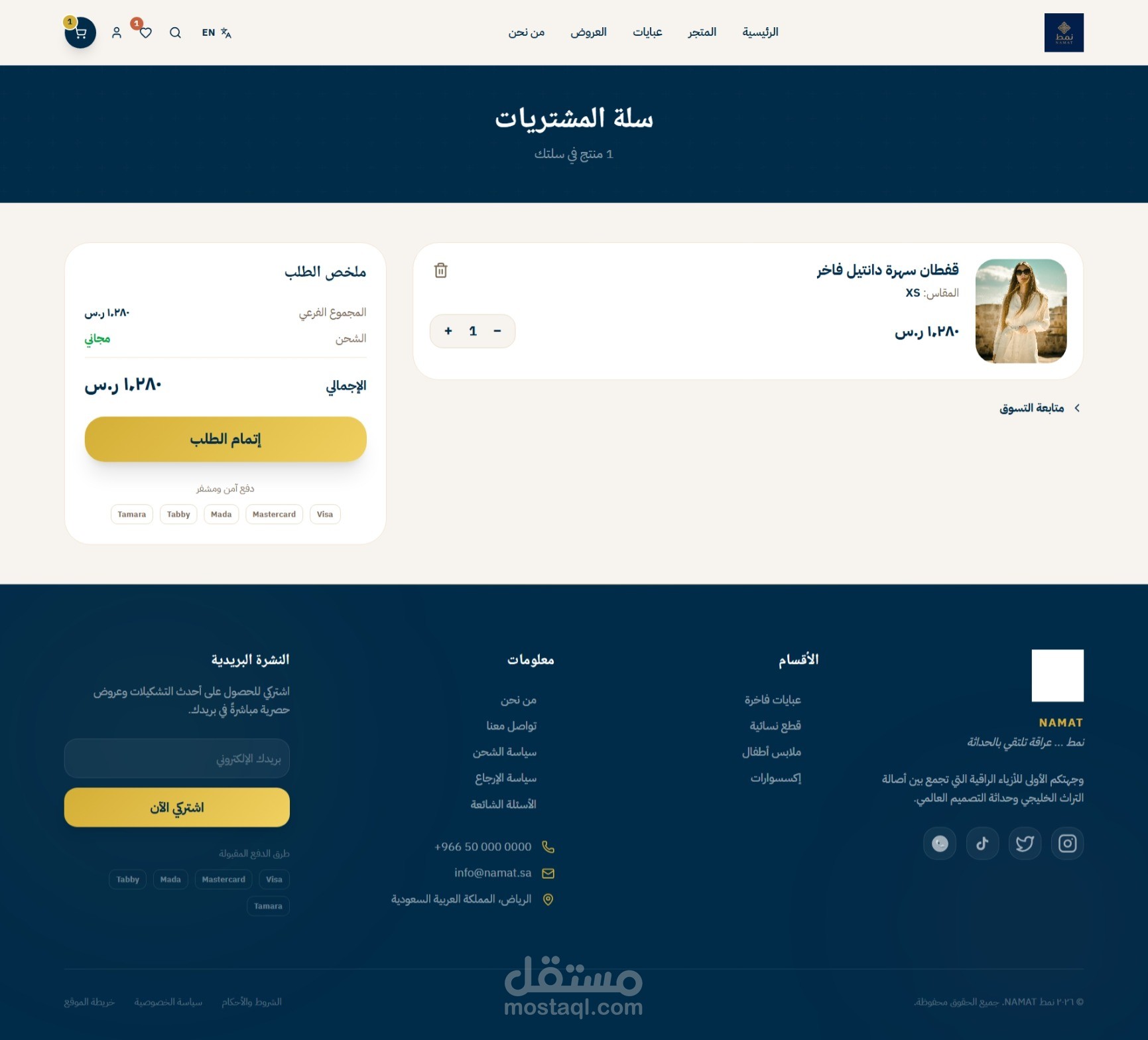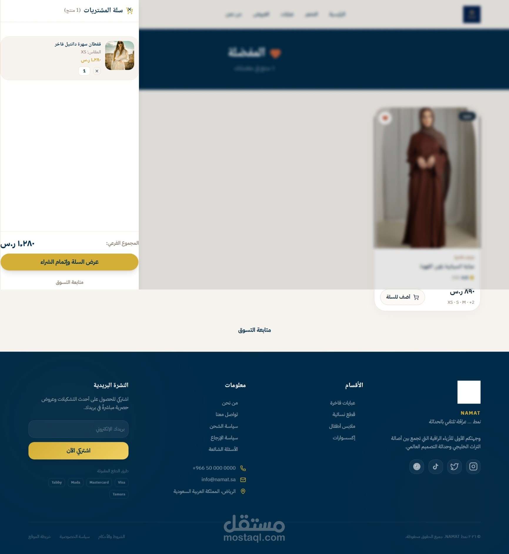 نمط (NAMAT) هو منصة تسوق إلكترونية متطورة متخصصة في الأزياء الراقية (عبايات، قفاطين، ملابس أطفال). يجمع المشروع بين أصالة التراث الخليجي وحداثة التصميم العالمي، مع تجربة مستخدم سلسة تدعم اللغتين العربية والإنجليزية بشكل كامل.