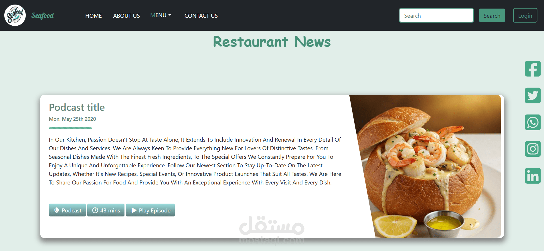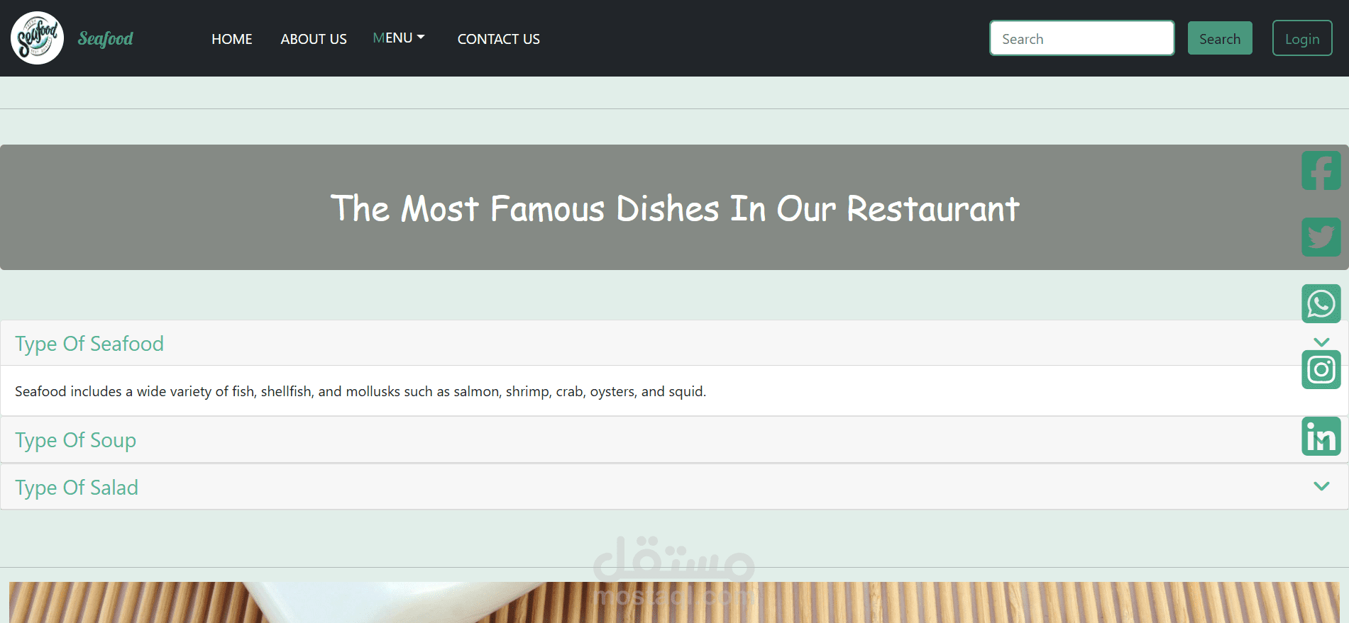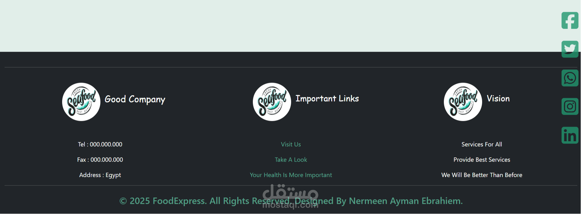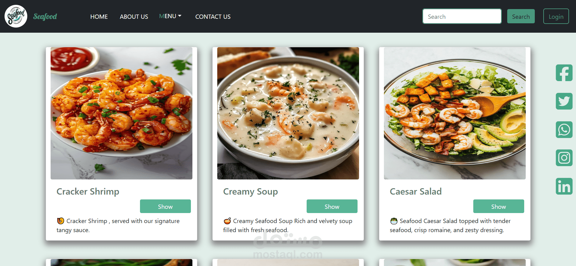 Landing Page ل بشمهندسه نرمين أيمن لمطعم سي فود تم تصميمها لتقديم تجربة بصرية جذابة تعكس جودة الطعام وطزاجة المأكولات البحرية. ركز المشروع على عرض الأطباق المميزة بشكل جذاب يساعد المستخدم على اتخاذ قرار سريع.