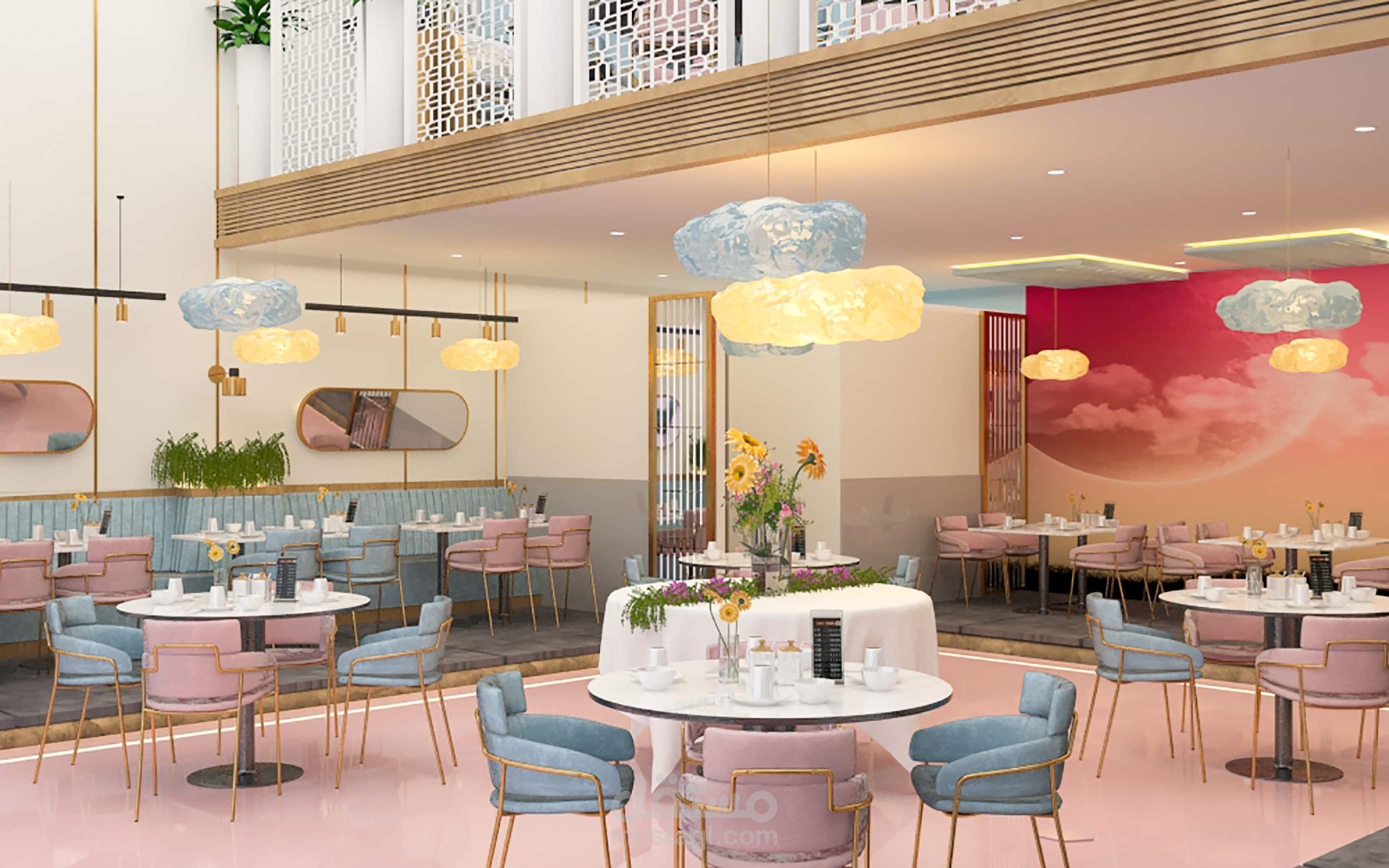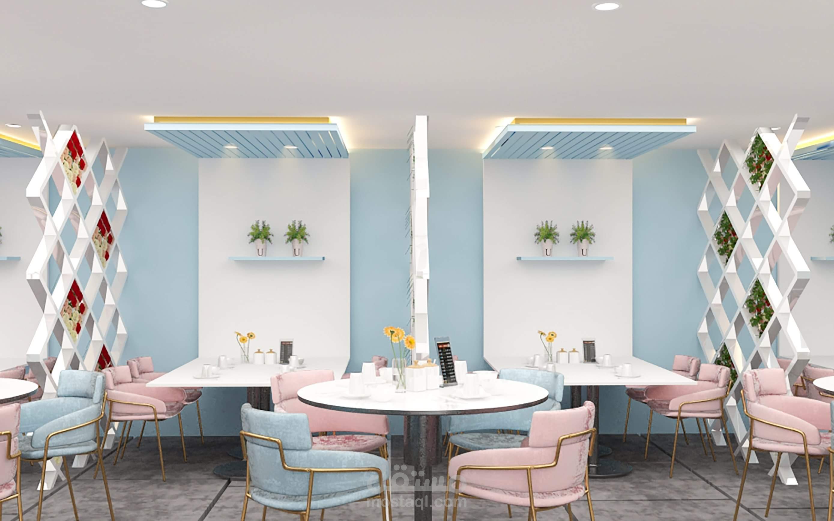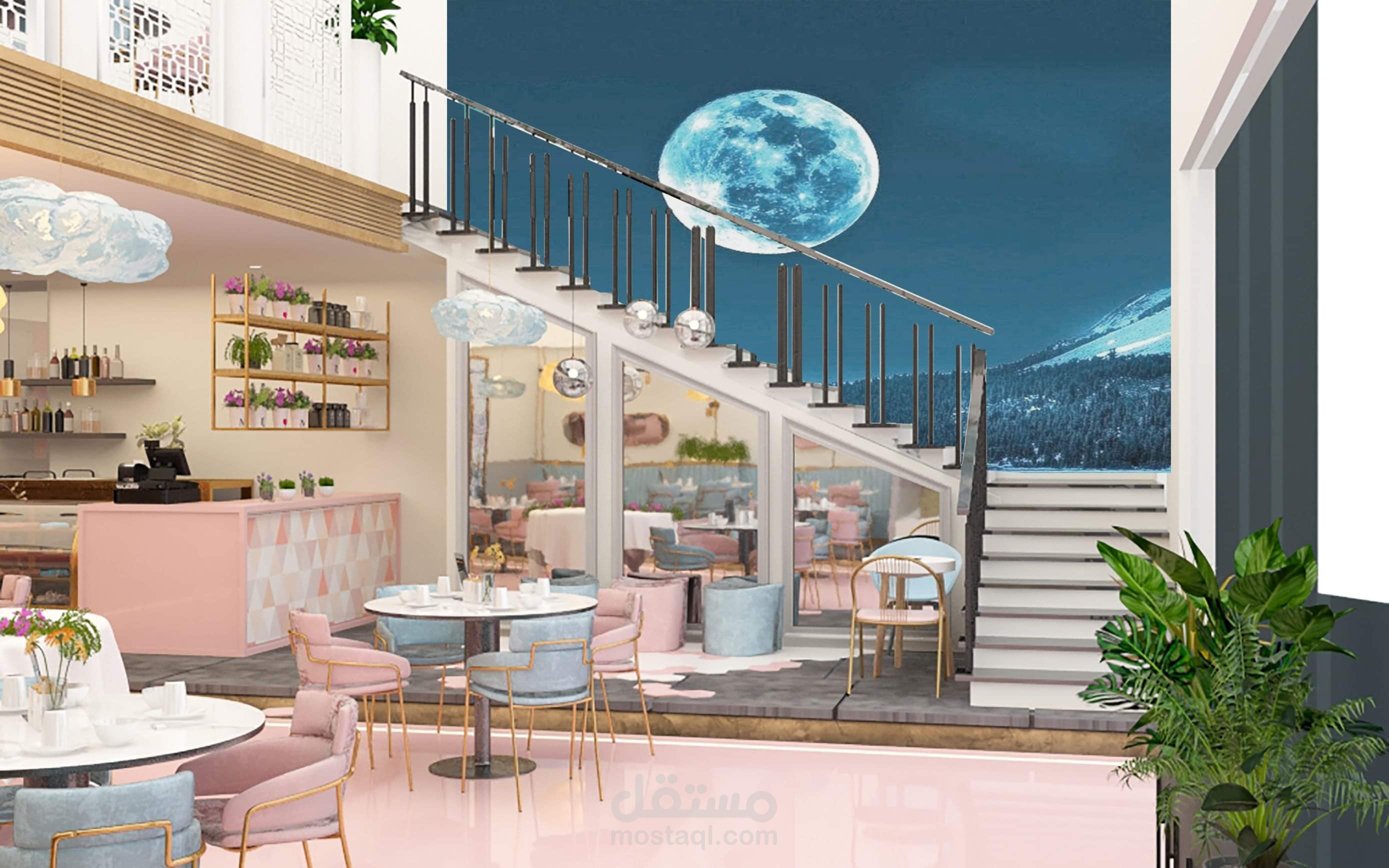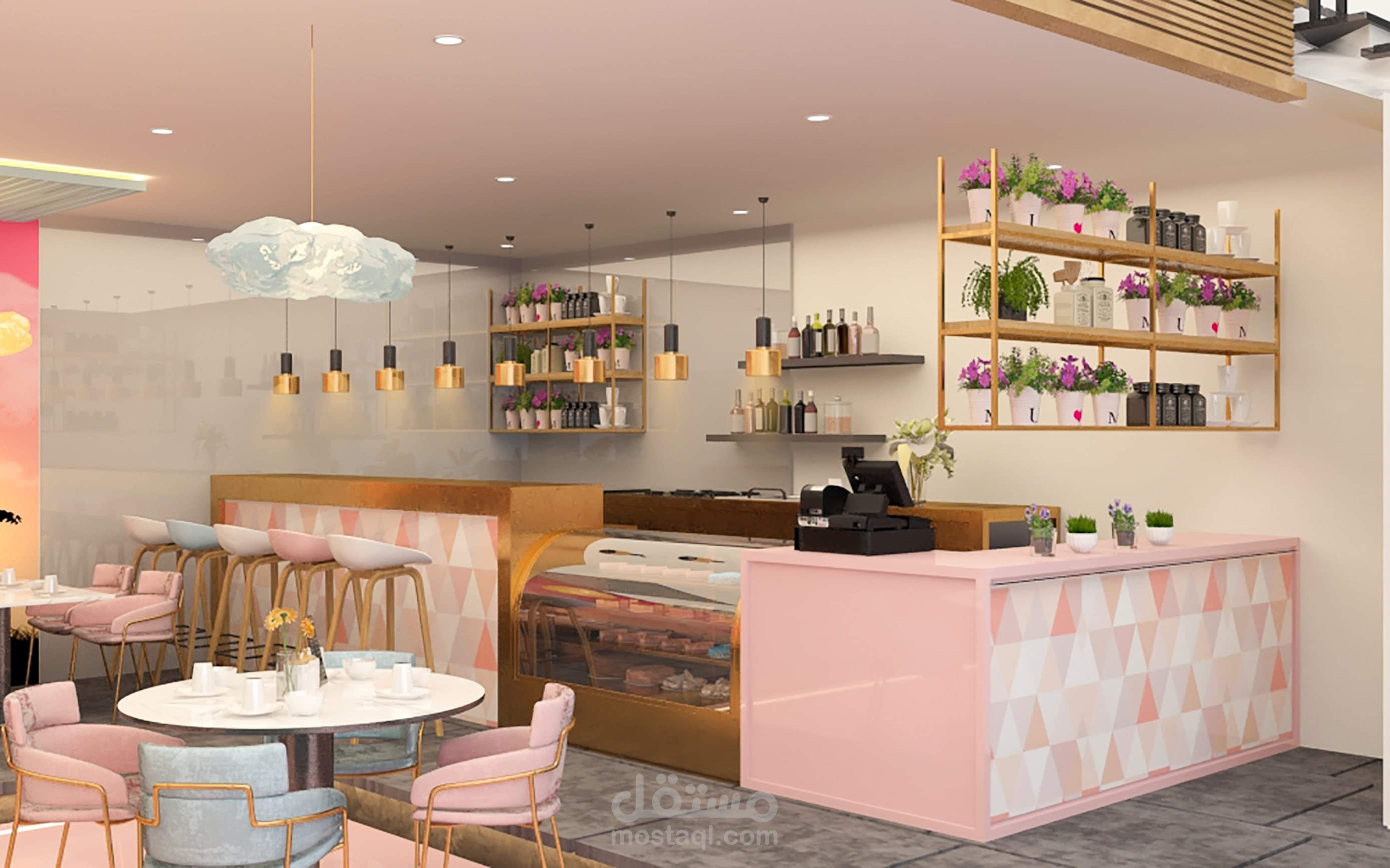Interior design for coffee shop in modern pink mood