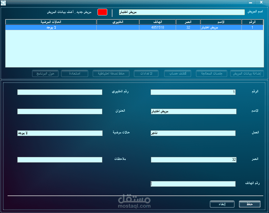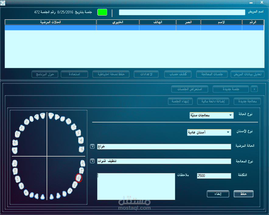 برنامج لأتمتة عمل أطباء الأسنان وتنظيم مواعيد وحسابات المرضى . يؤمن البرنامج تمثيل رسومي للفك ويتم اختيار السن الذي يتم العمل فيه وإدخال العمل وتكاليفه.