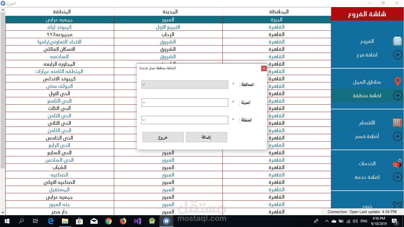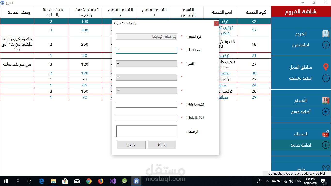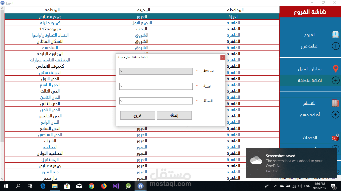 1- شاشة لأدارة الفروع ومناطق العمل والاقسام والخدمات التى يتم توفيرها.