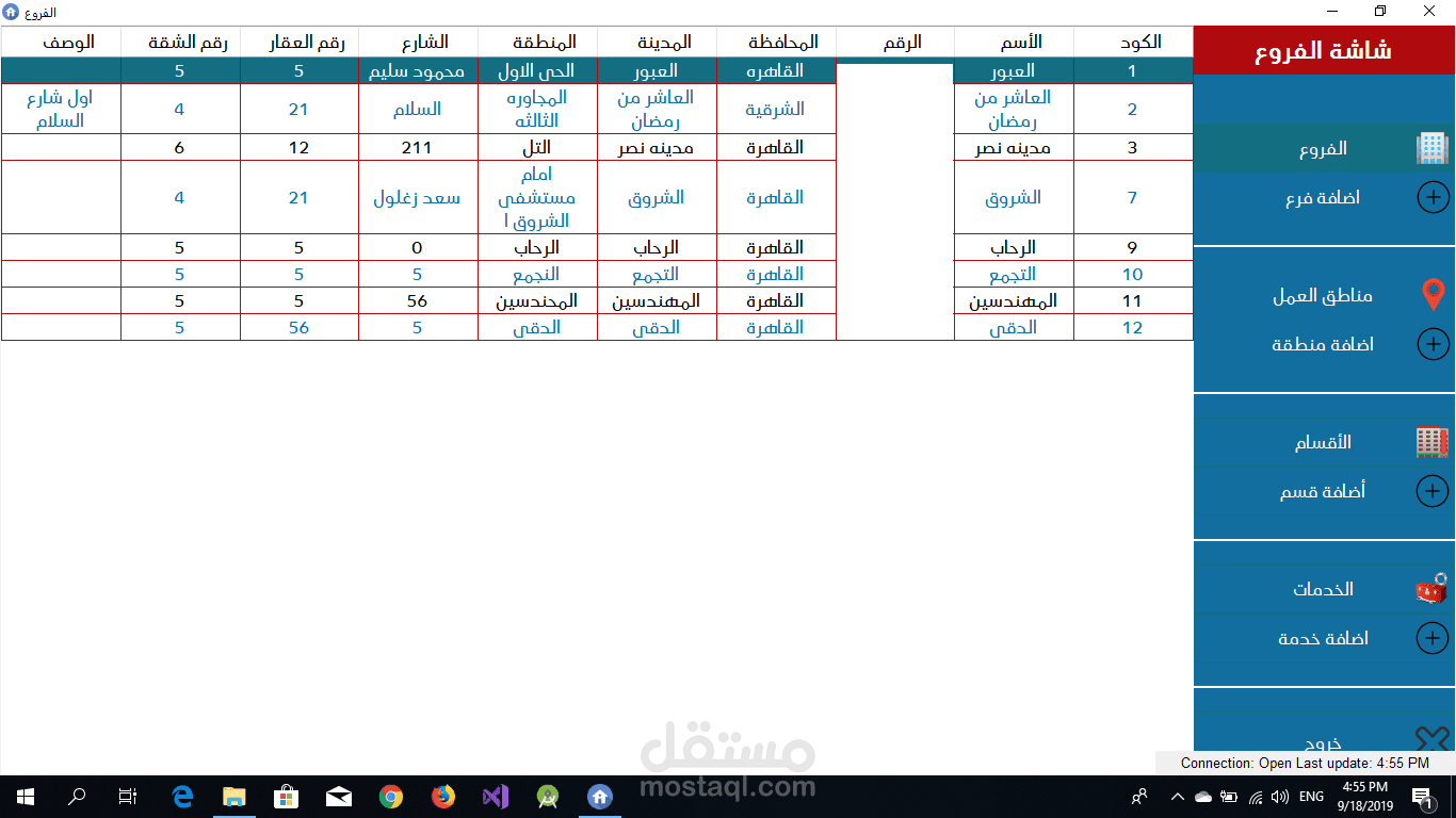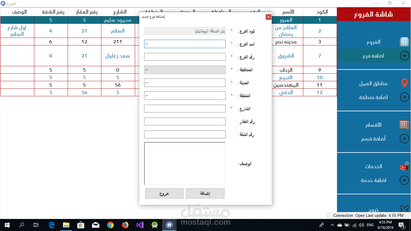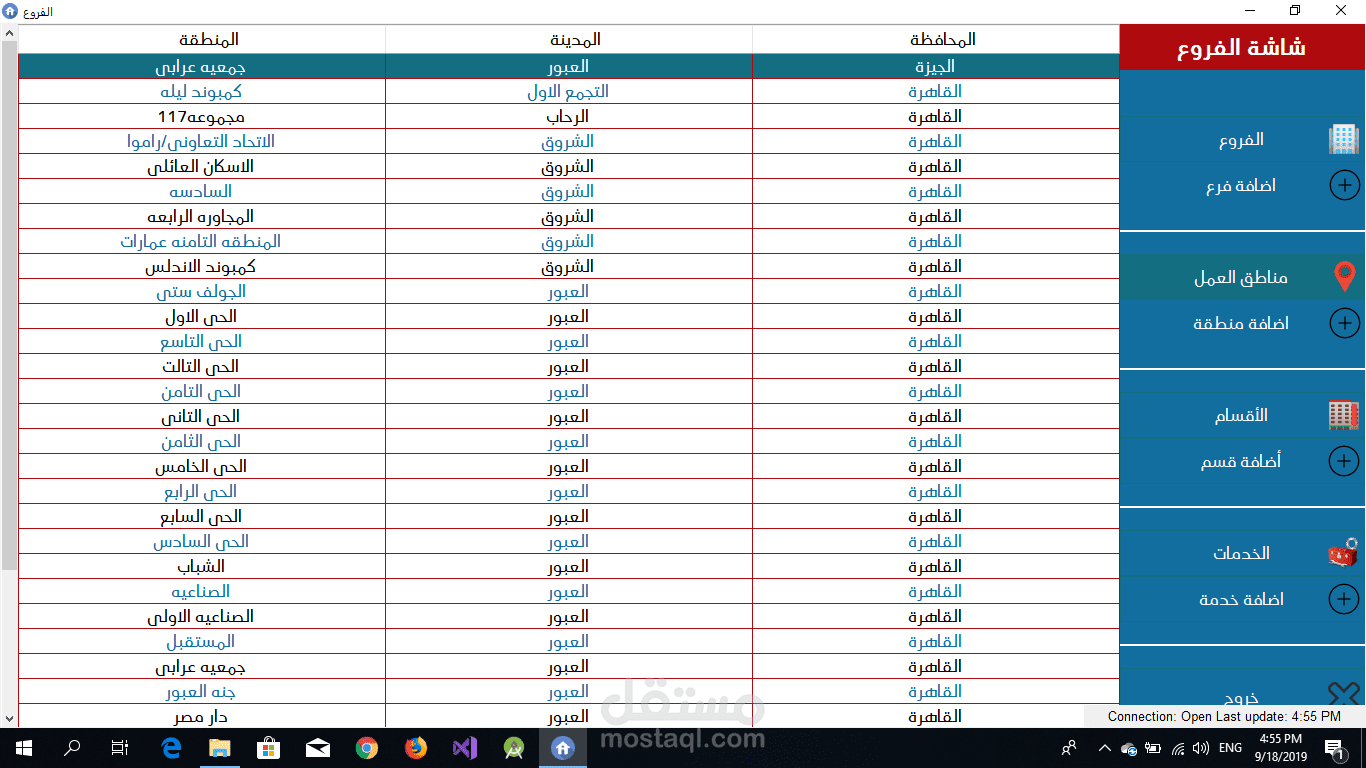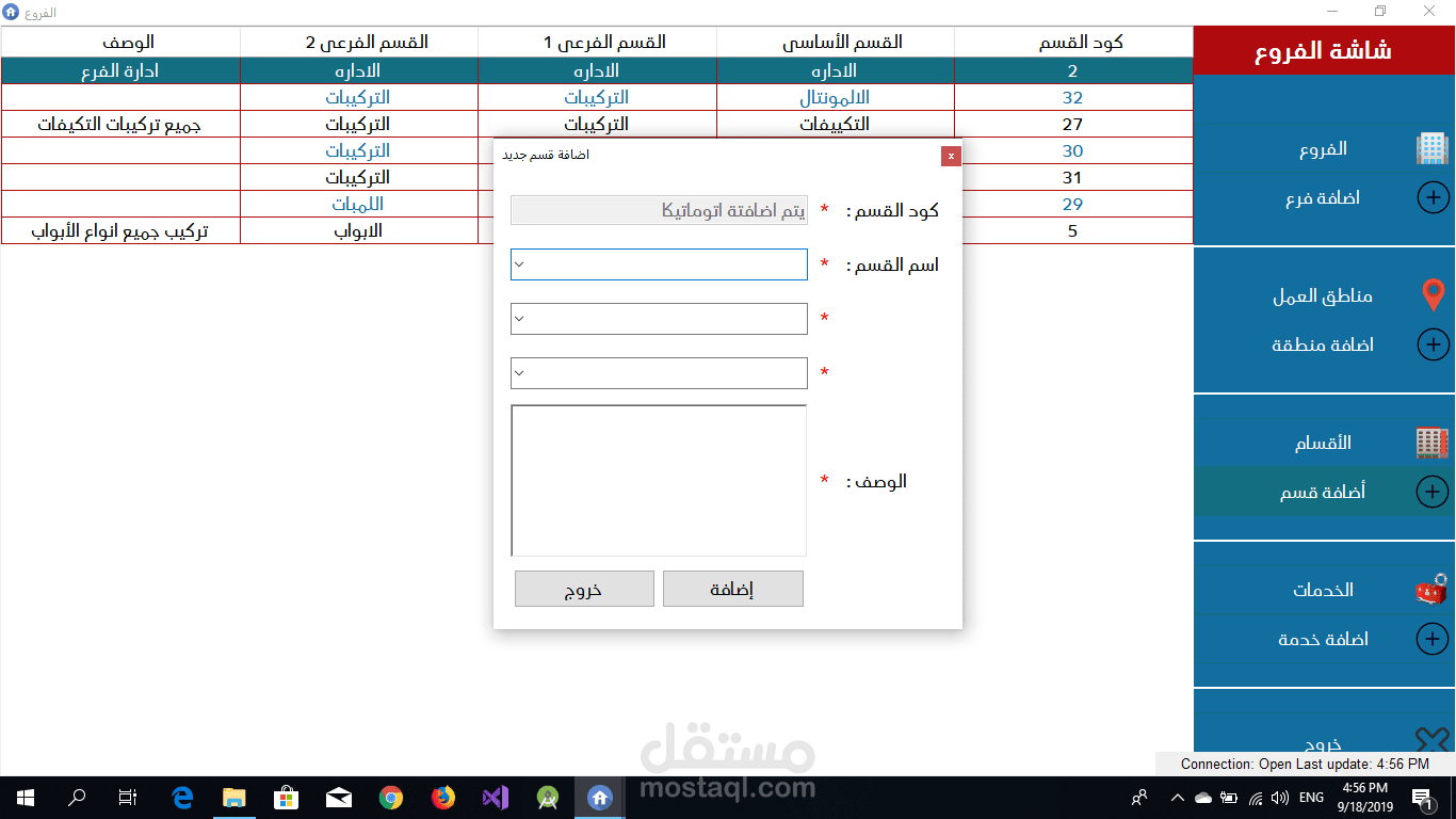1- شاشة لأدارة الفروع ومناطق العمل والاقسام والخدمات التى يتم توفيرها.