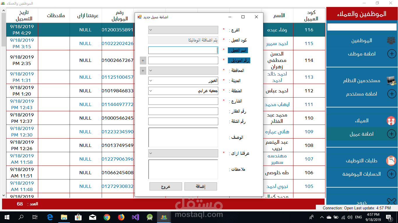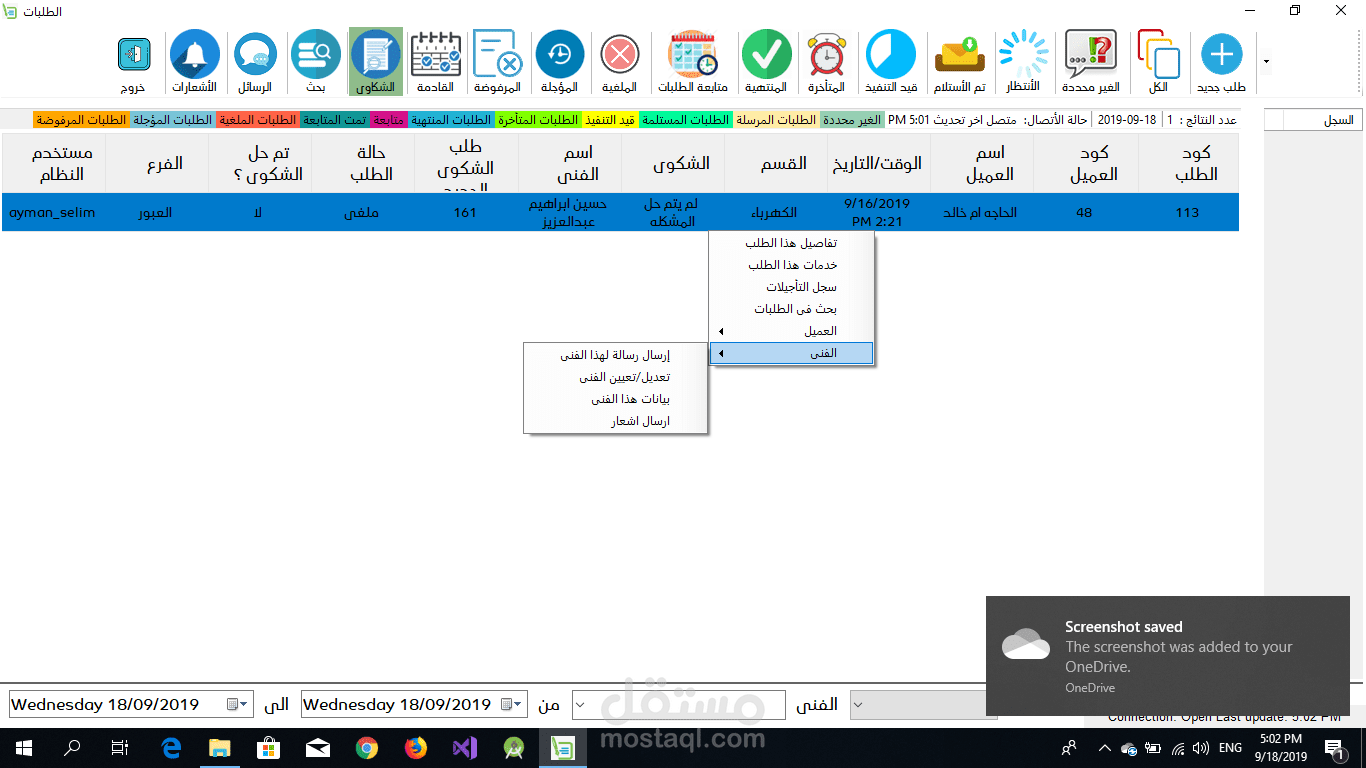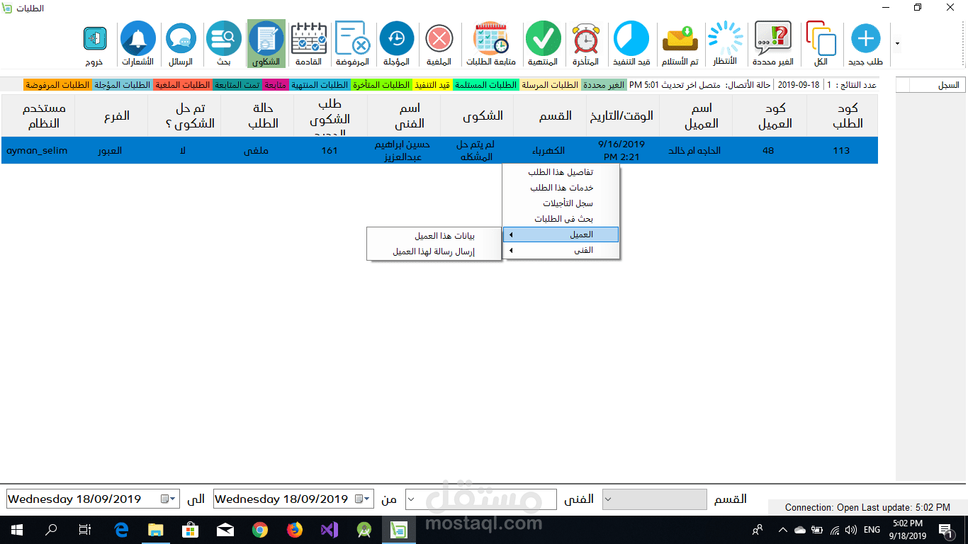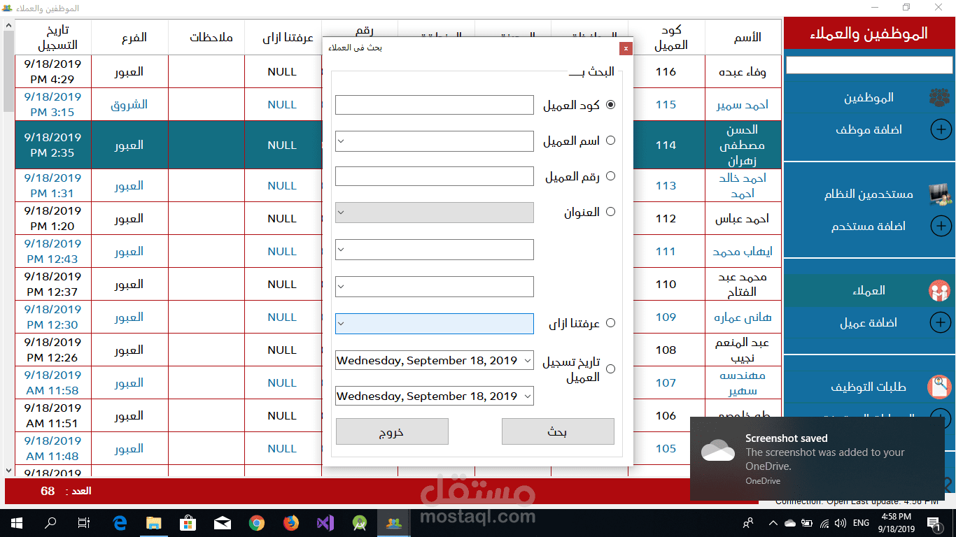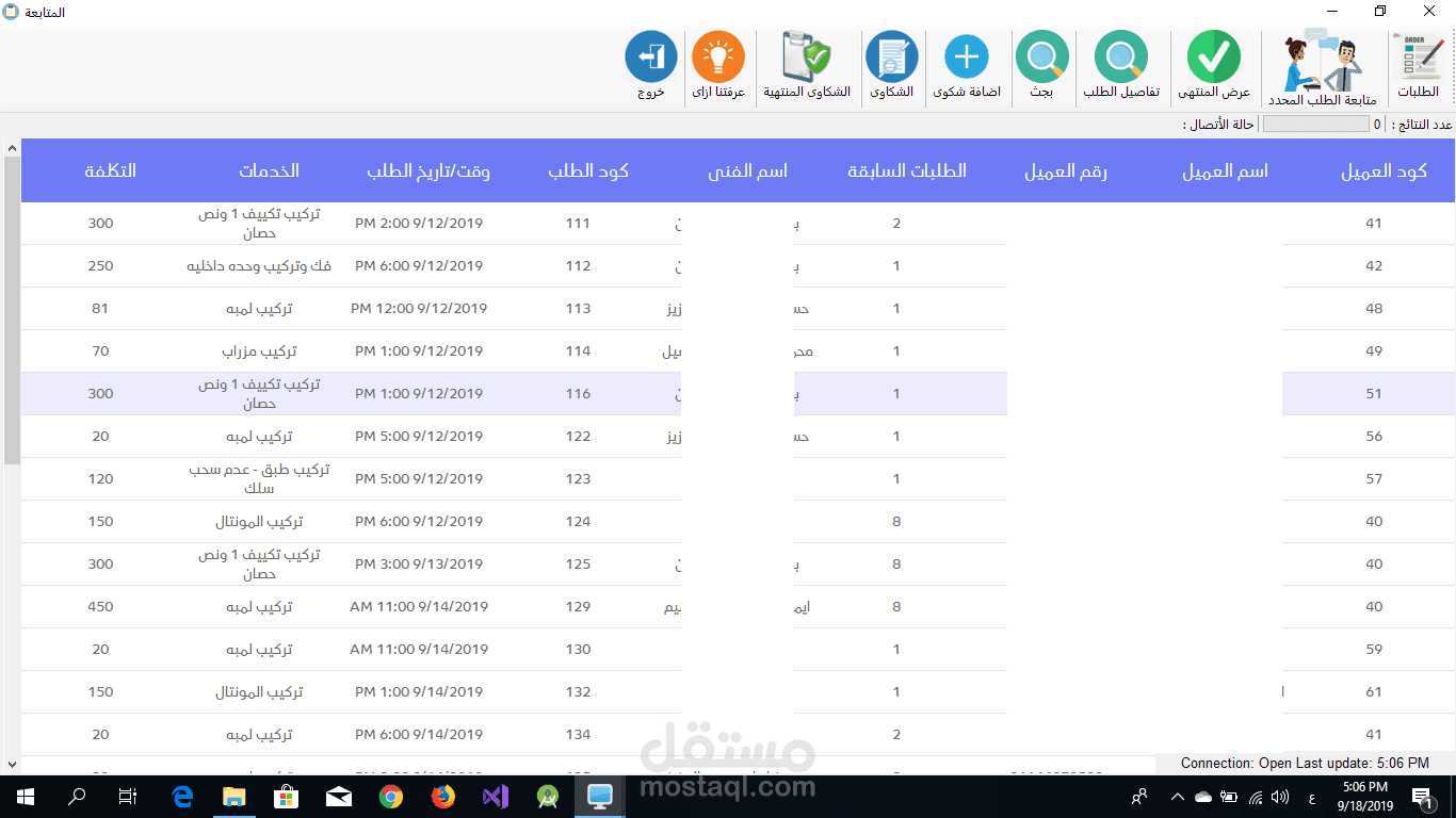 5- شاشة لمتابعة العمل مع العملاء والتقييم وتلقى الشكاوى.