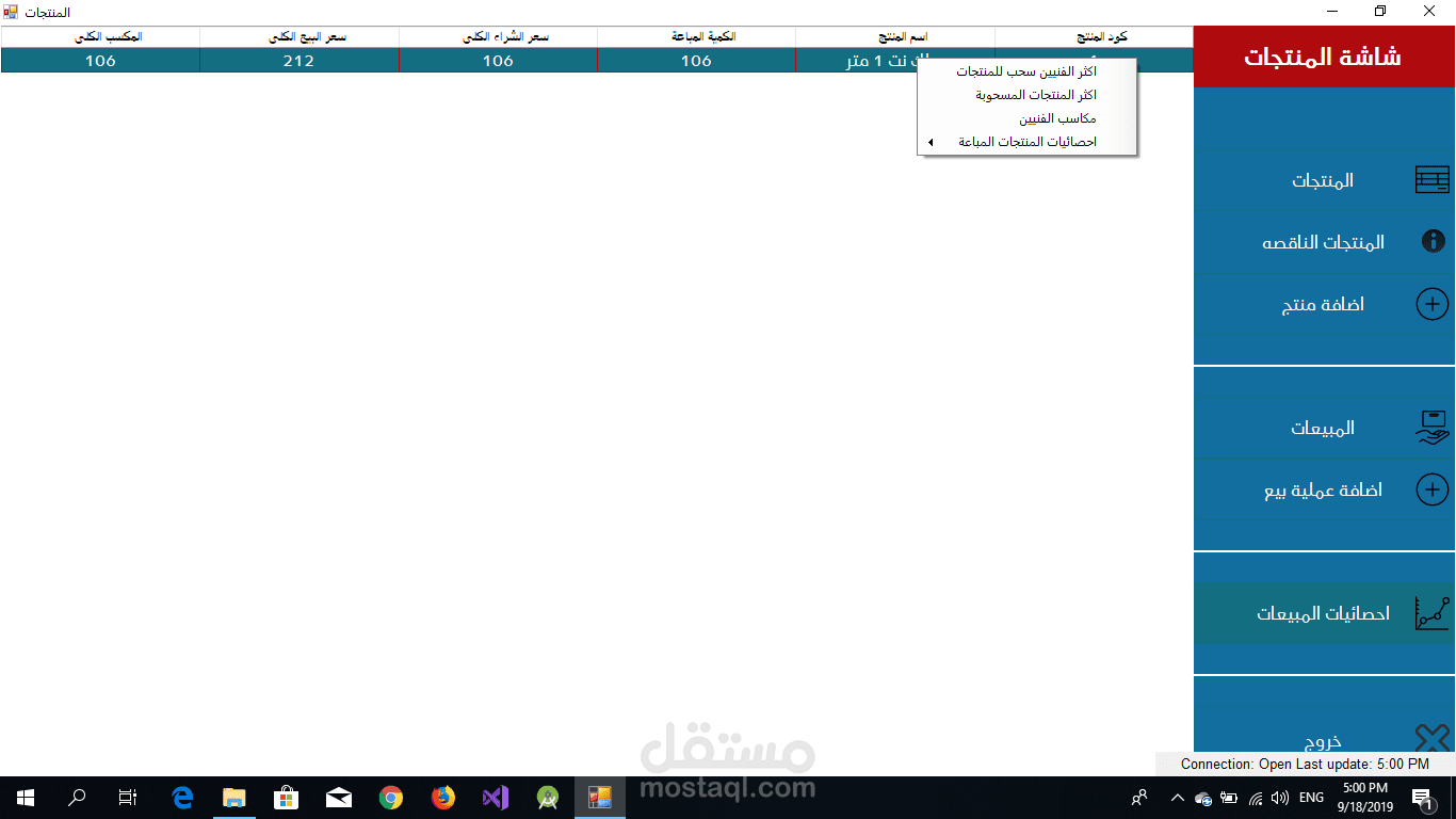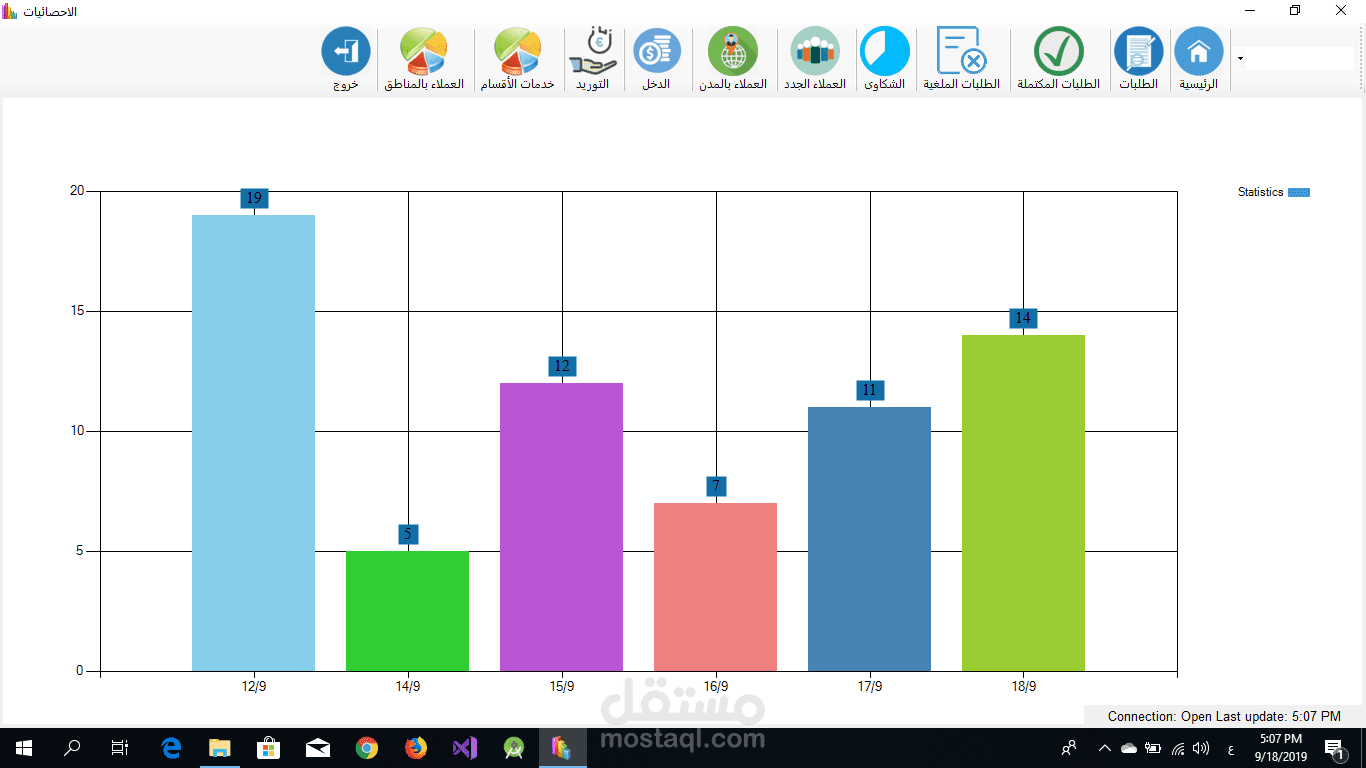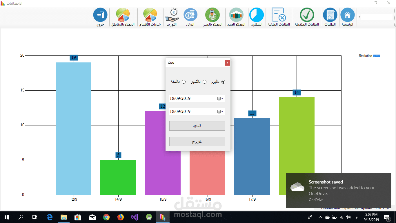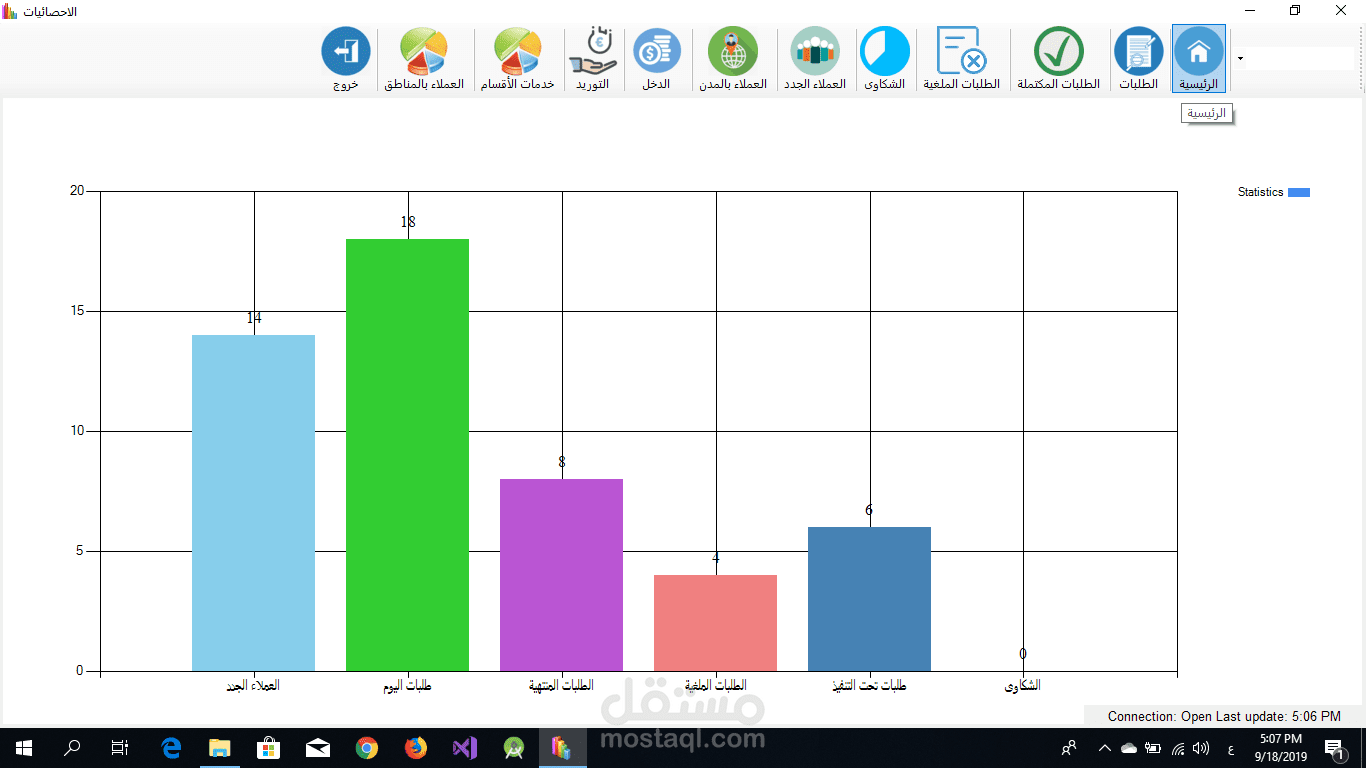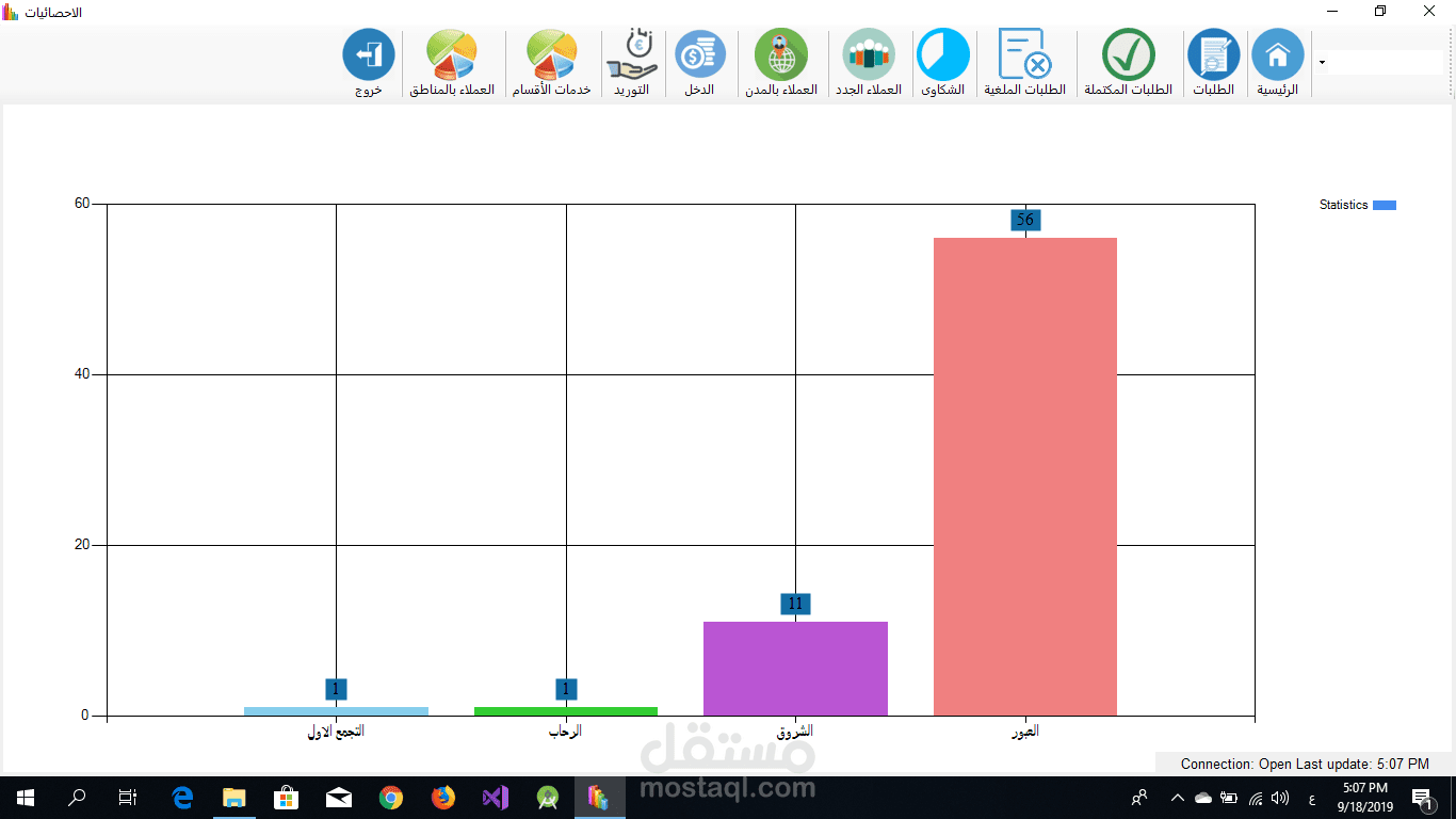7- شاشة للأحصائيات وتشمل بعض الاحصائيات على العملاء والمناطق والدخل والطلبات.