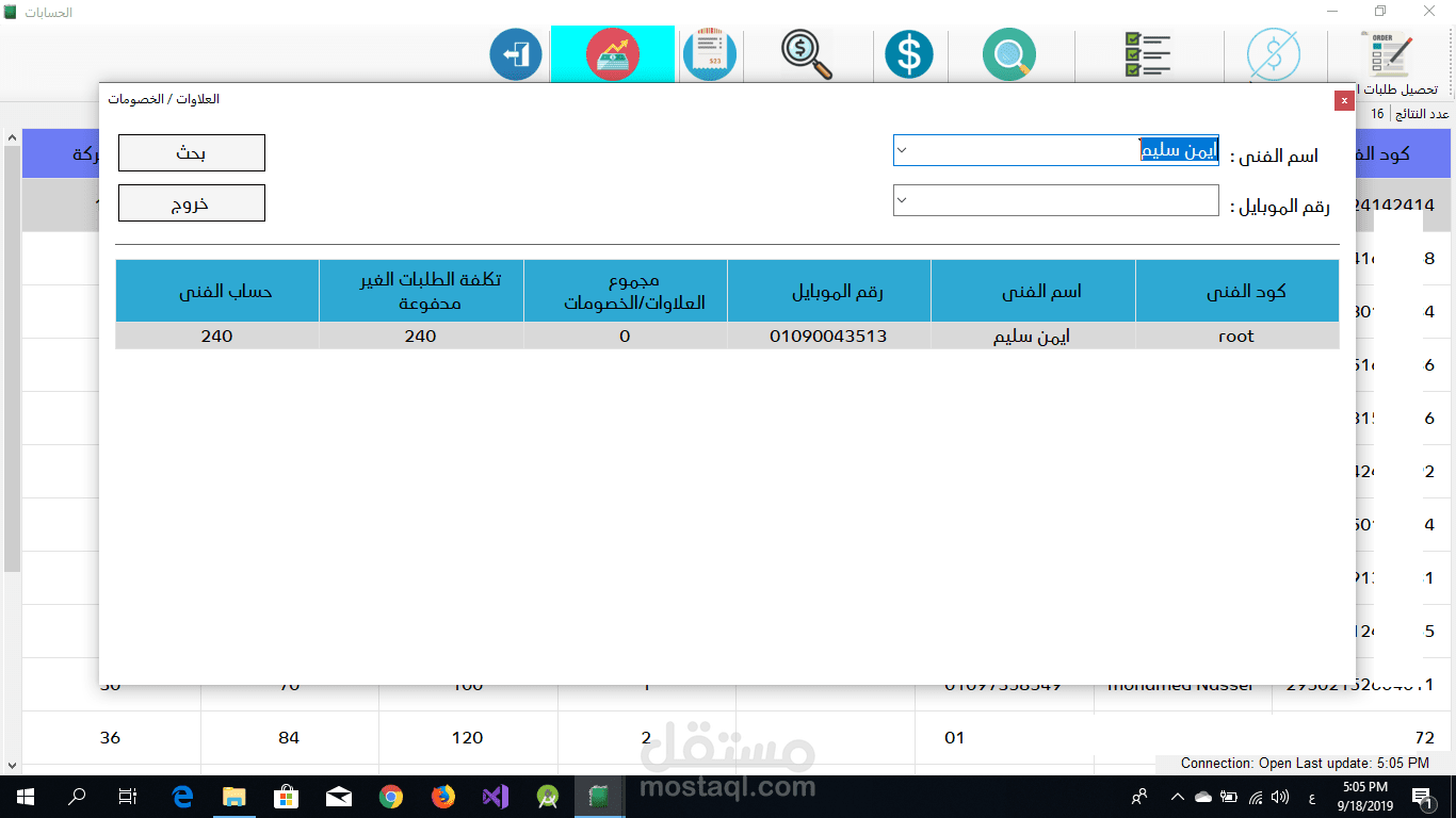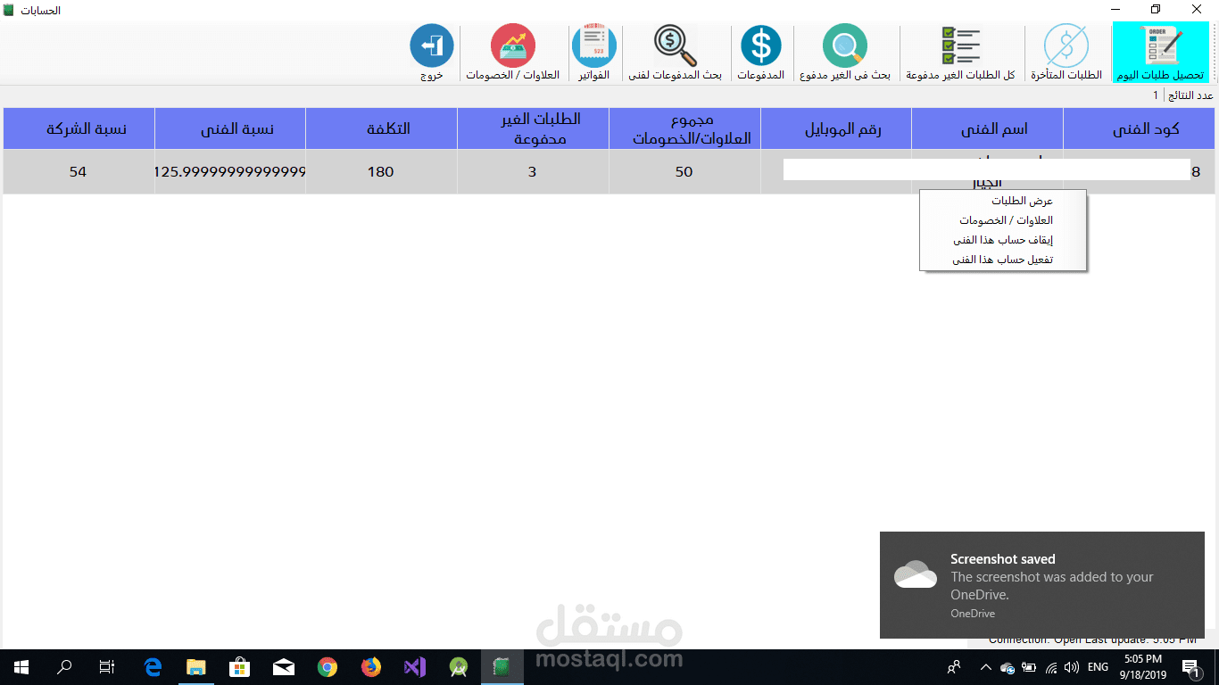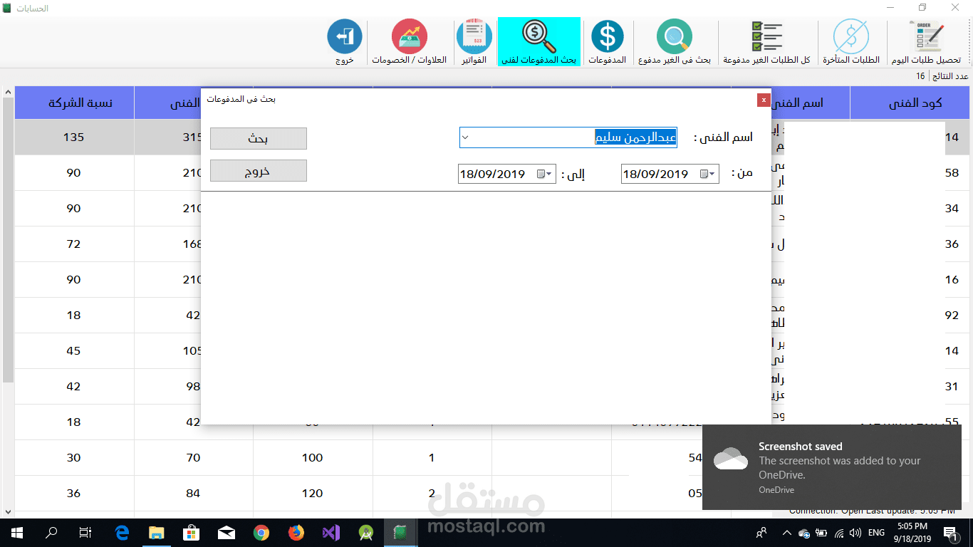 6- شاشة لحسابات الفنيين تبعا للطلبات المنفذه.