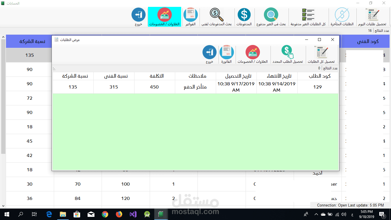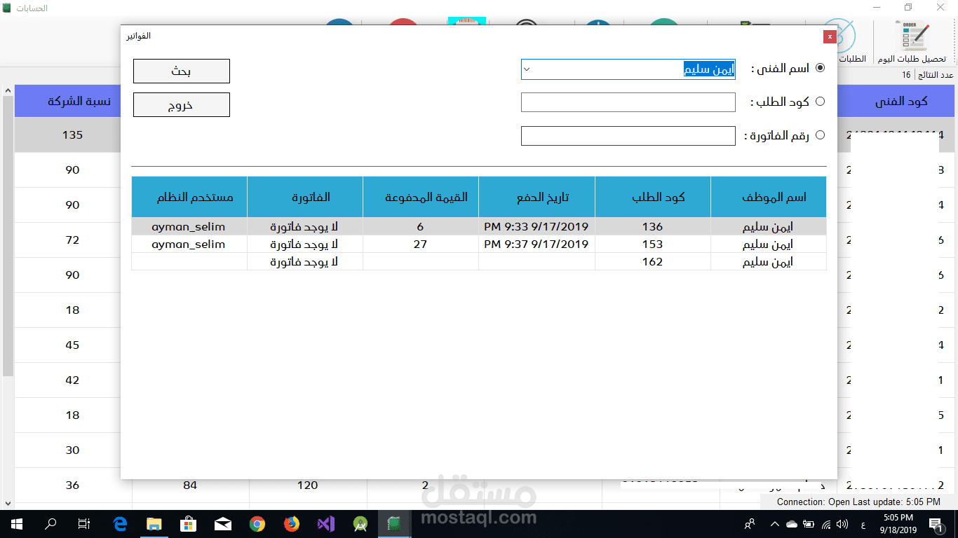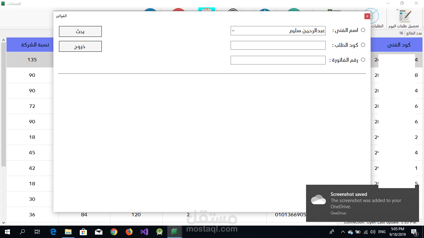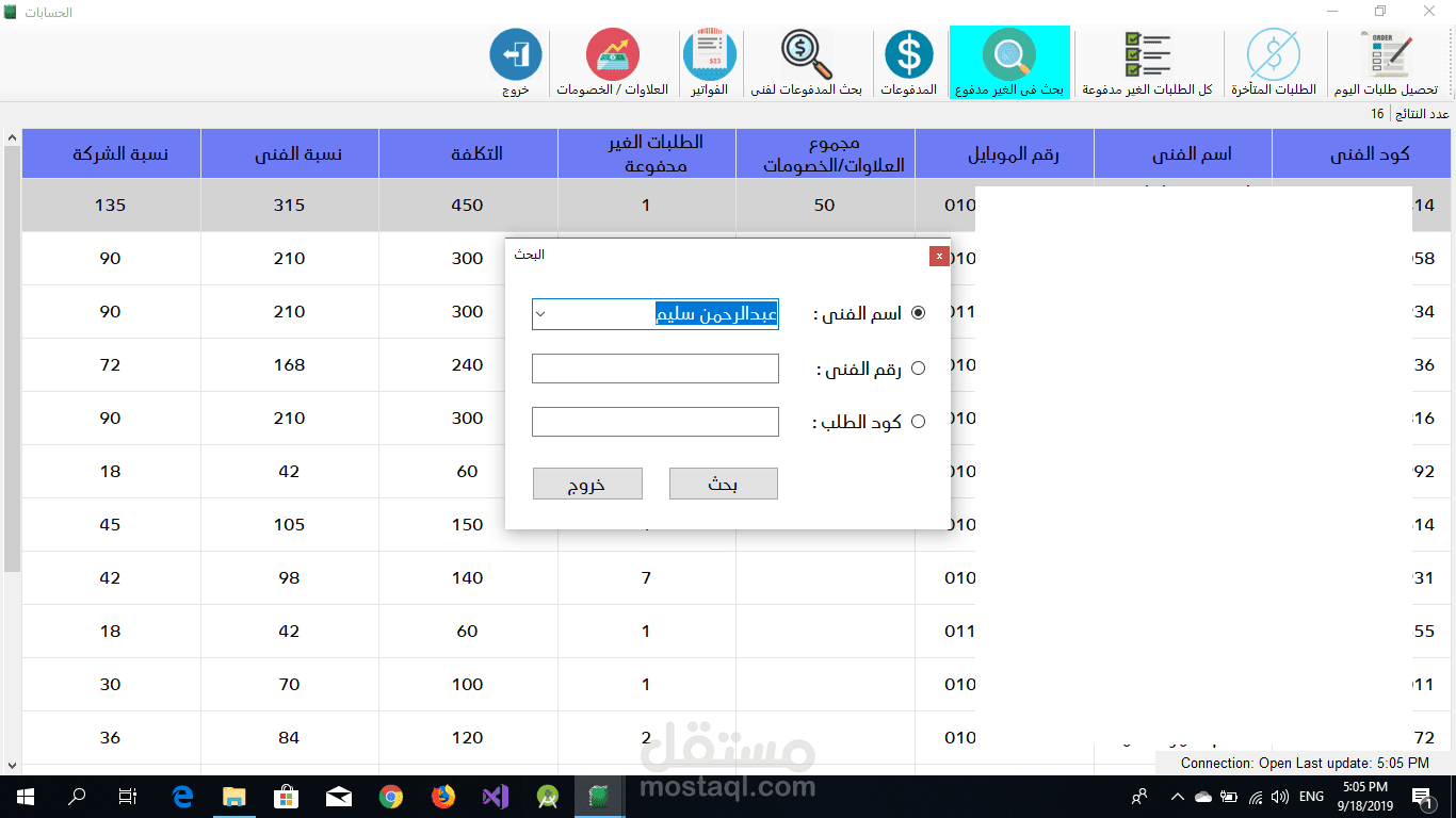 6- شاشة لحسابات الفنيين تبعا للطلبات المنفذه.