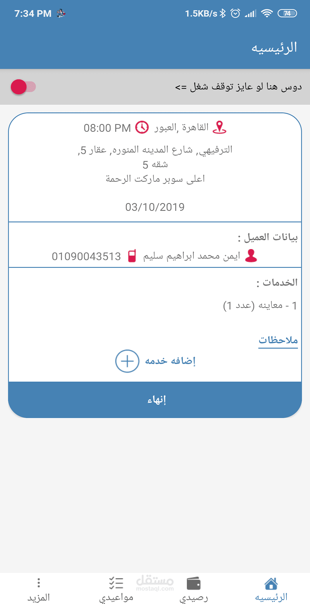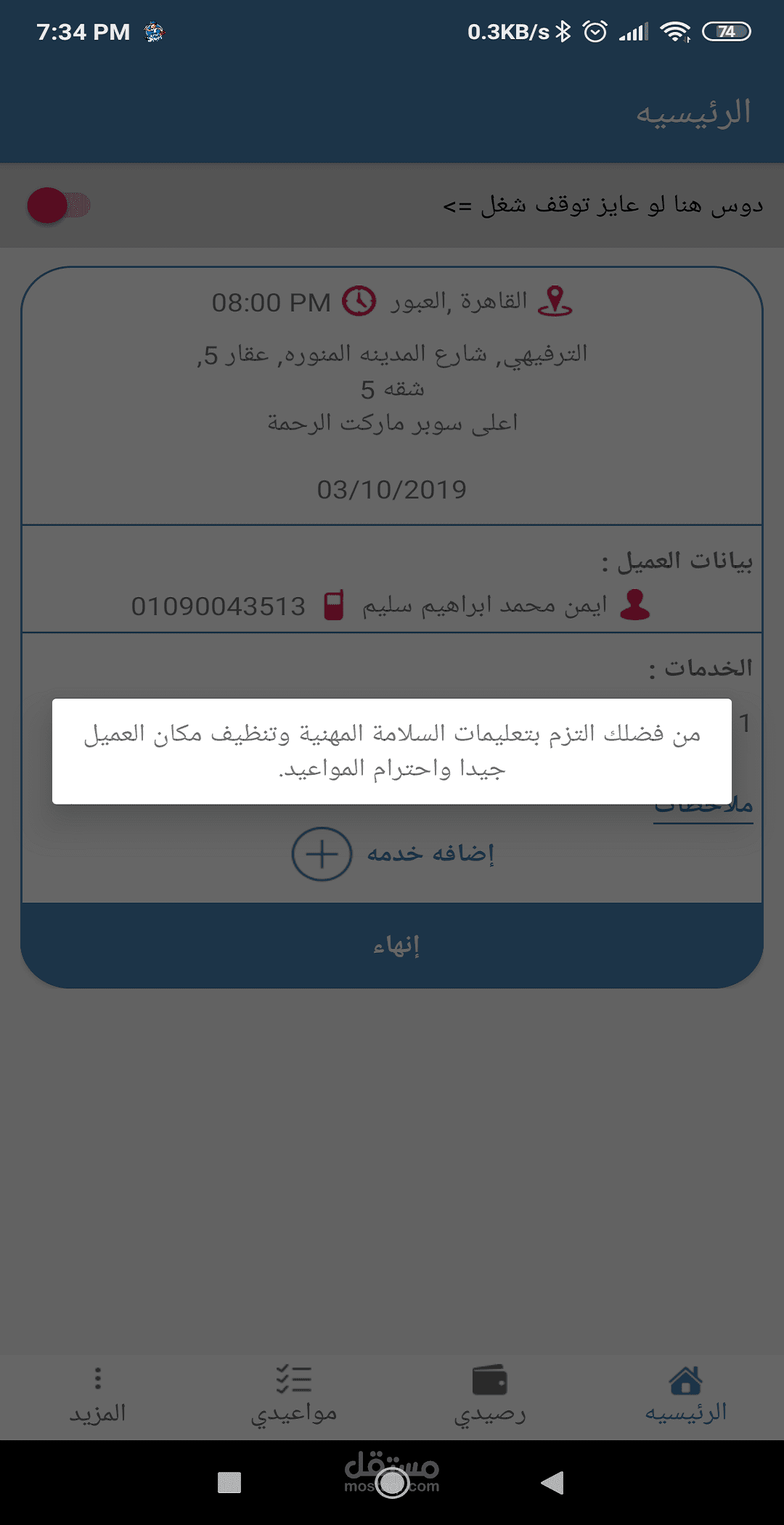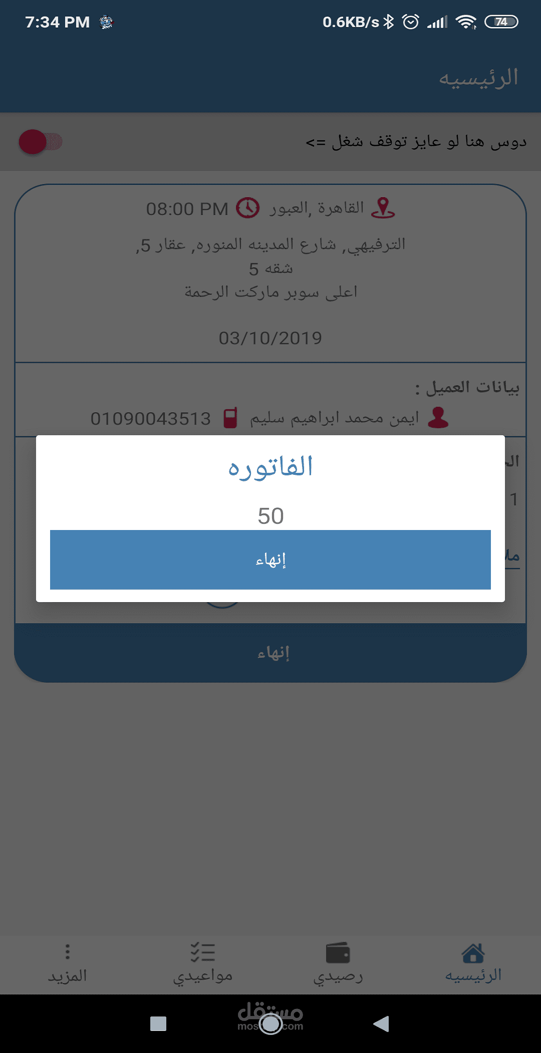 8- تطبيق للموبايل مع الفنى لتلقى الطلبات ومتابعة حسابة.