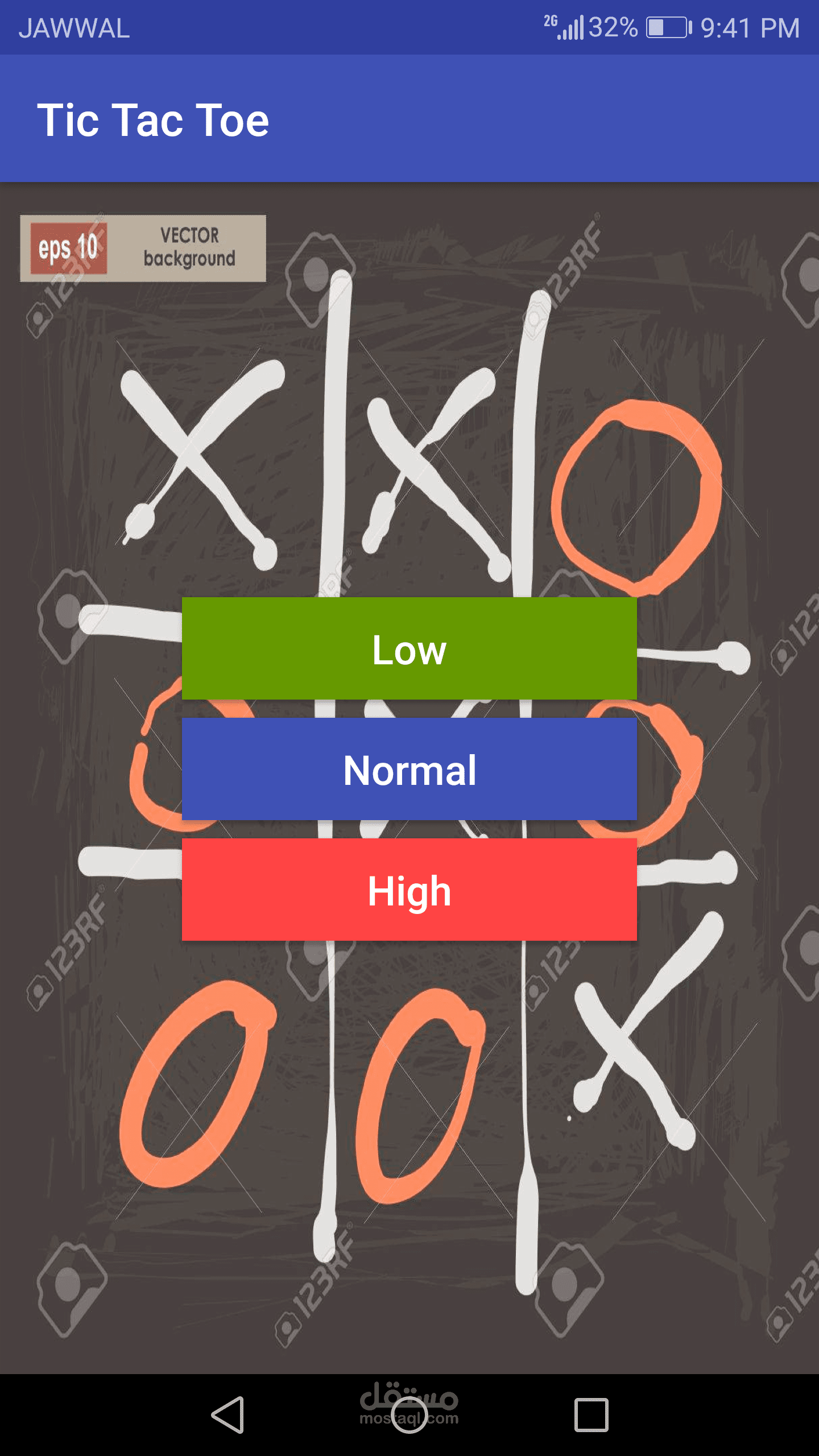 التطبيق عبارة عن لعبة Tic Tac Toe يمكنك من خلاله اللعب ضد الهاتف واختيار مستوى الصعوبة سهل,متوسط,صعب.