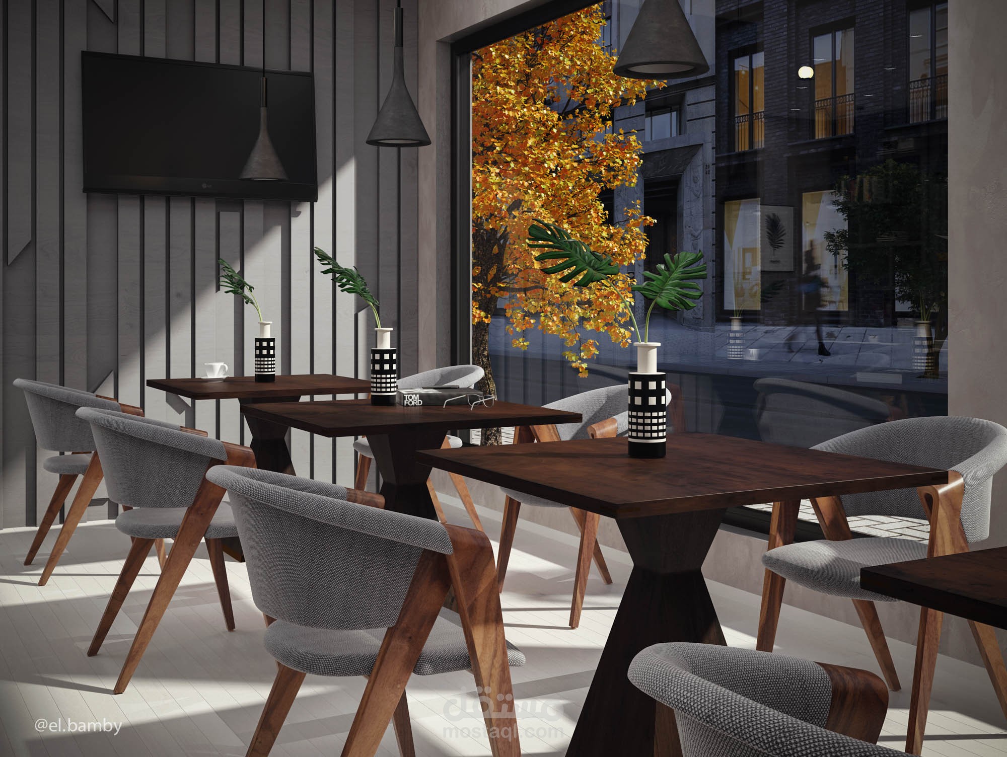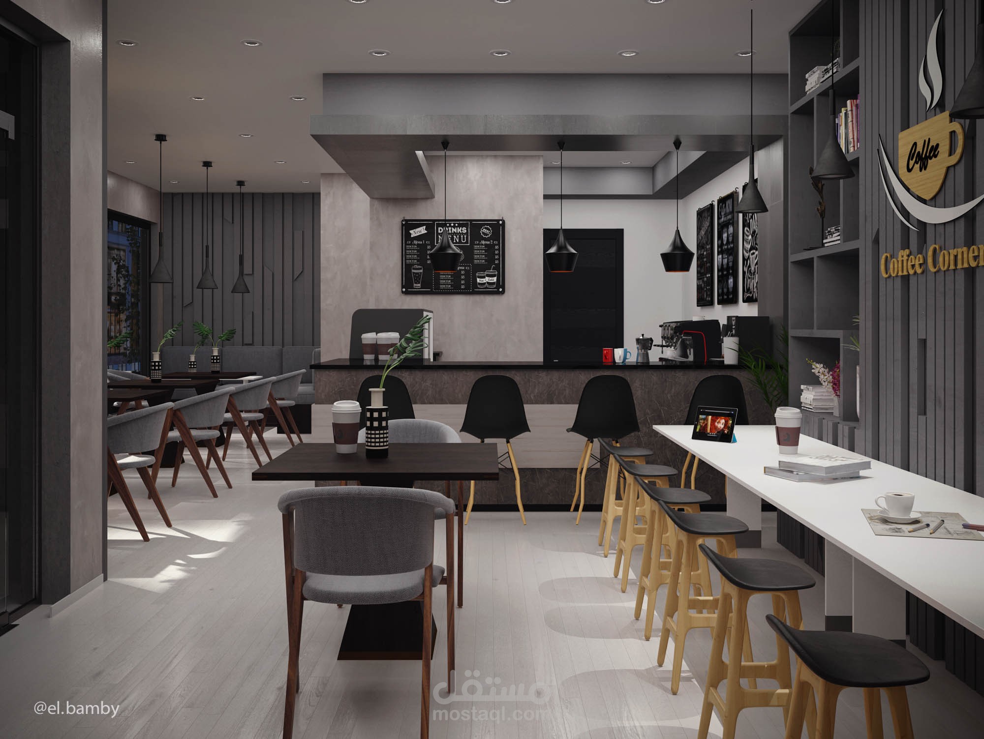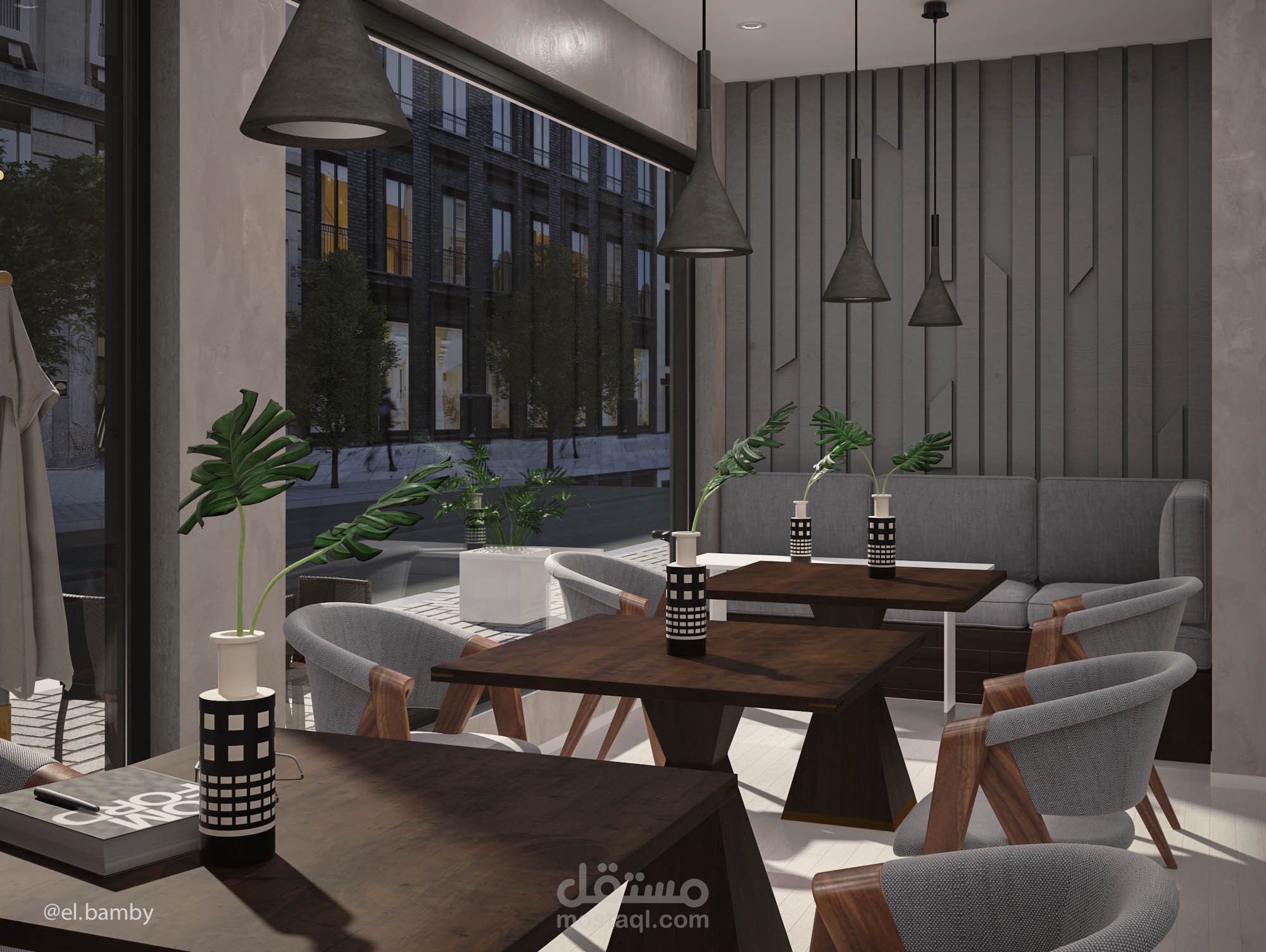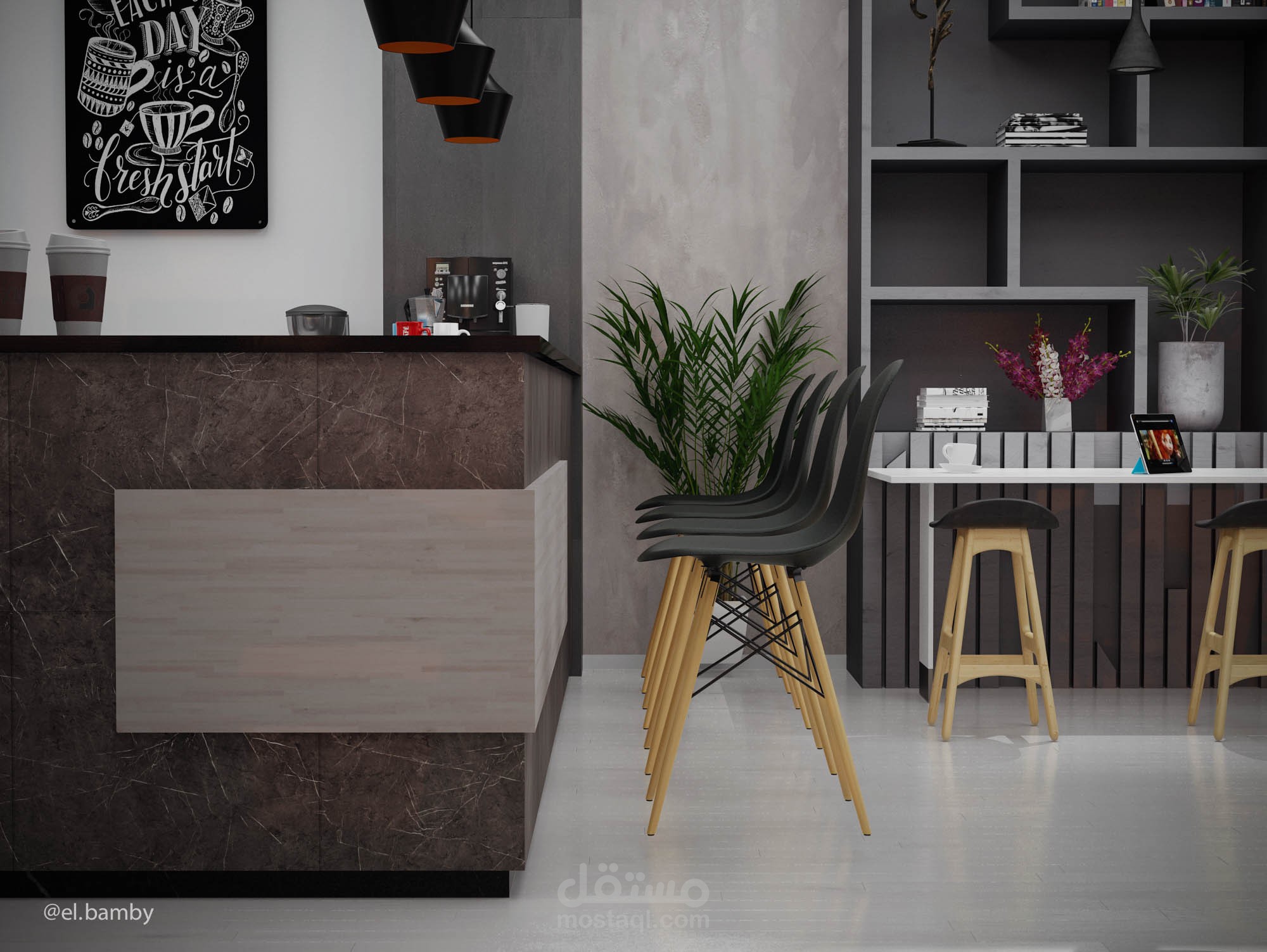 تصميم داخلي Interior Design ثلاثي الأبعاد لكافيه بمساحة 65م2.