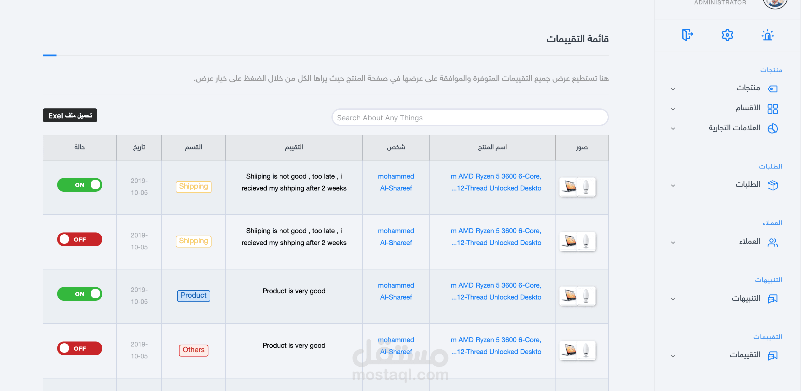 13- التحكم وإدارة التقييمات لمنتجات الموقع بحسب مايردة المدير، الغائها او اظهارها، والموافقة عليها أو عدمها.