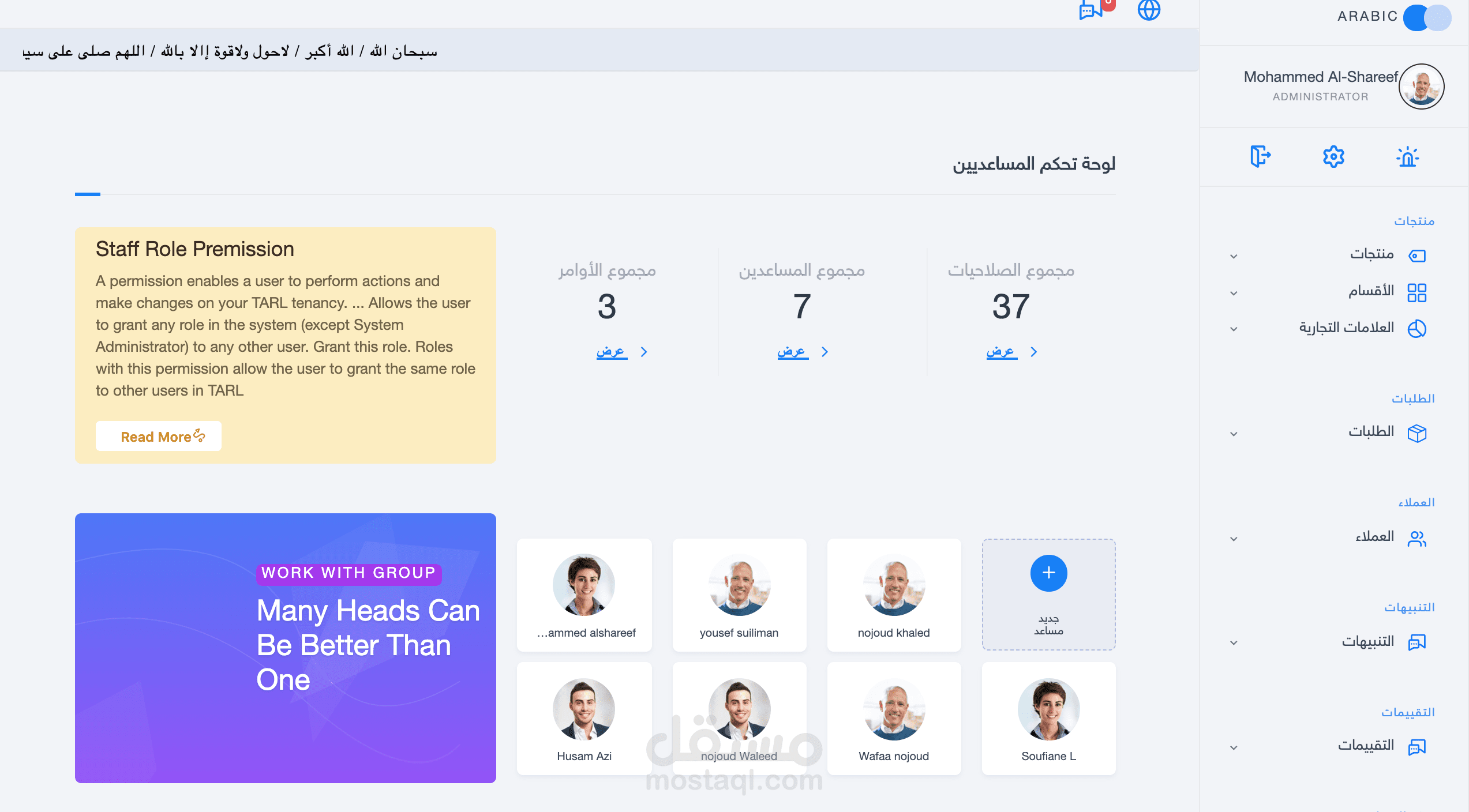 2- لوحة تحكم لمساعدي المدير مع صلاحيات محدودة والتحكم بالصلاحيات.