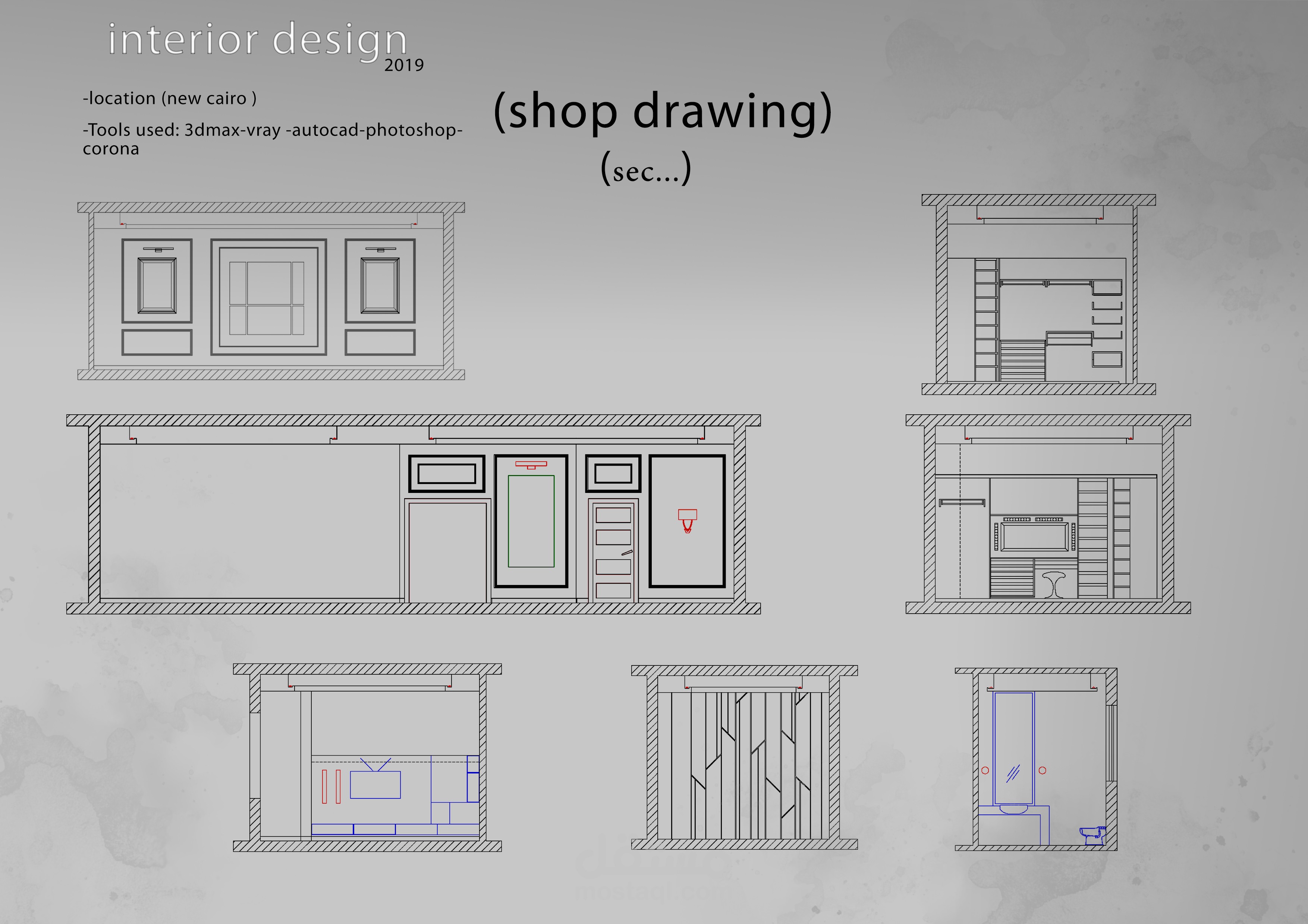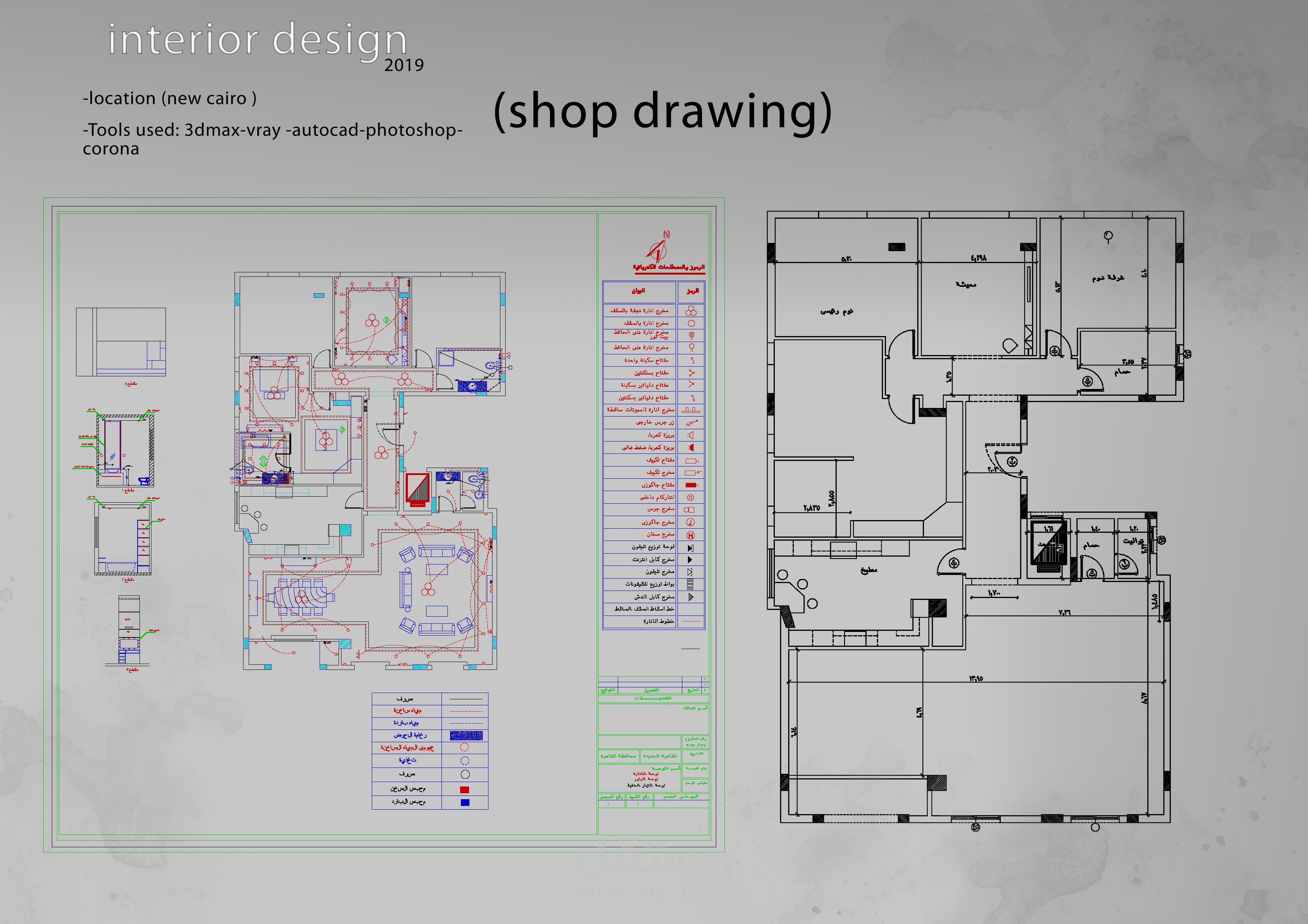 مخطط تنفيذية لشقة سكنية ( رسومات كهربا - وصحى - واسقف - وجدران - واضاءة )
