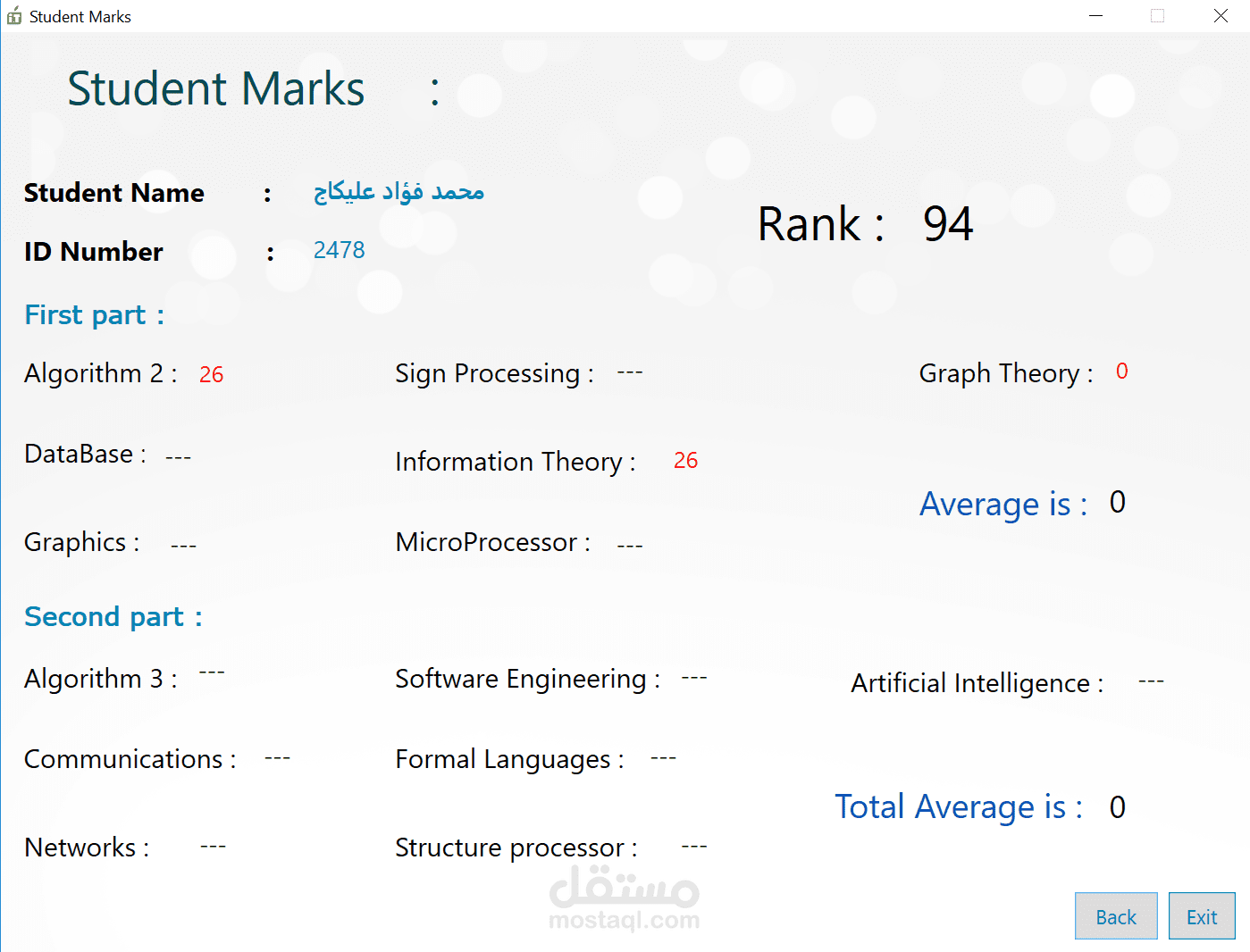 عمل قمت به عندما كنت في السنة الثالثة. حيث يمكن عن طريق هذا التطبيق الحصول على العلامات التي تنشرها الكلية عن طريق الانترنت عوضاً عن الذهاب إلى الكلية أو الدخول إلى صفحة الكلية.