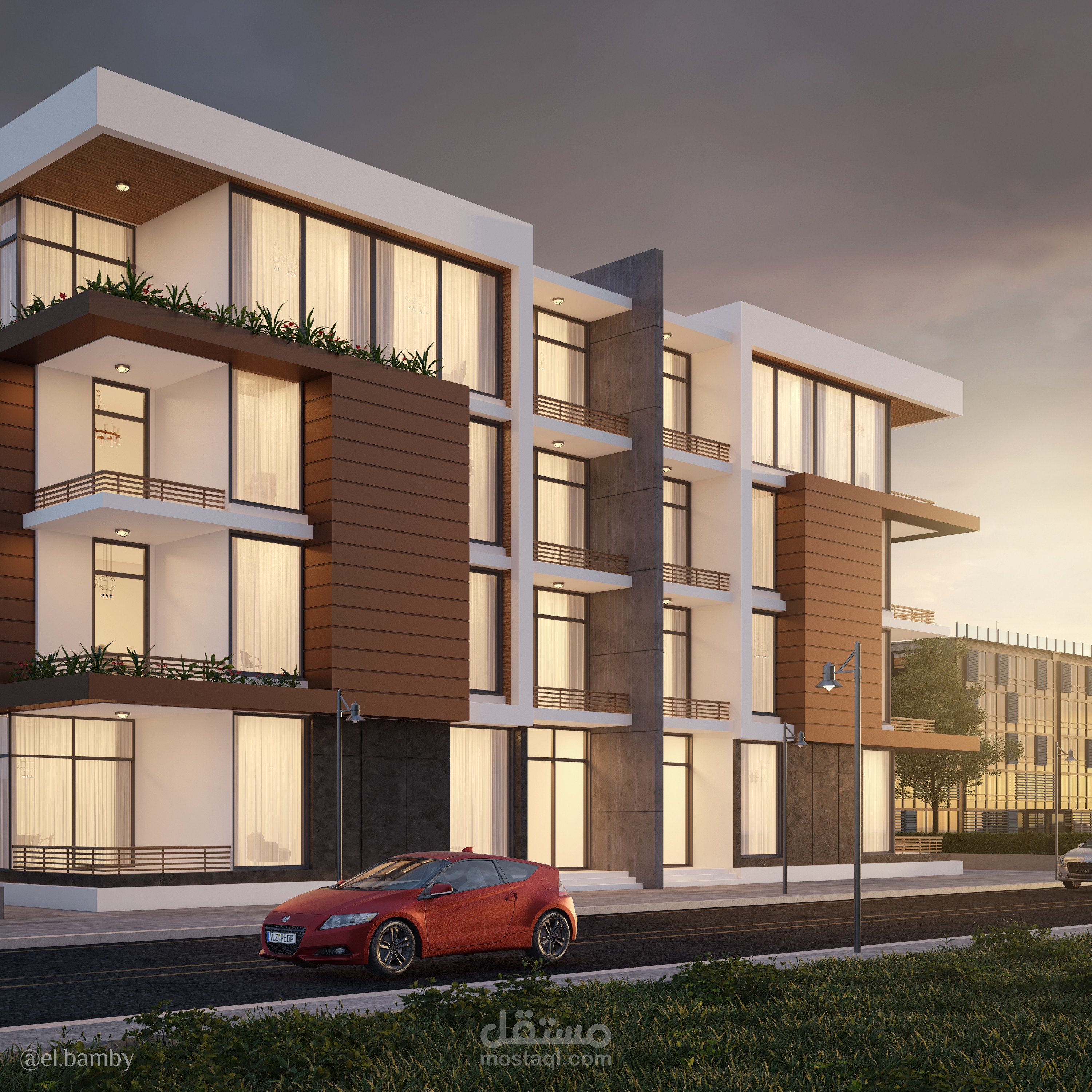 تصميم ثلاثي الأبعاد لواجهة مبنى سكني.