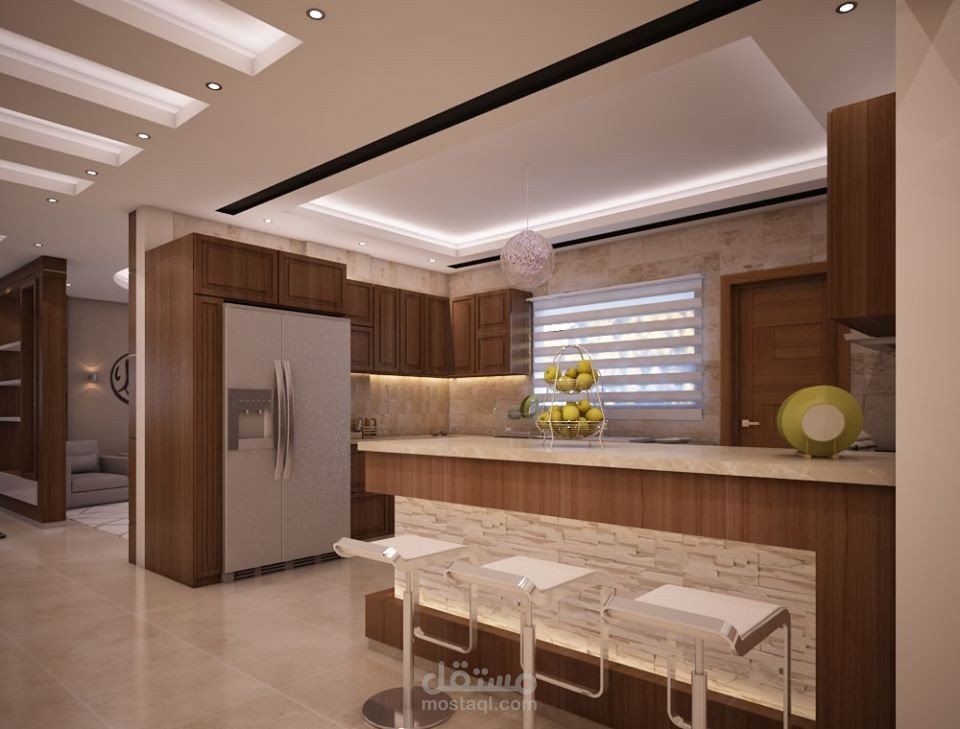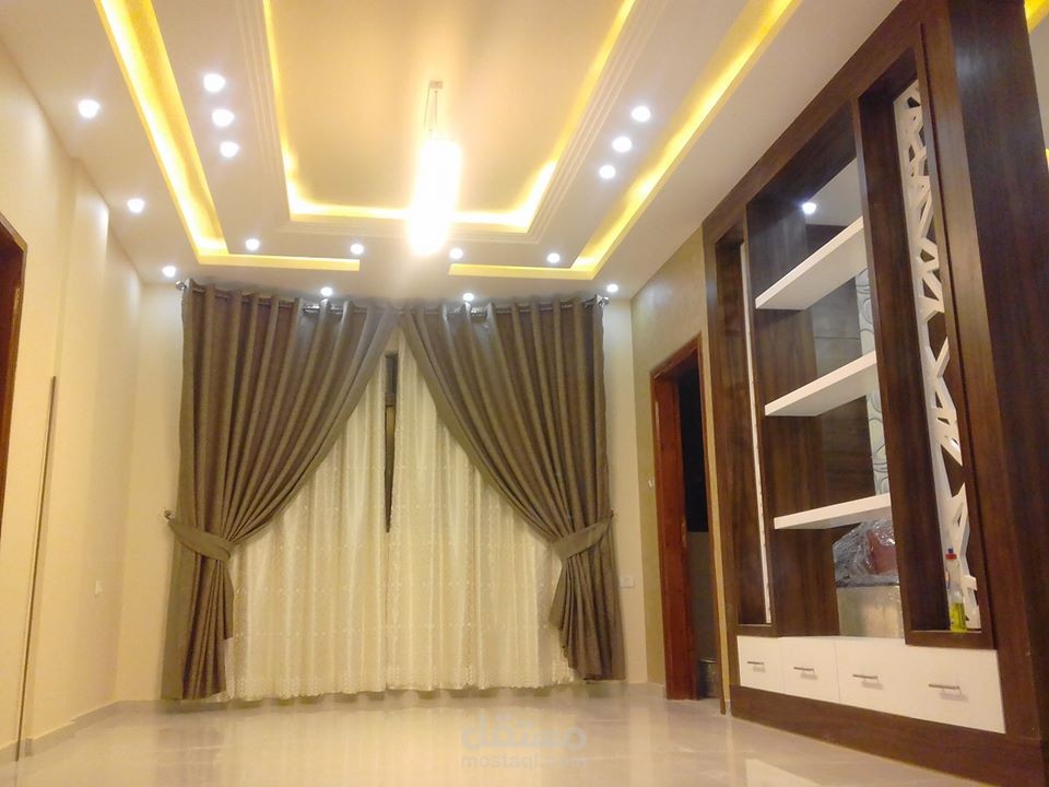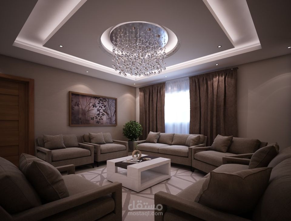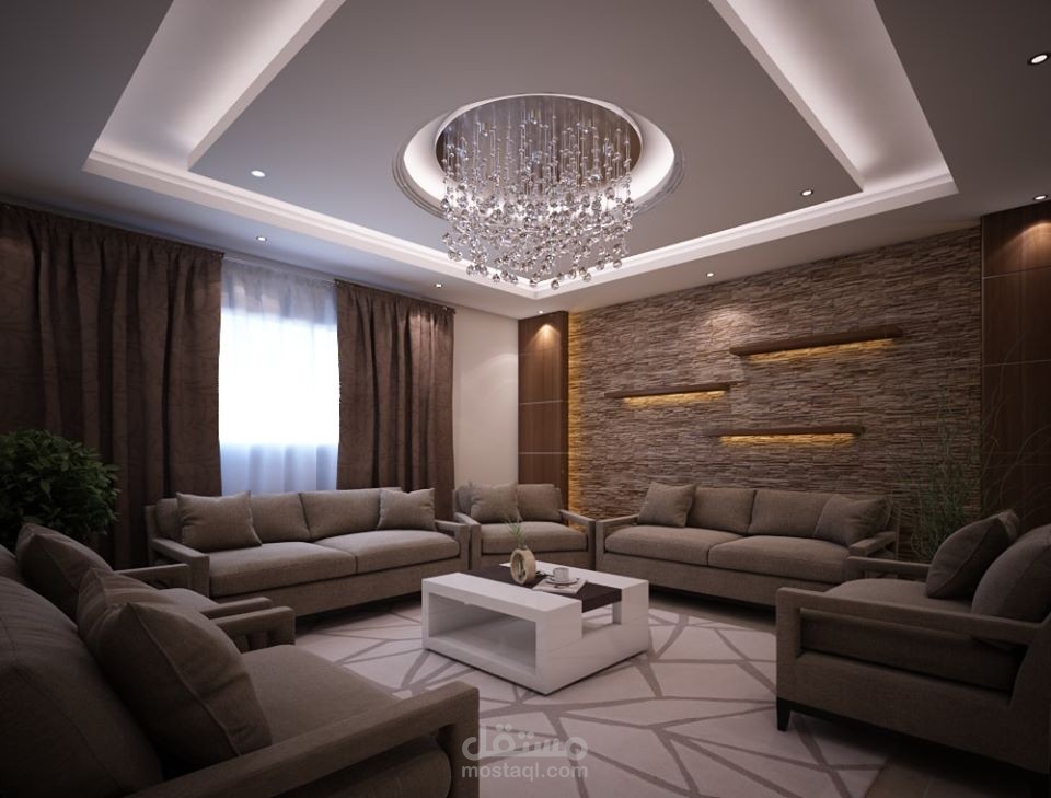 تصميم غرفة معيشة حيث اختيار الألوان المناسبة واختيار الأثاث المناسب لدى الفراغ .