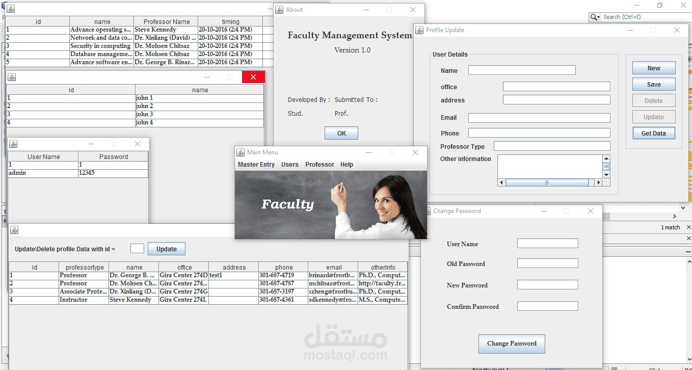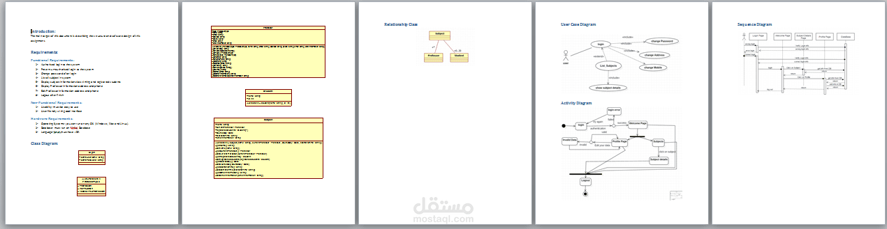 1- Design Document and UML Diagram 2- Database Management 3-Authorized login to the system 4-Prevent un-authorized login to the system 5-Change password after login 6- Display Subject information 7- Update Professors Profiles 8- List Students and registered Courses