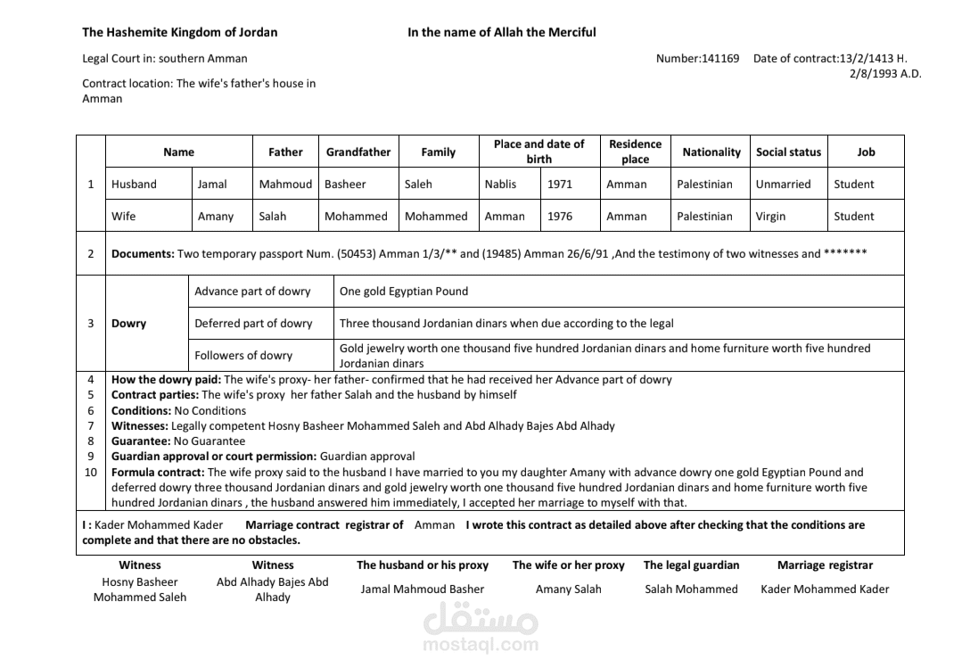 الملف عبارة عن ترجمة قانونية لعقد زواج تم ترجمته مع التنسيق من اللغة العربية الي الانجليزية