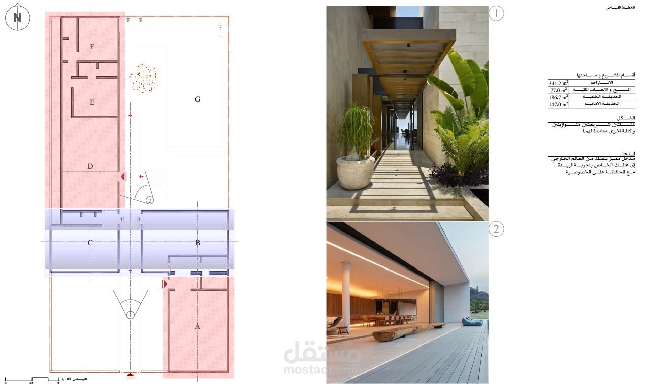 من اتجاهين ويجد فيه قاطينه كل عناصر الراحة و الاستجمام بعيدا عن قسم الضيافة الذي خصص لاستيعاب الحفلات والمناسبات بفراغاته وحديقته الخاصة وتتحقق هذه العلاقة بكتلتين عاموديات شريطيات و كتلة ثالثة تعامدهم وتفصل القسمين عن بعضهما وتضمن خصوصية كل منهما.