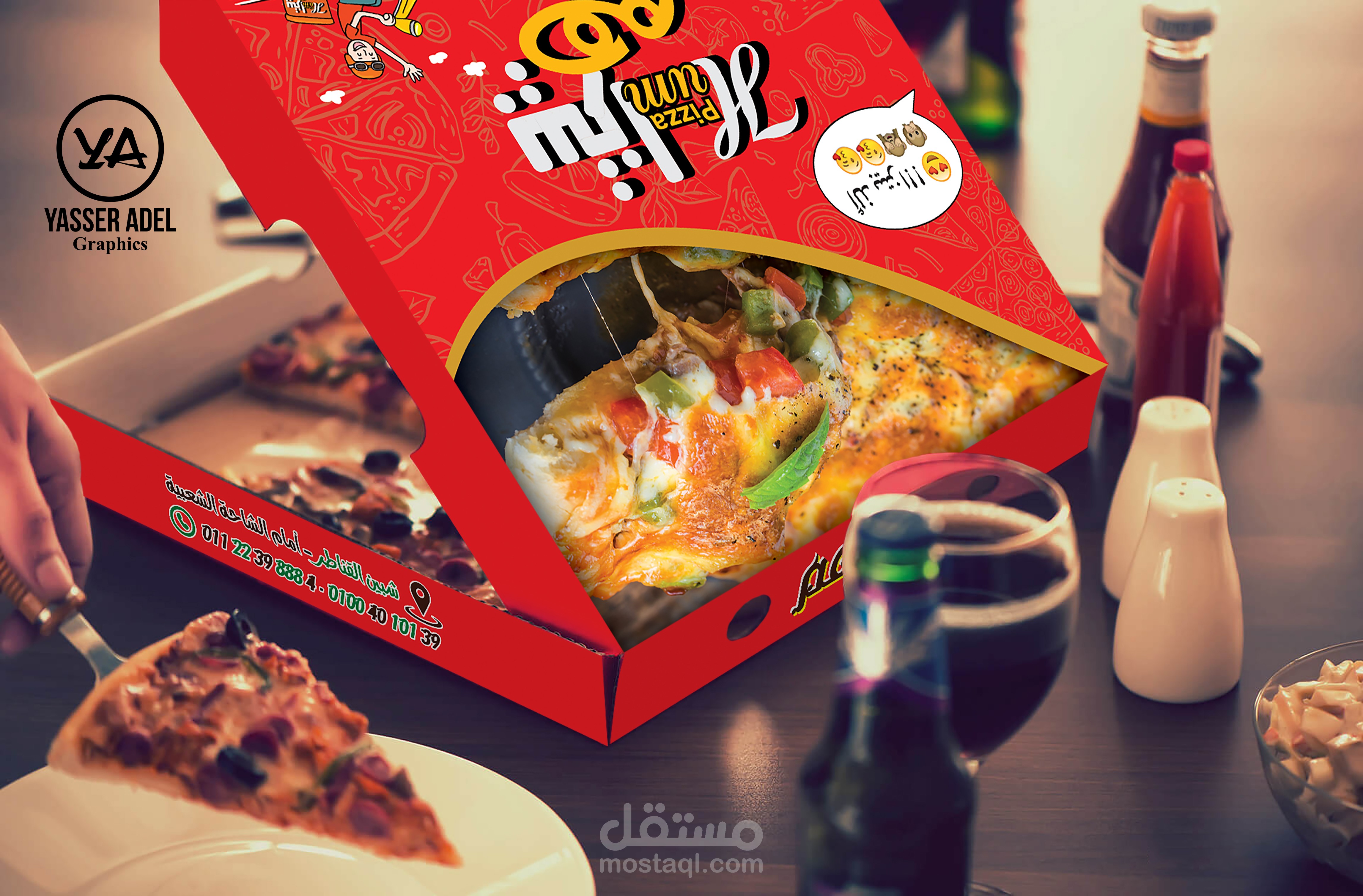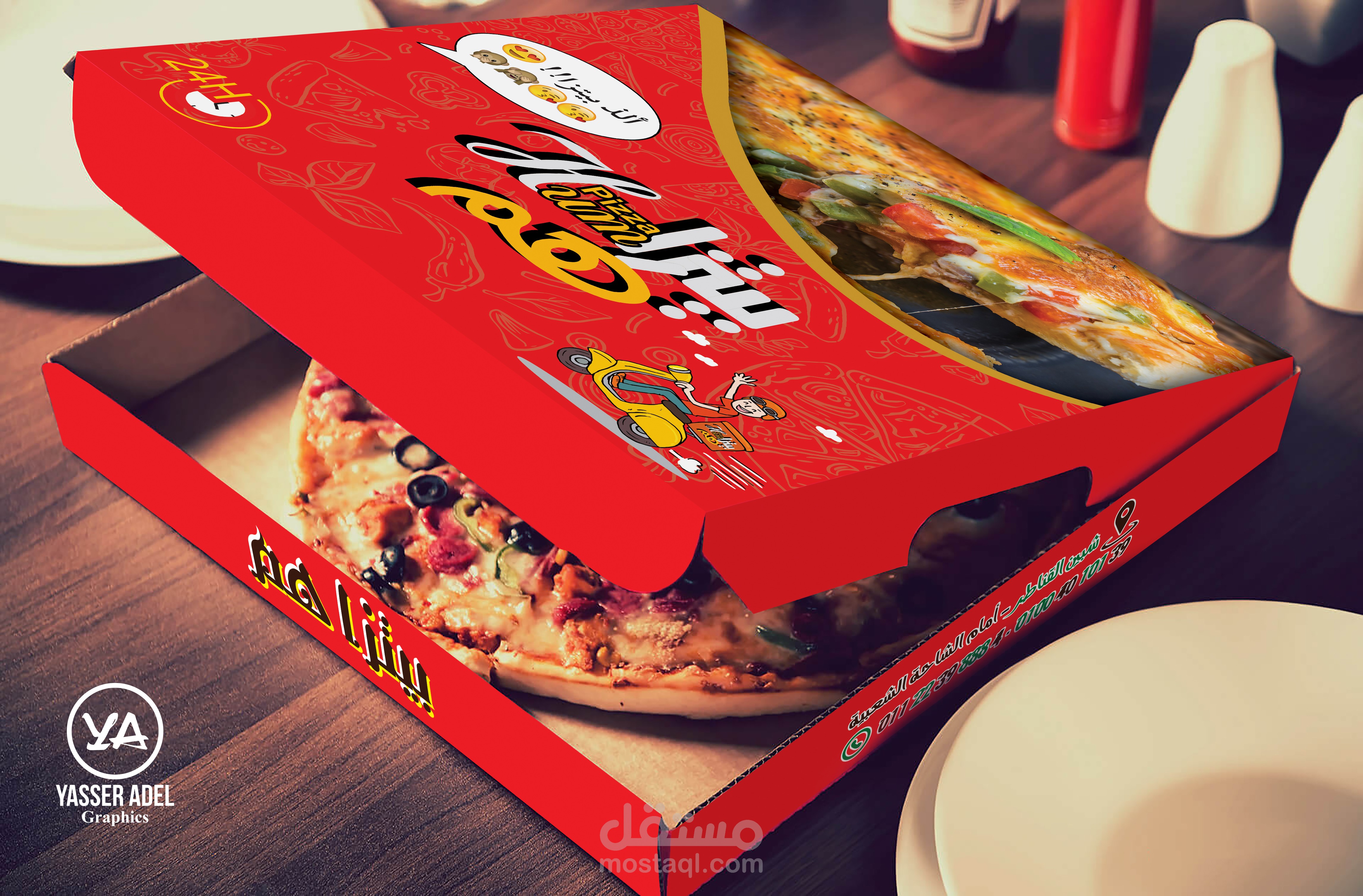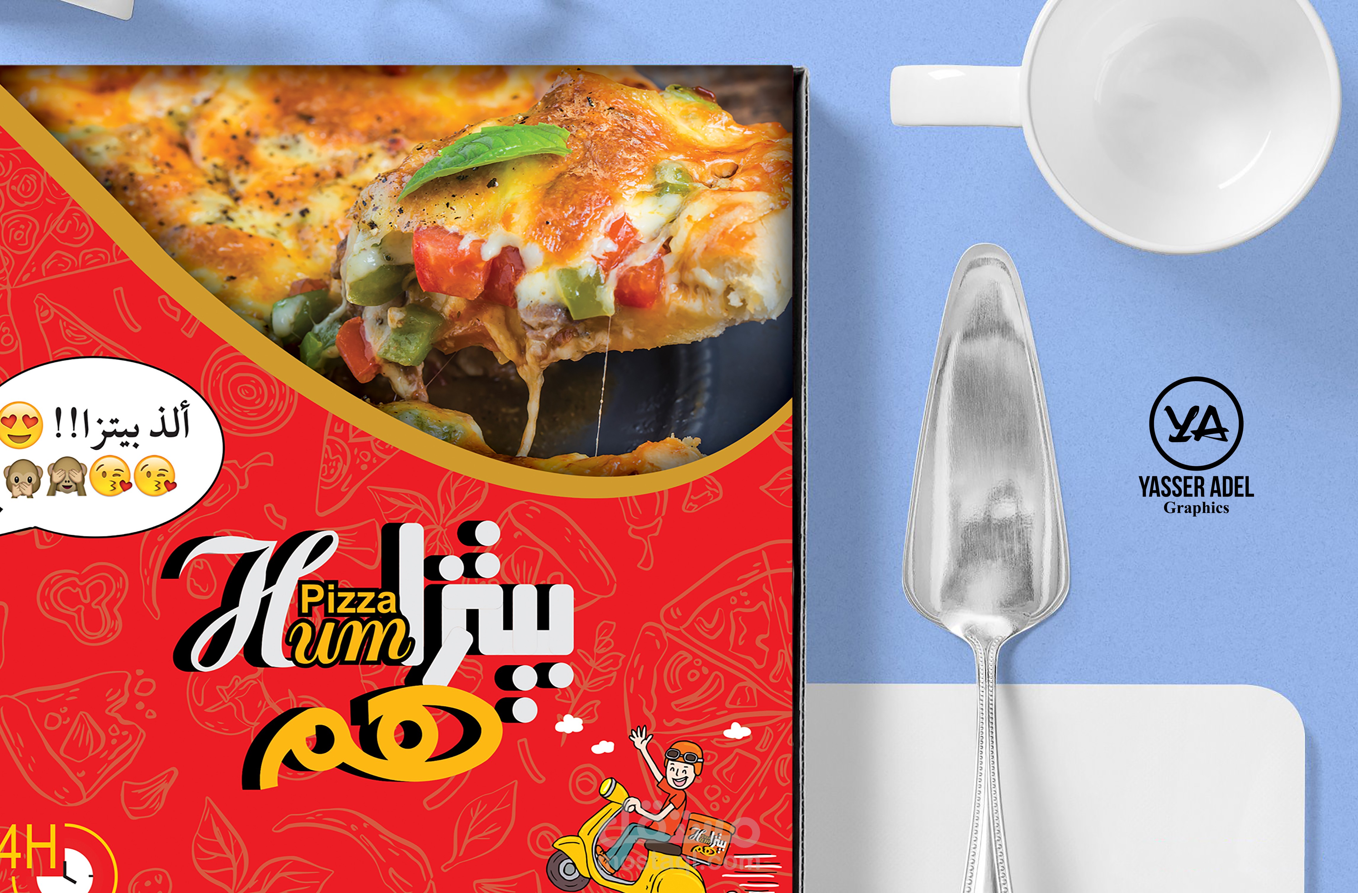 تصميم شعار و علبة بيتزا لمحل بيتزا هم للطباعة بعدة مقاسات