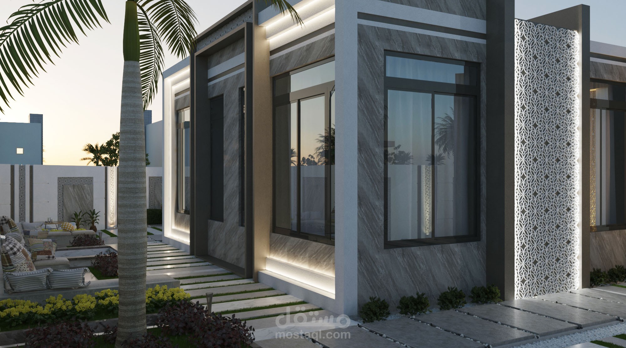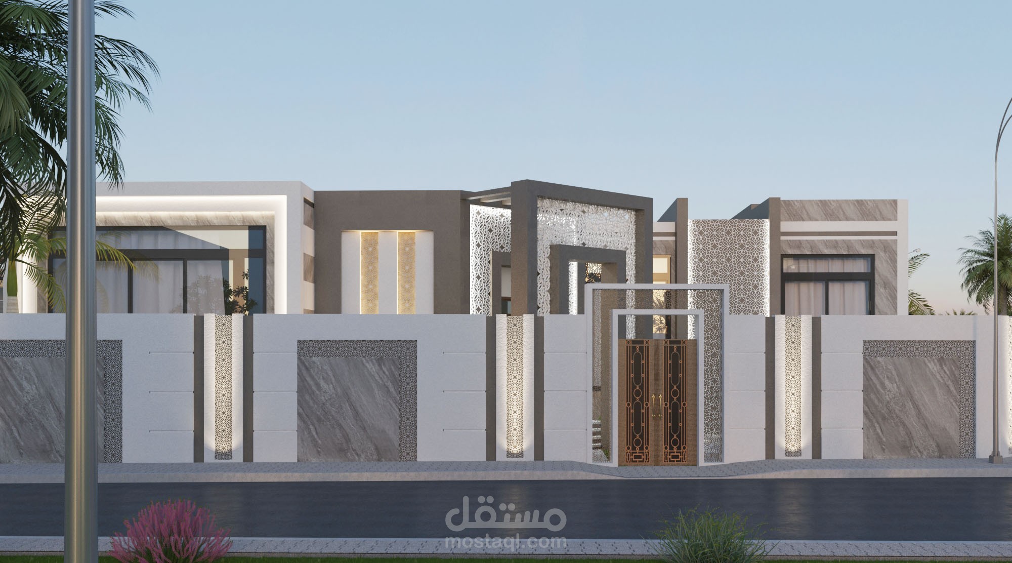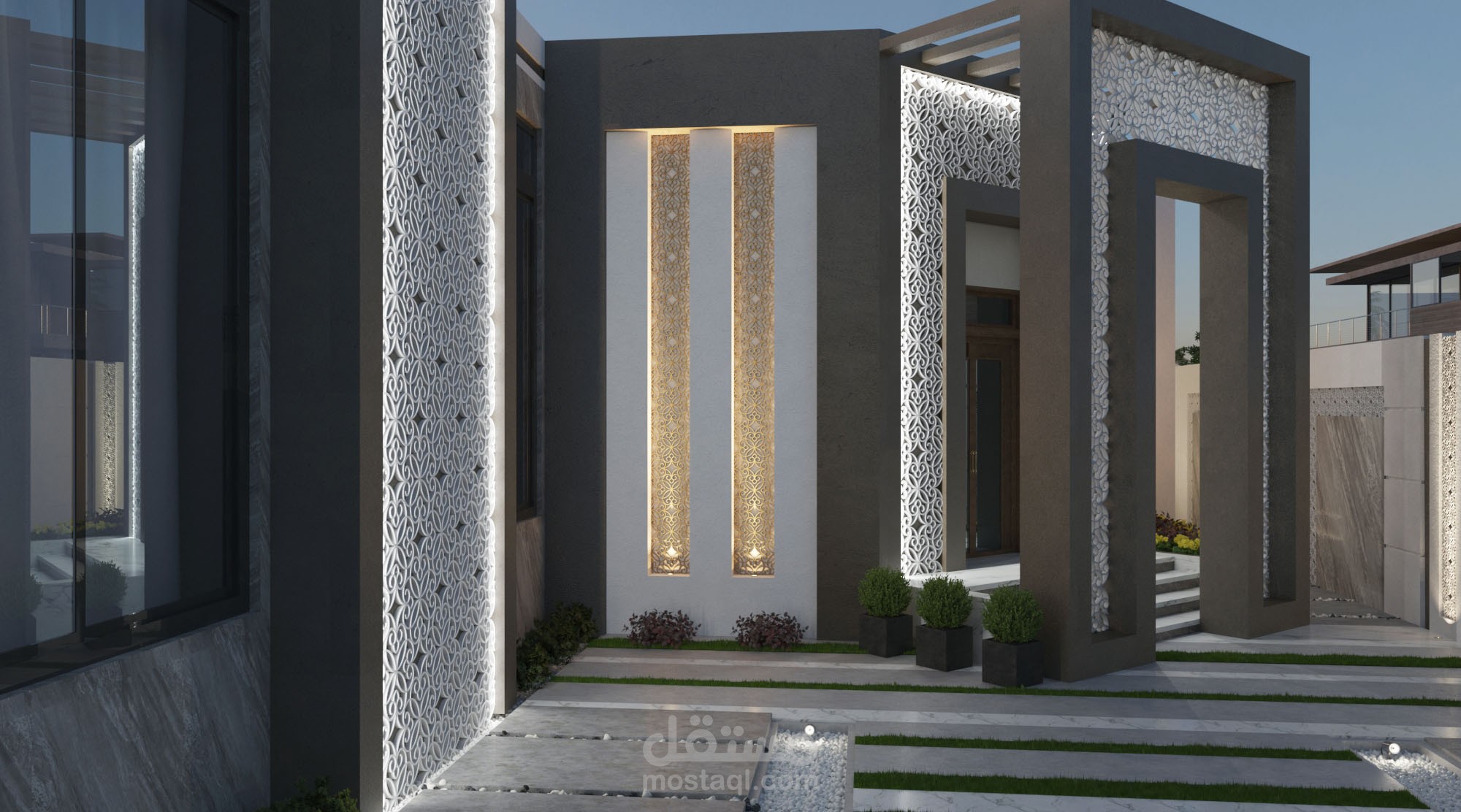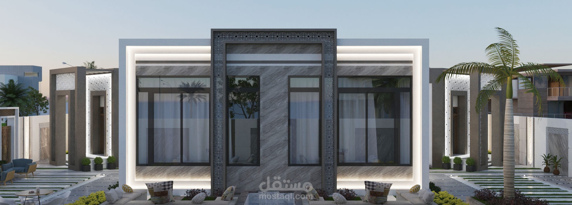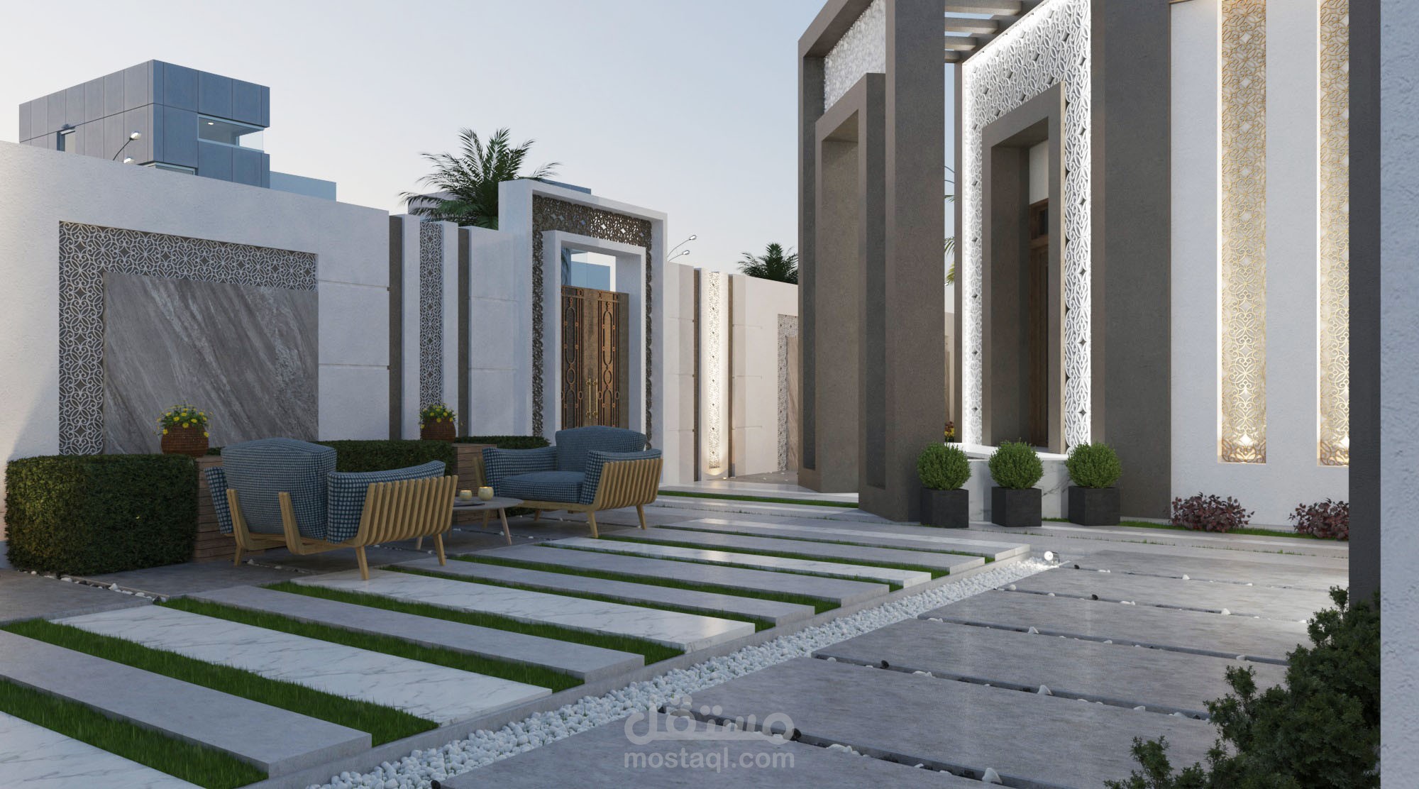 تصميم استراحة علي الطراز الاسلامي الحديث مع تصميم الحديقة والسور الخاص بالاستراحة