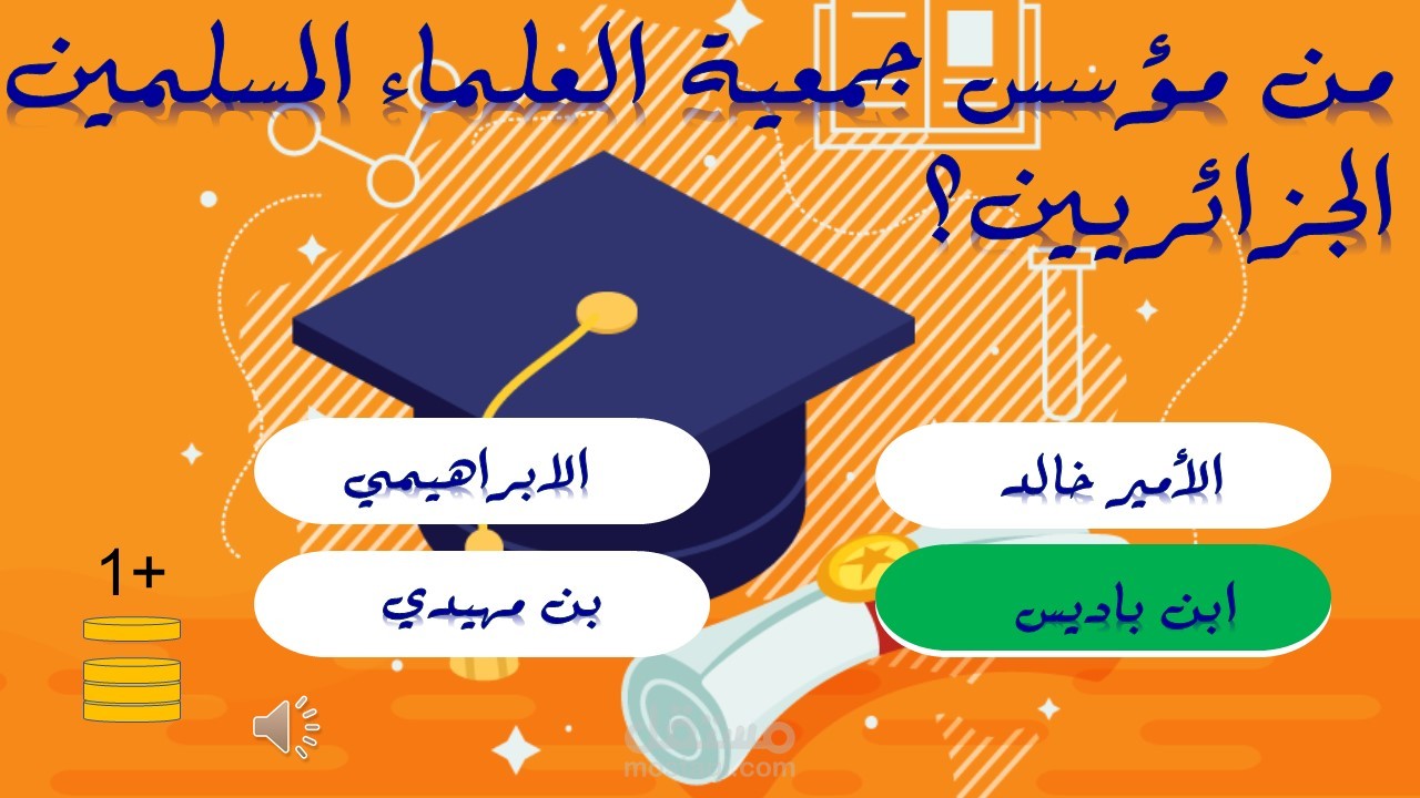 حيث كان موضوع العمل هو مسابقة يقوم من خلالها التلاميذ في الاخير باحتساب النقاط المجمعة لكل واحد منهم وتم تقديم العمل بصيغة ppsx و فيديو mp4 بحيث يمكن ترك 30 ثانية كوقت للتفكير قبل ظهور اجابة كل سؤال