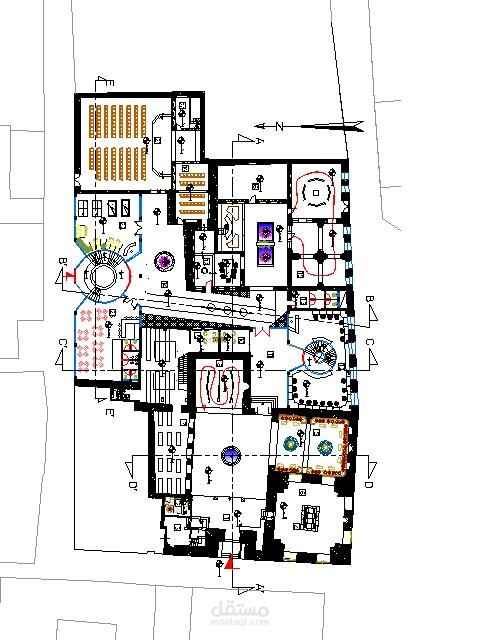 1- Preserving the identity of the covered courtyard such as lighting a natural light, in addition to connecting the roofing with the circular staircase through the decorative metal troughs to supply the project in a common spirit.