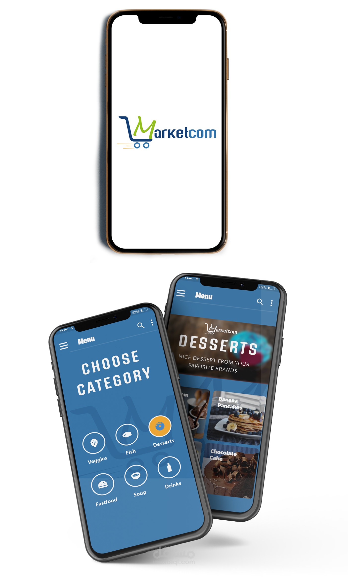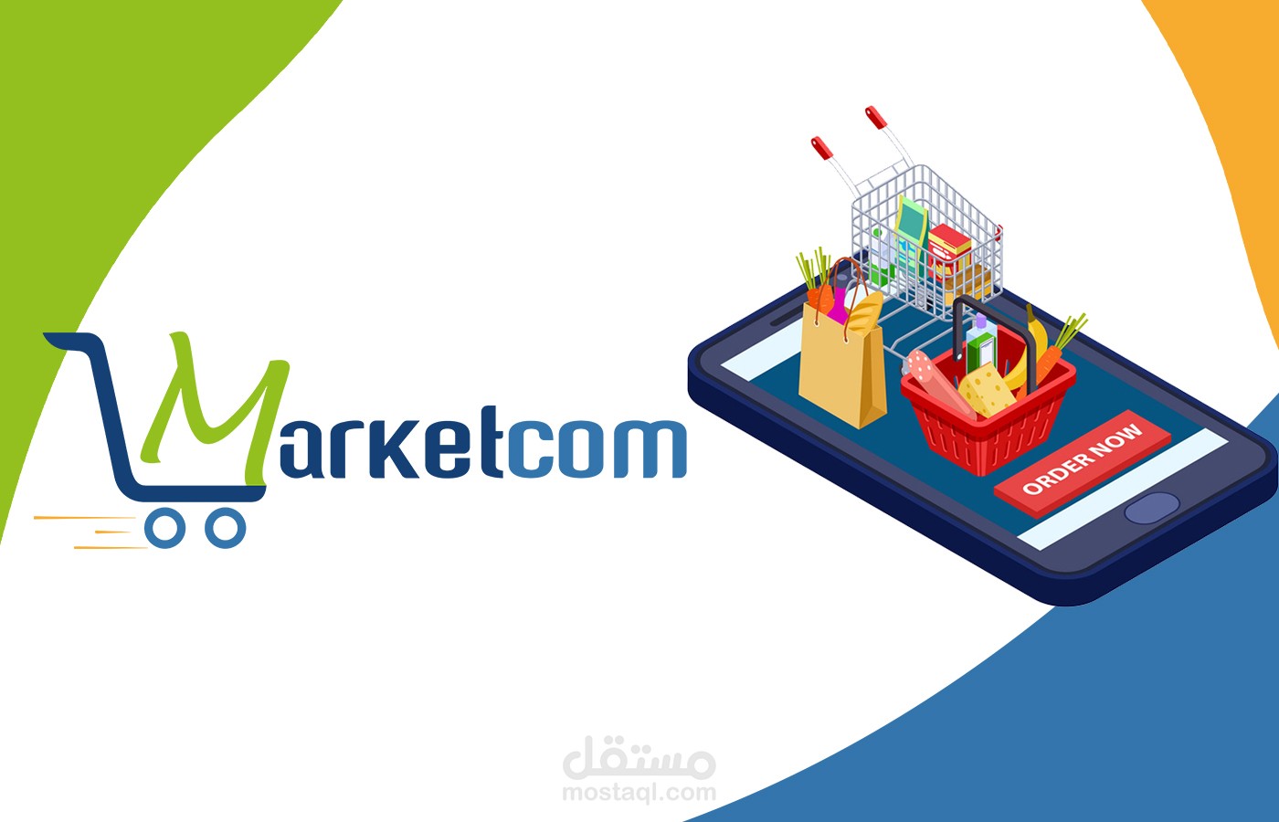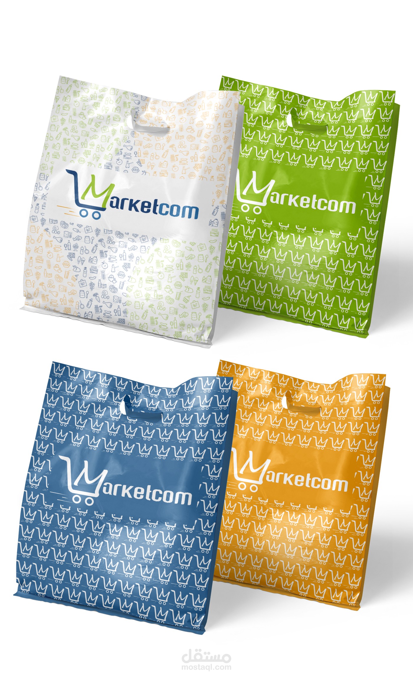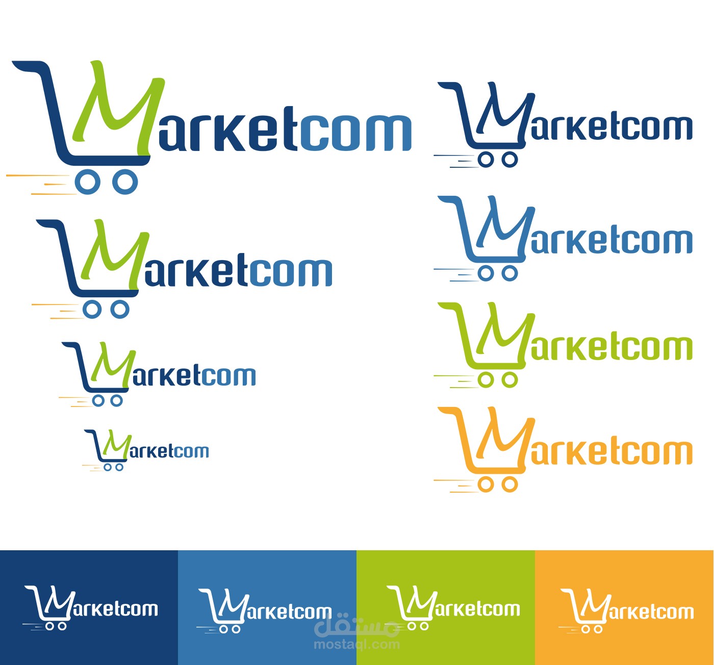 This Logo is designed for Marketcom, an online grocery shopping mobile app that operates in Kuwait. I used green and blue and yellow as the color palette of this brand to show that they sell natural products. For the icon, I illustrated a shopping cart with the letter "M" as the basket