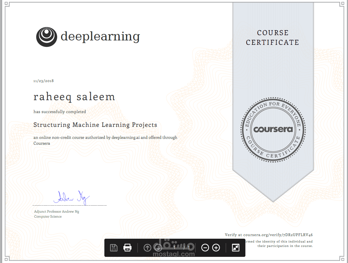 انهاء مجموعة من كورسات التعلم العميق على كورسيرا بلغة البايثون