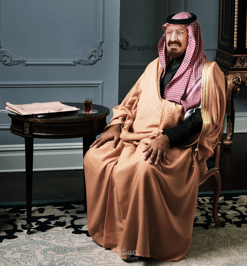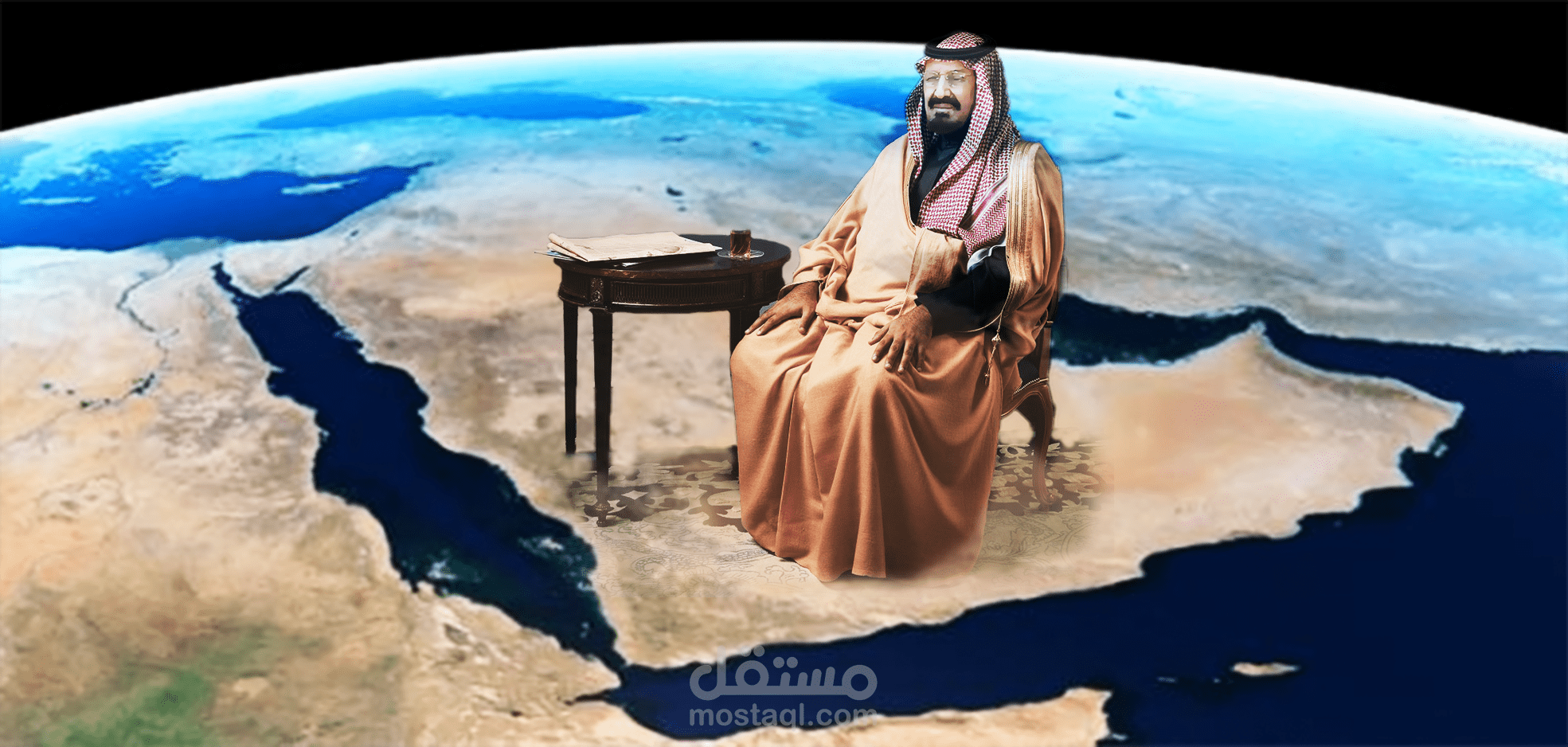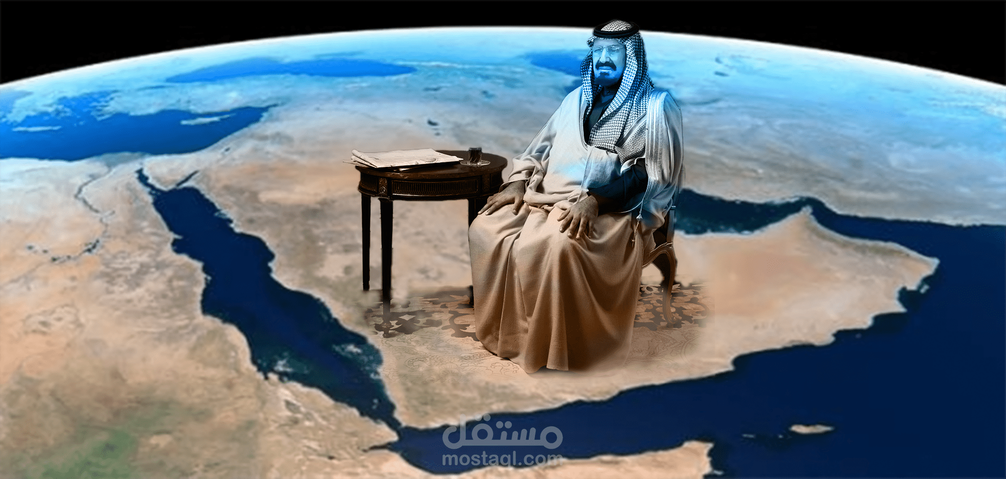 قمت بعمل تصميم بالفوتوشوب لصورة الملك عبد العزيز انطلاقا من صورة الامير محمد بن سلمان و صورة للجزيرة العربية.
