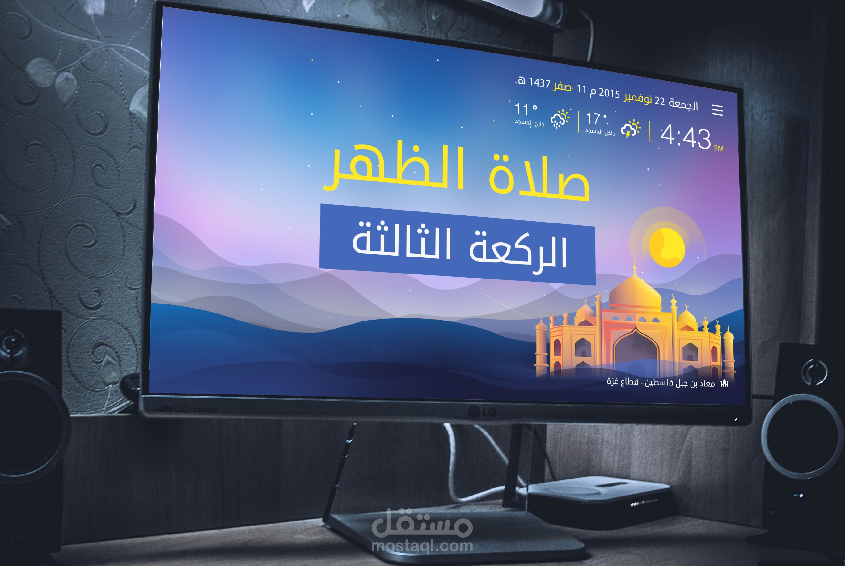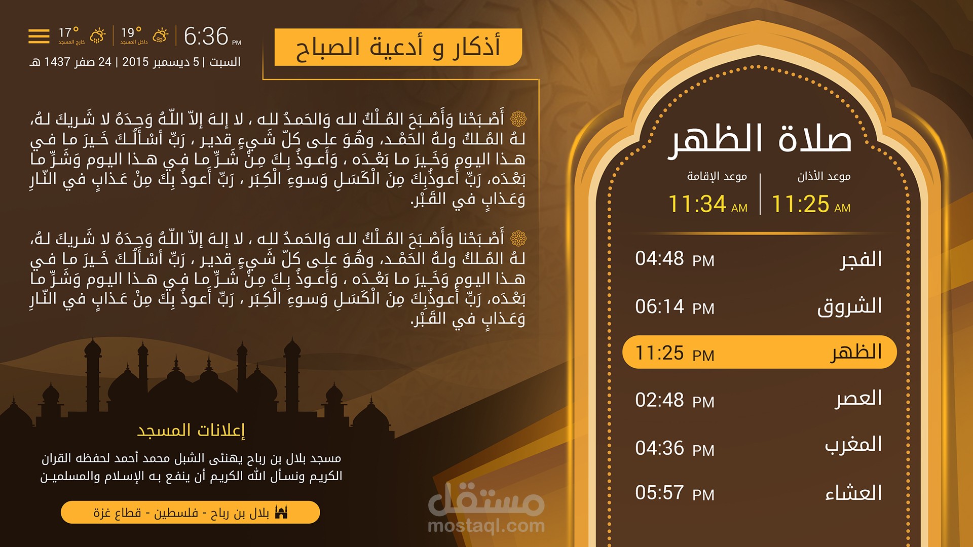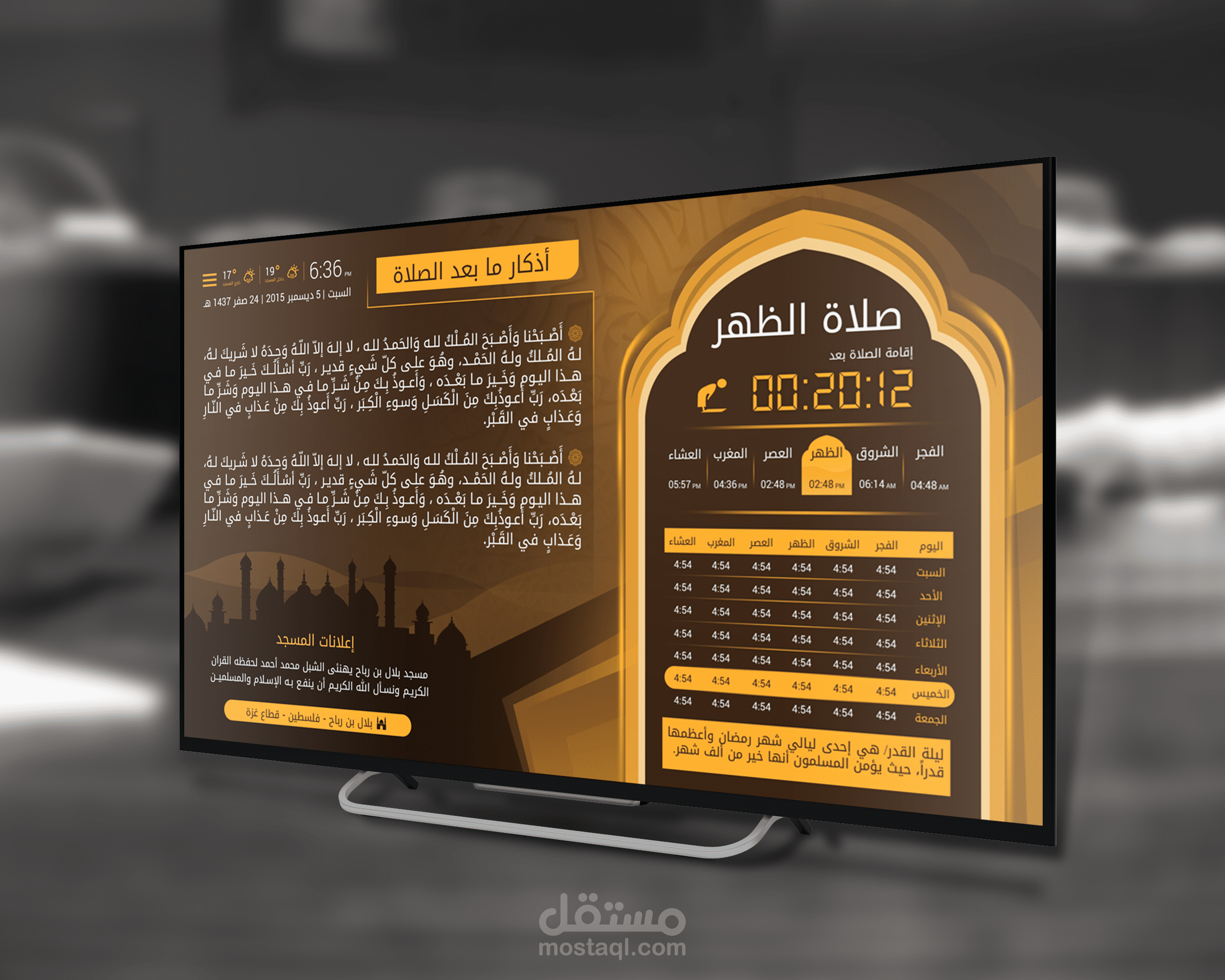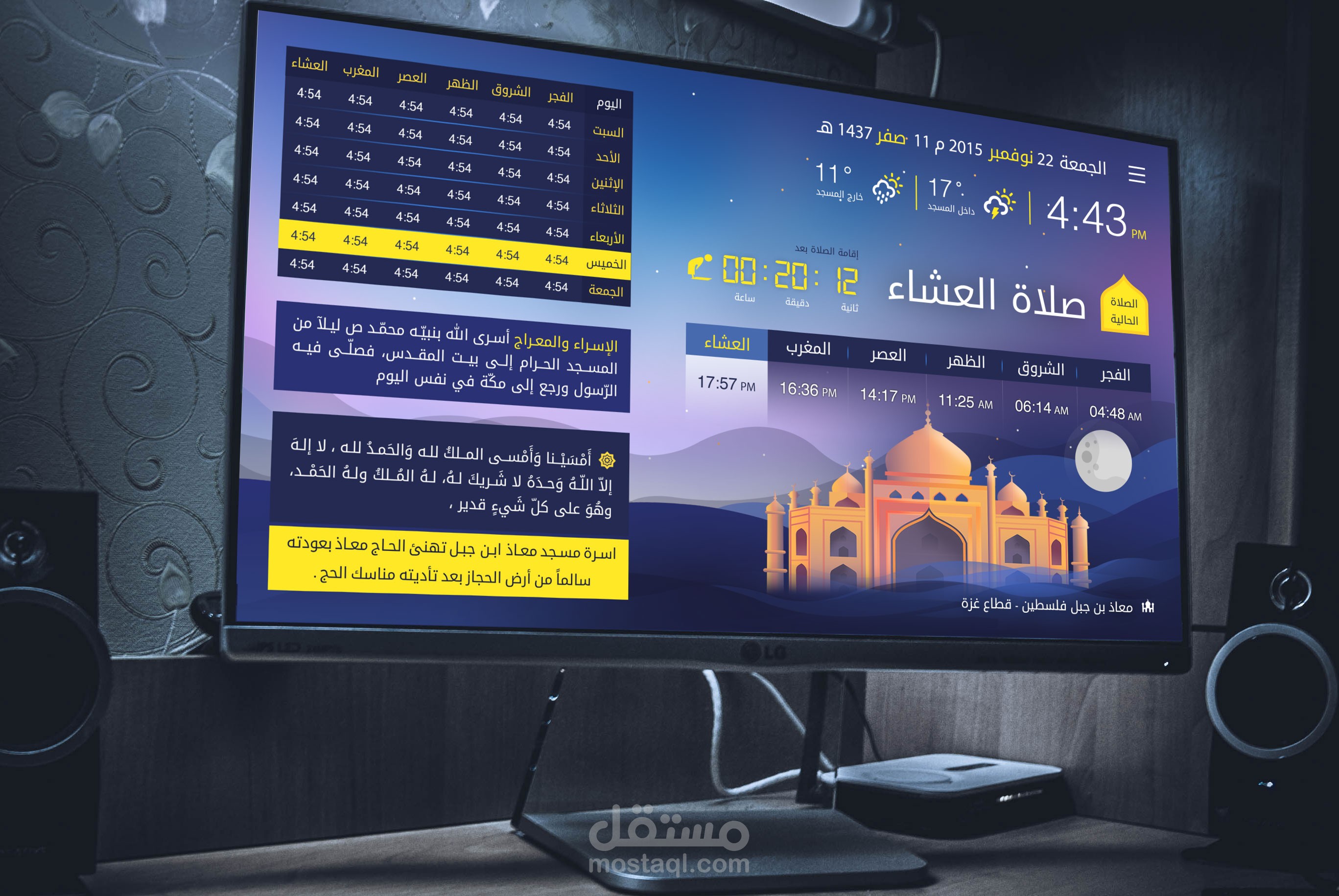 4. اظهار مادة إعلانية من خلال شريط اعلاني (أخبار، الأنشطة، اعلانات، الخ) بالإضافة الى موعد الاذان والإقامة للصلاة التالية، بخط كبير.