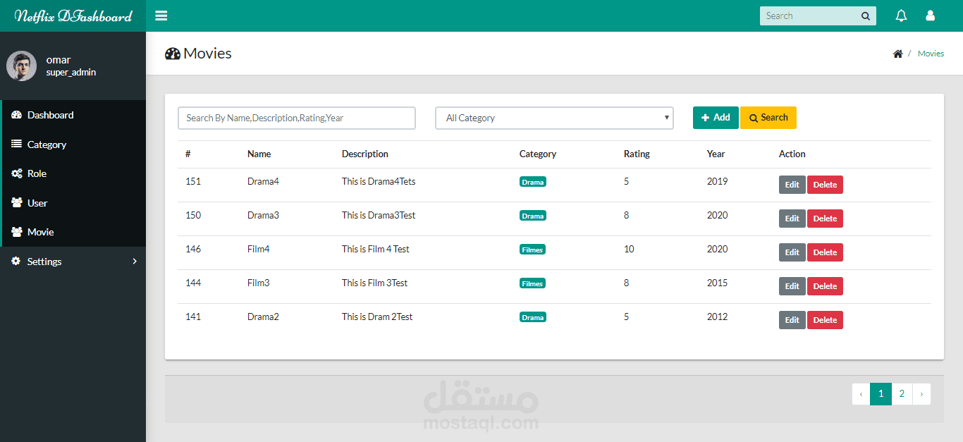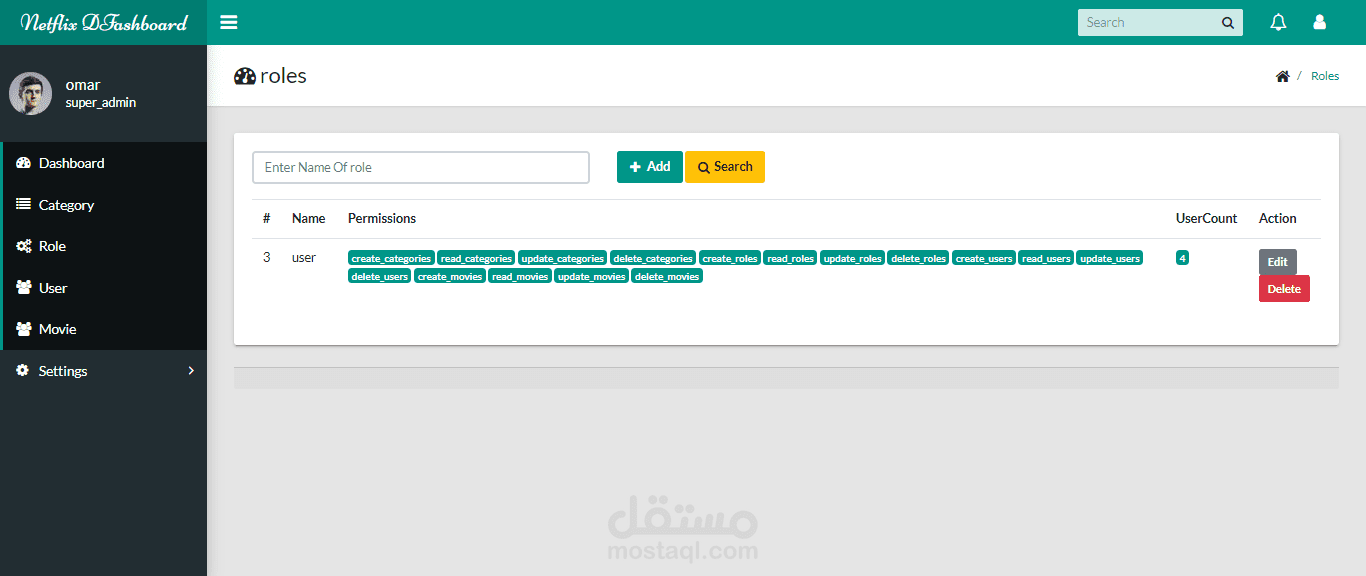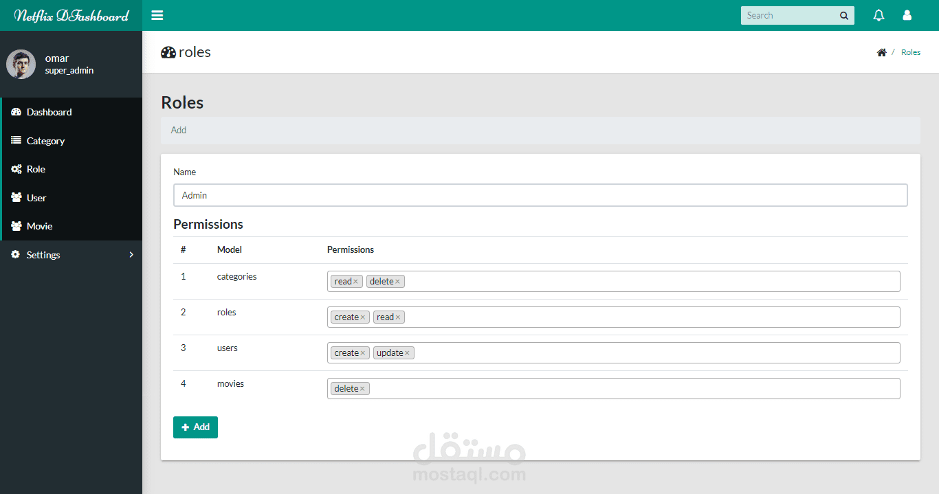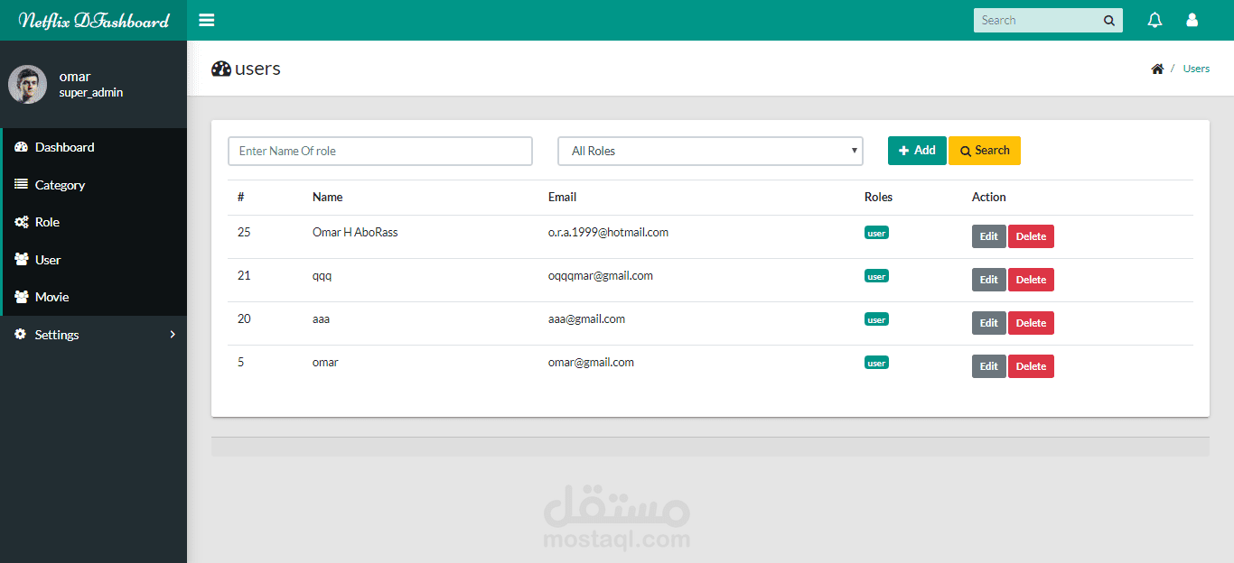 NetFlix Back side هو موقع ويب يسمح للمسؤولين بإضافة المستخدمين وتحريرهم وحذفهم ، كما أنه يسمح بإضافة أقسام ومقاطع فيديو في كل قسم وإدخالها في تشكيلات مختلفة ويسمح أيضًا بإضافة قواعد لكل مشرف ومستخدم