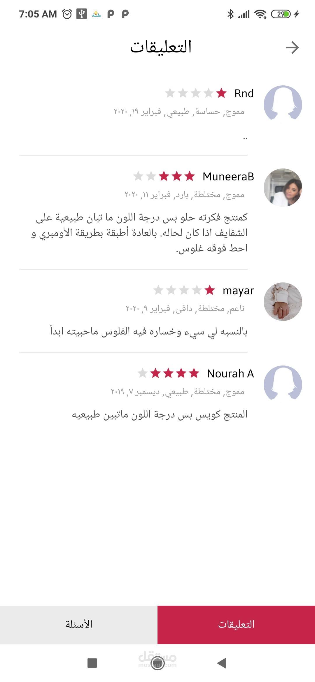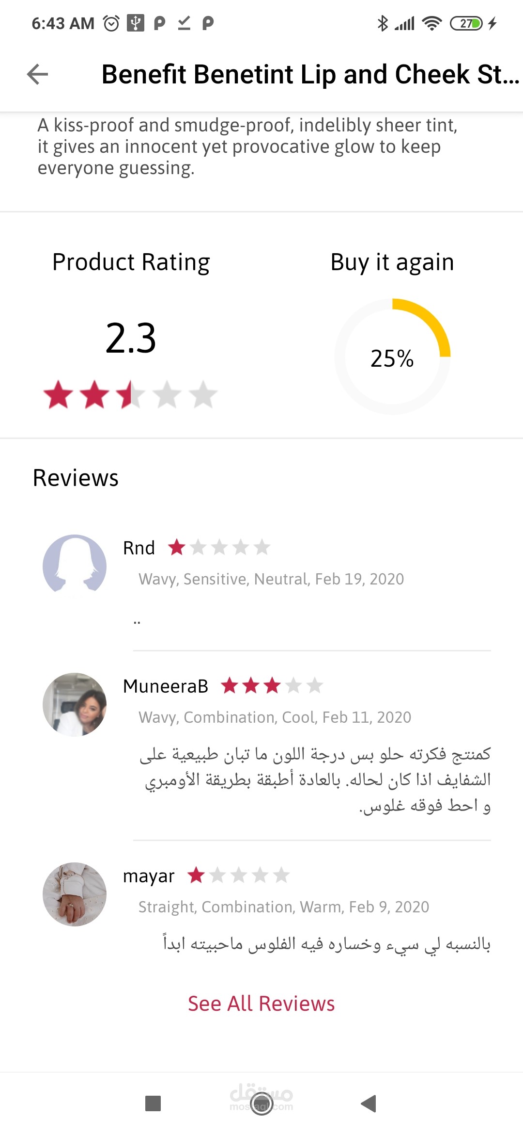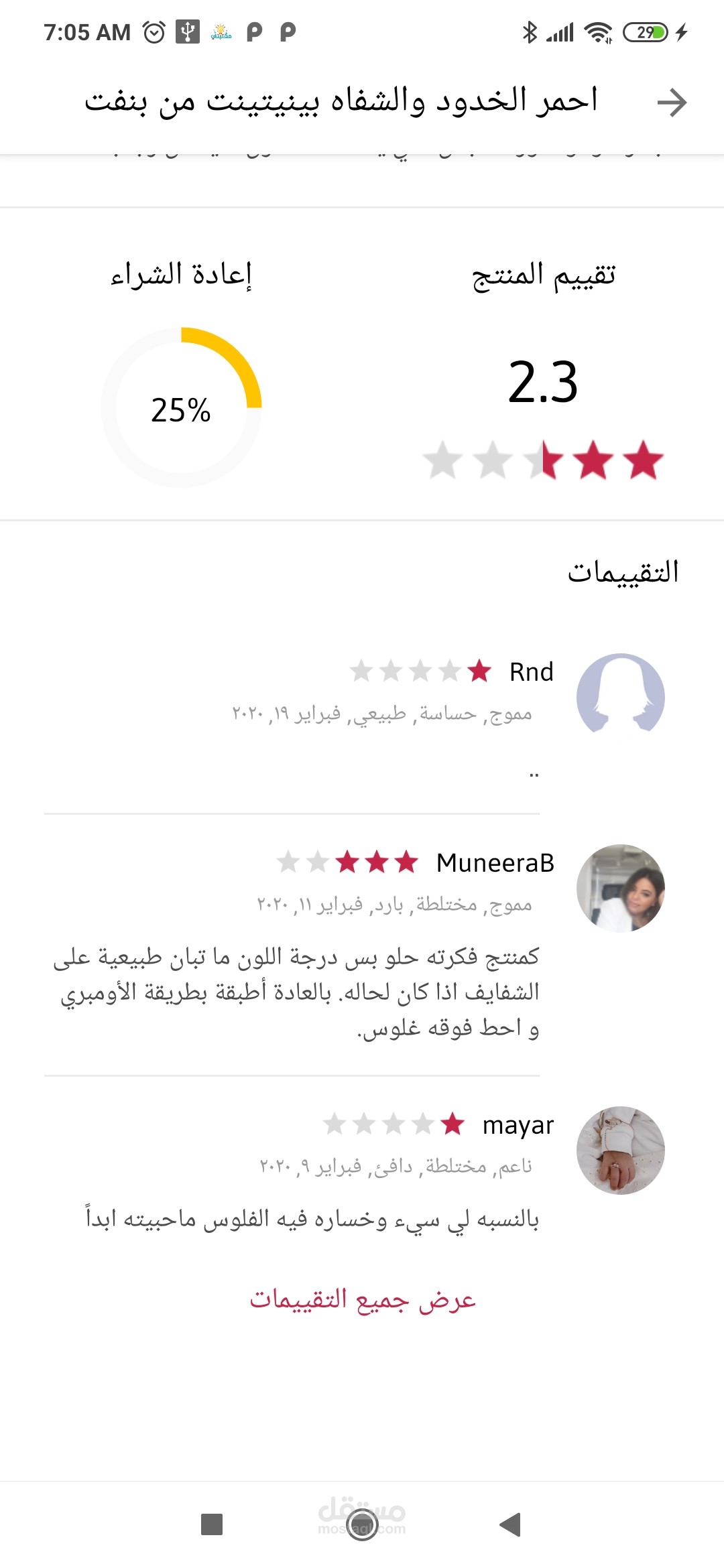 تطبيق بعرض منتجات الميك أب والعناية بالجسم ويستطيع المستخدم إضافة تقييم على المنتج بناء على تجربة للمنتج وإضافة سؤال للإستفسار عن المنتج