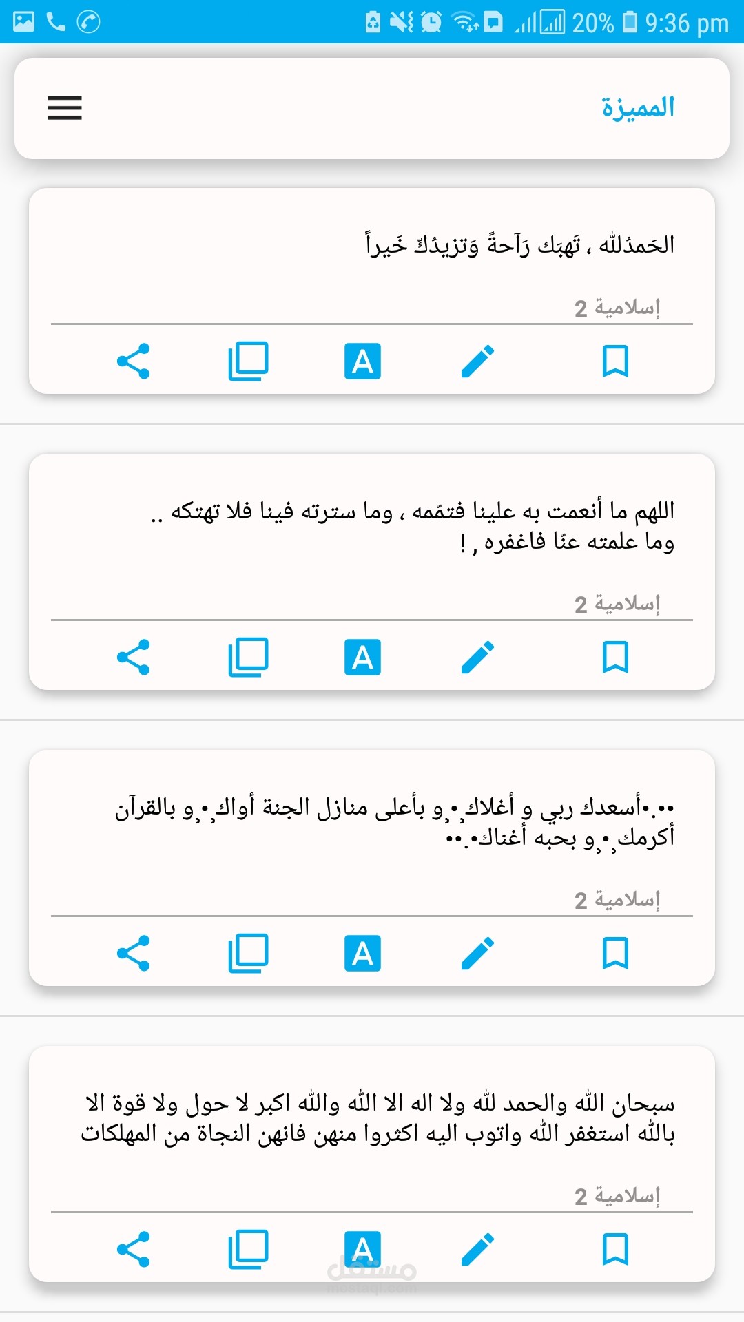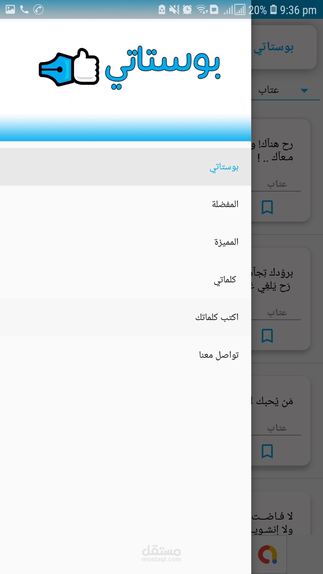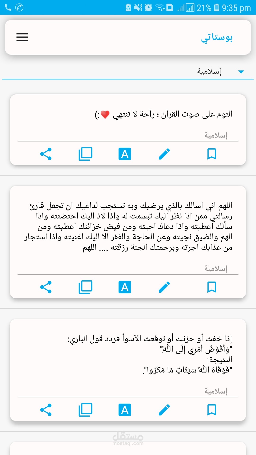 تطبيق Myposts ، يعرض مجموعة كبيرة ومتنوعة من الجمل والرسائل والحالات ، باللغة العربية فقط ، يمكن تعديله على المنشور (إضافة أو حذف) ، يمكن تعيين لون الخلفية للمنشور ، ويمكن إضافة بعض الزخارف بين الكلمات ، يوفر التطبيق القدرة على مشاركة المنشور مع تطبيقات الشبكات الاجتماعية ، كما يوفر واجهة خاصة للرسائل التي يكتبها أنتا ويحفظها داخل التطبيق ، وما يقع عليه يتم على رسائل أخرى ، وهناك واجهة خاصة لإحصائيات المشاركة المفضلة ، وكذلك مميزة.